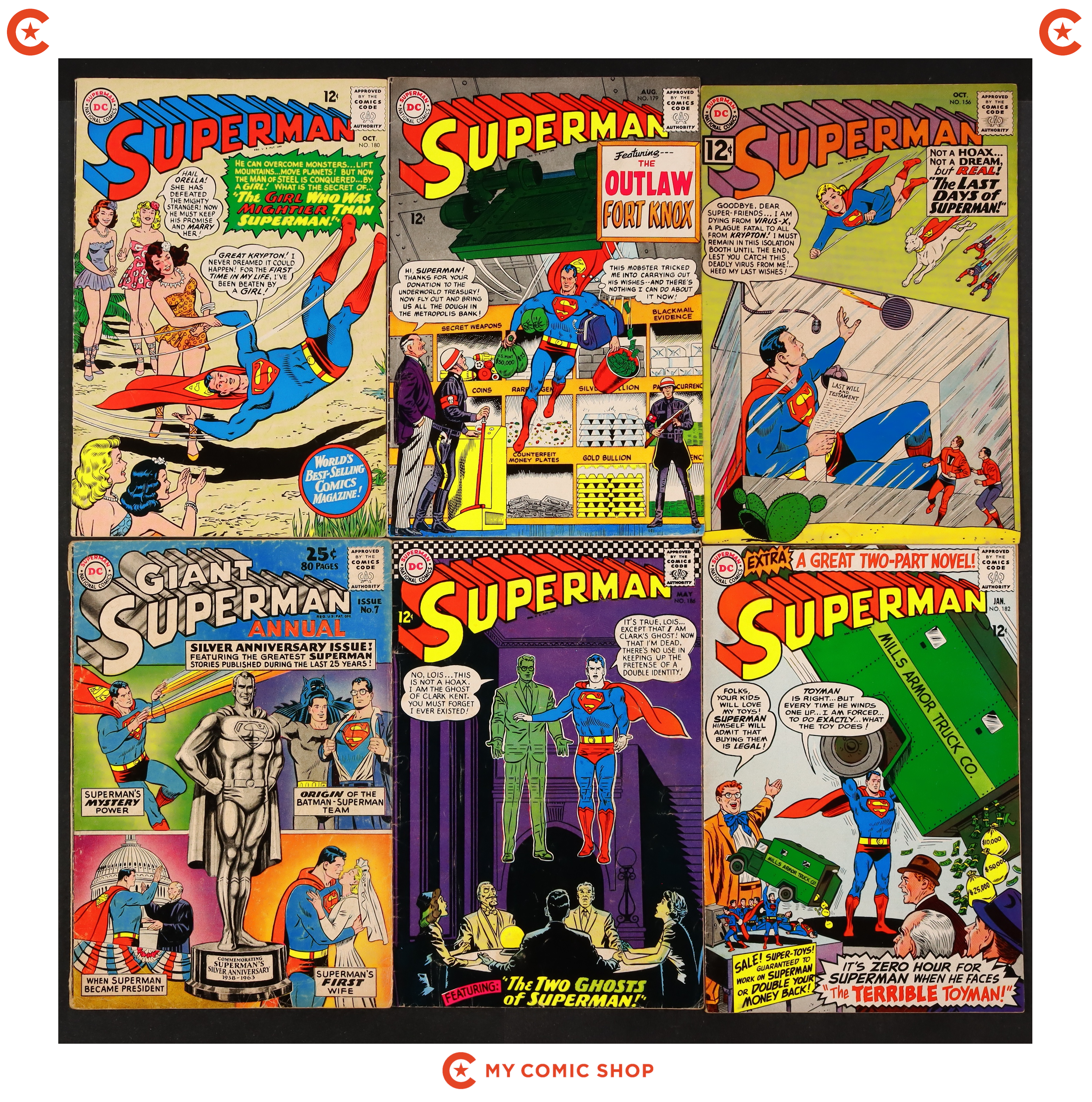 Issues 156, 179, 180, 182, 186, and Annual 7 of Superman (1939 1st Series). Most will grade in the GD to VG range.