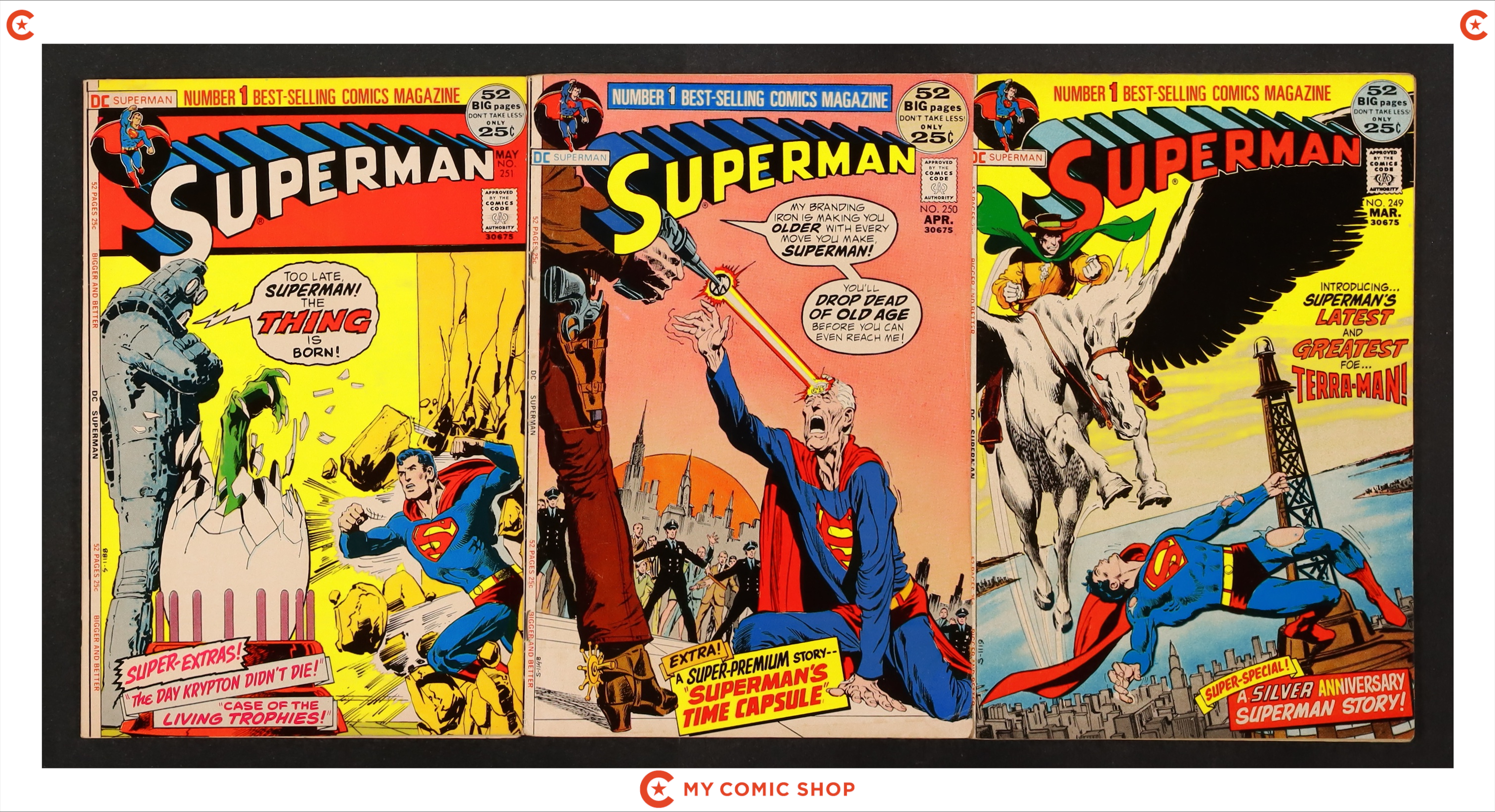 Starts Apr 20 Cover pencils by Neal Adams, inks by Dick Giordano. The Starry-Eyed Siren of Space! starring Superman, Kond, and Rija, script by Cary Bates, pencils by Curt Swan, inks by Murphy Anderson. The Death-Trails of Krypton!--The Fabulous World of Krypton, script by Cary Bates, pencils by Bob Brown, inks by Murphy Anderson. Reprinted covers of Superman #1, Superboy #1, Jimmy Olsen #1, Lois Lane #1. The Battle of the Atoms! starring Superman, script by Don Cameron, pencils by Sam Citron. 36 Pages, Full Color. Cover price $0.25.