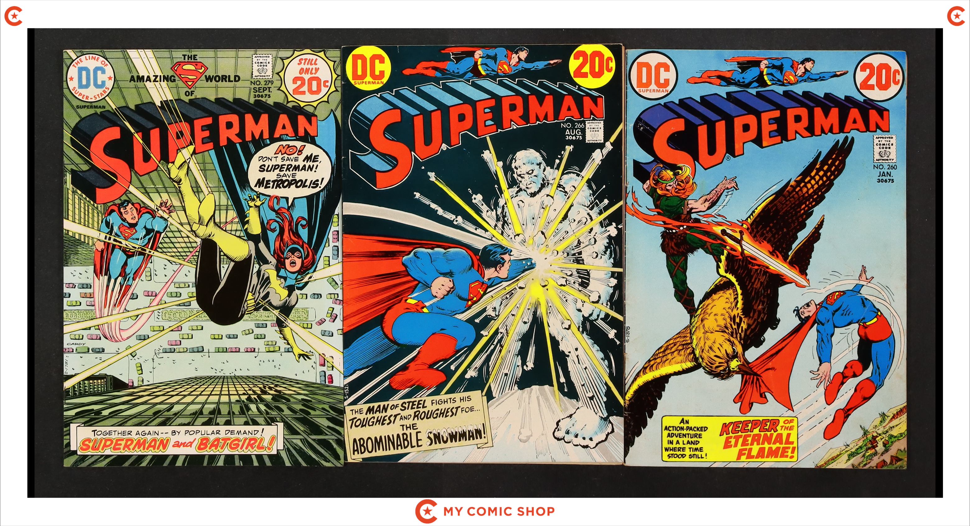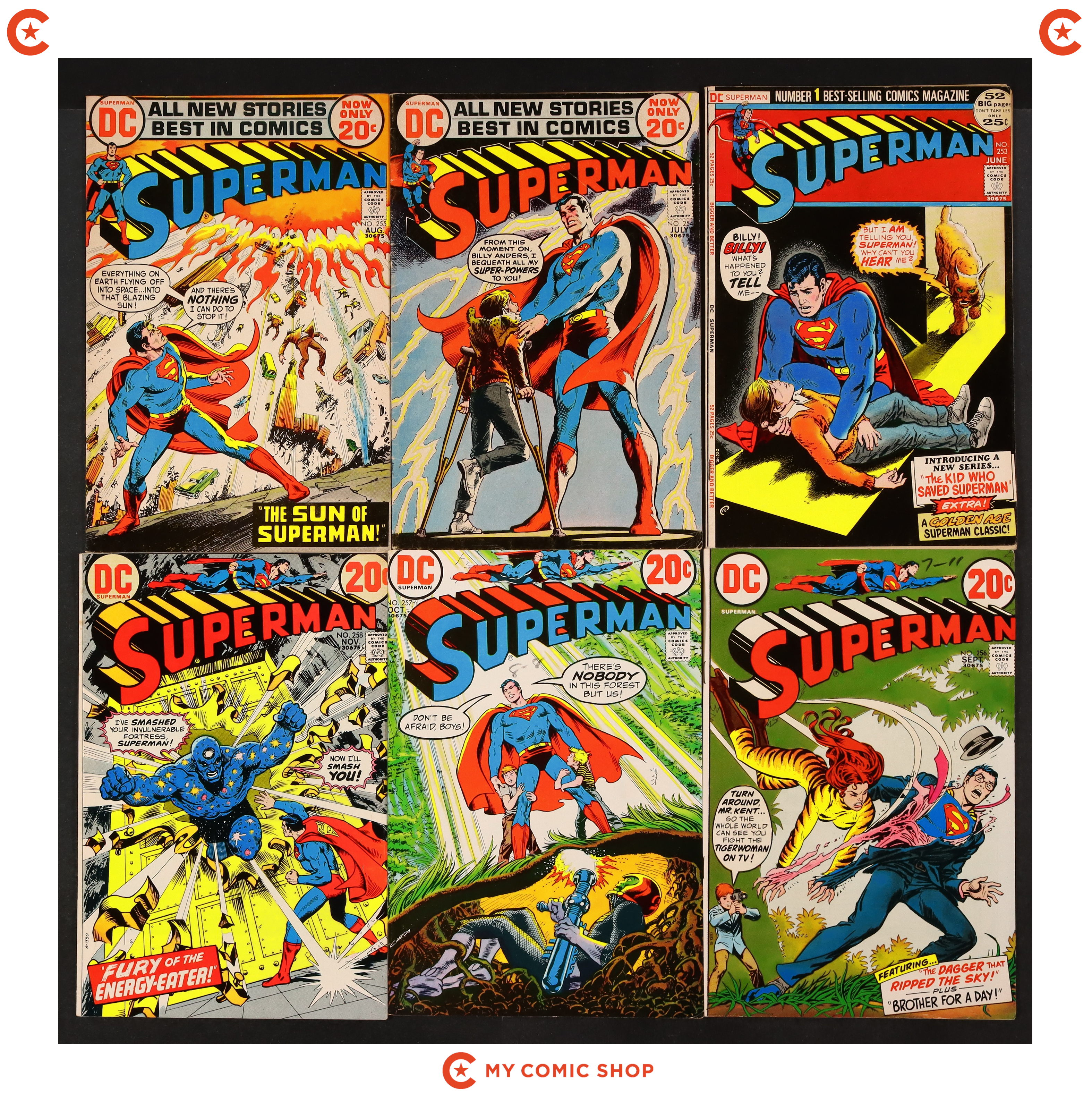 Issues 253-258, 260, 266, and 279 of Superman (1939 1st Series). Most will grade in the VG to FN range with #279 grading VF.