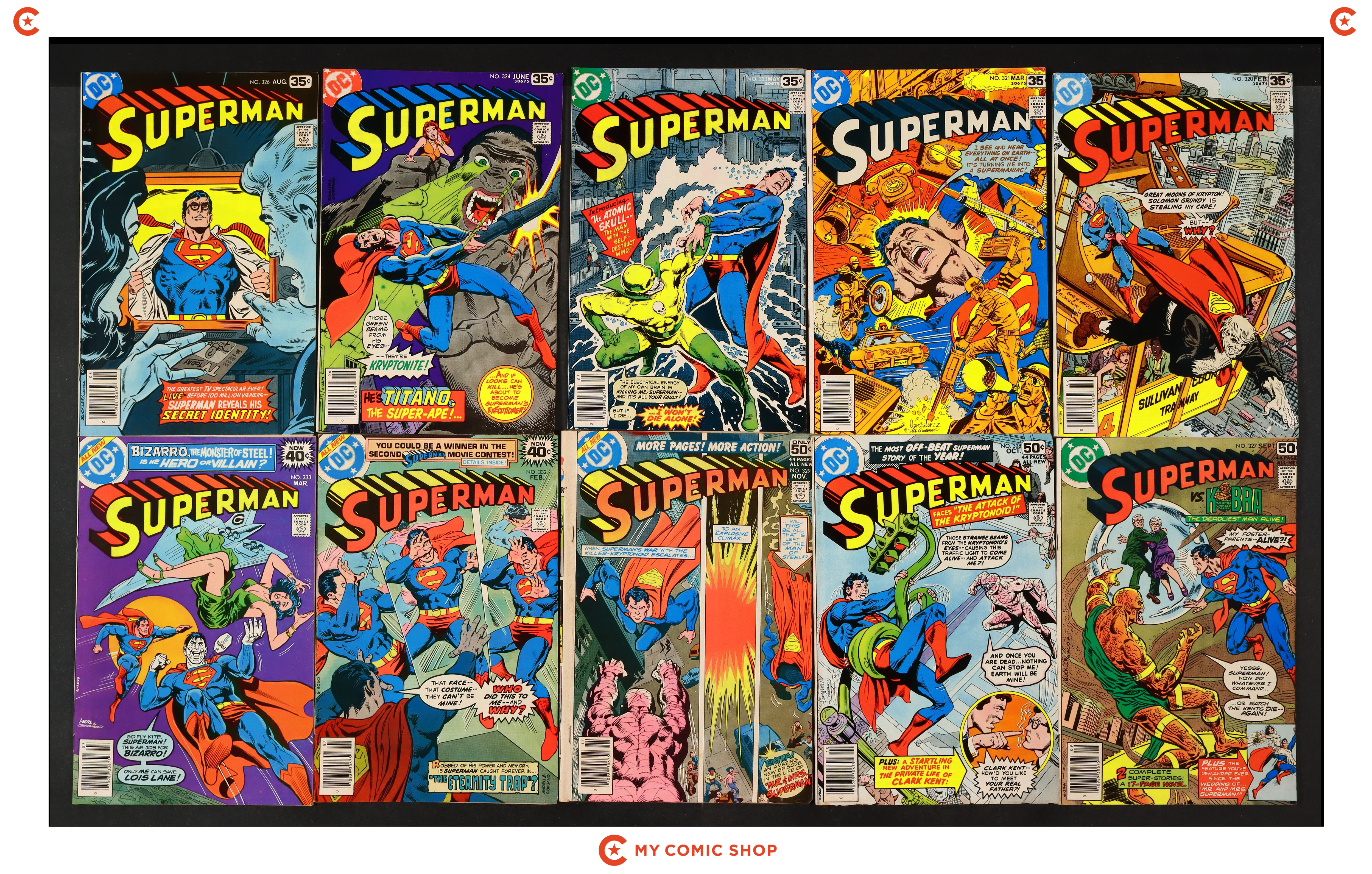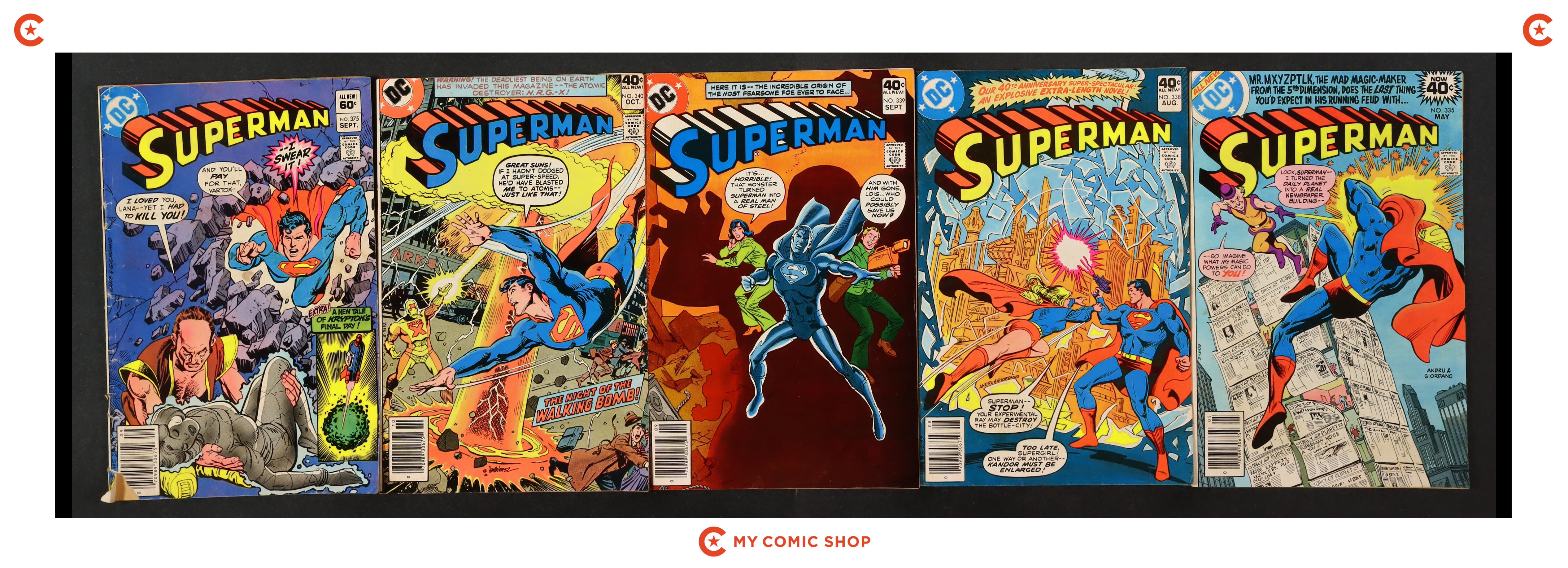Issues 320, 321, 323, 324, 326, 327, 328, 329, 332, 333, 335, 338, 339, 340 and 375 of Superman (1939 1st Series). Most will grade in the GD to VG range with #333, and #338 grading FN.