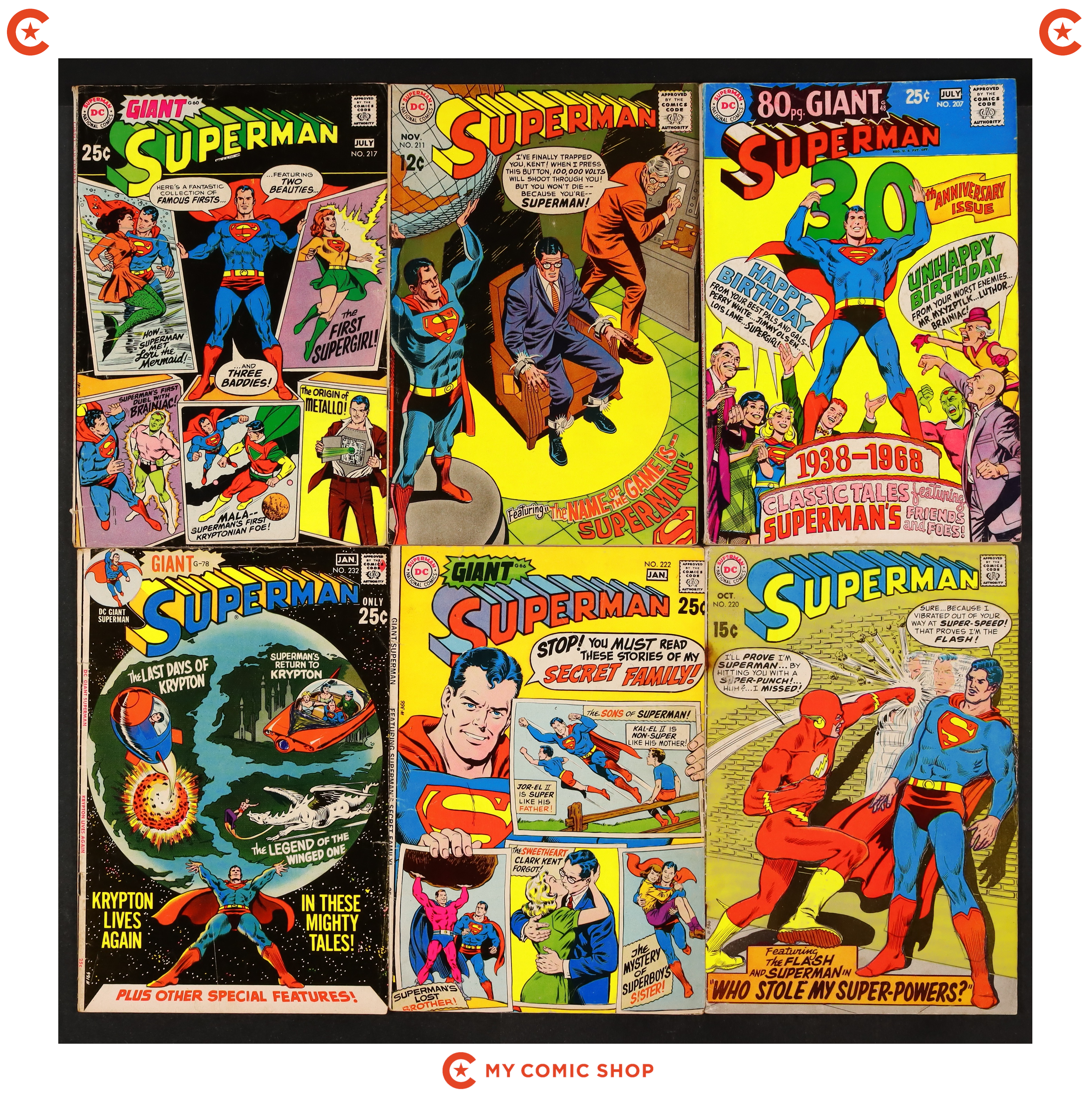 Issues 207, 211, 217, 220, 222, and 232 of Superman (1939 1st Series). Most will grade in the GD to VG range with #232 grading PR (misprint, one story duplicated).