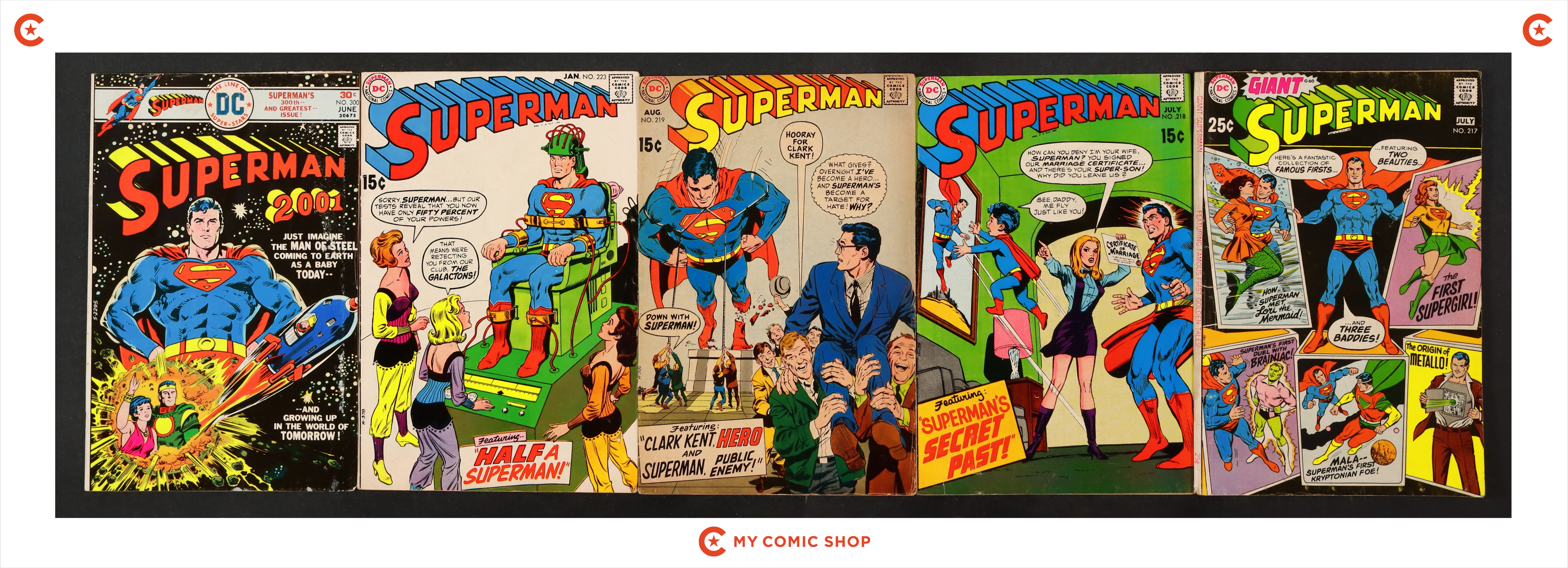 Issues 217, 218, 219, 223, and 300 of Superman (1939 1st Series). Most will grade in the GD to VG range.