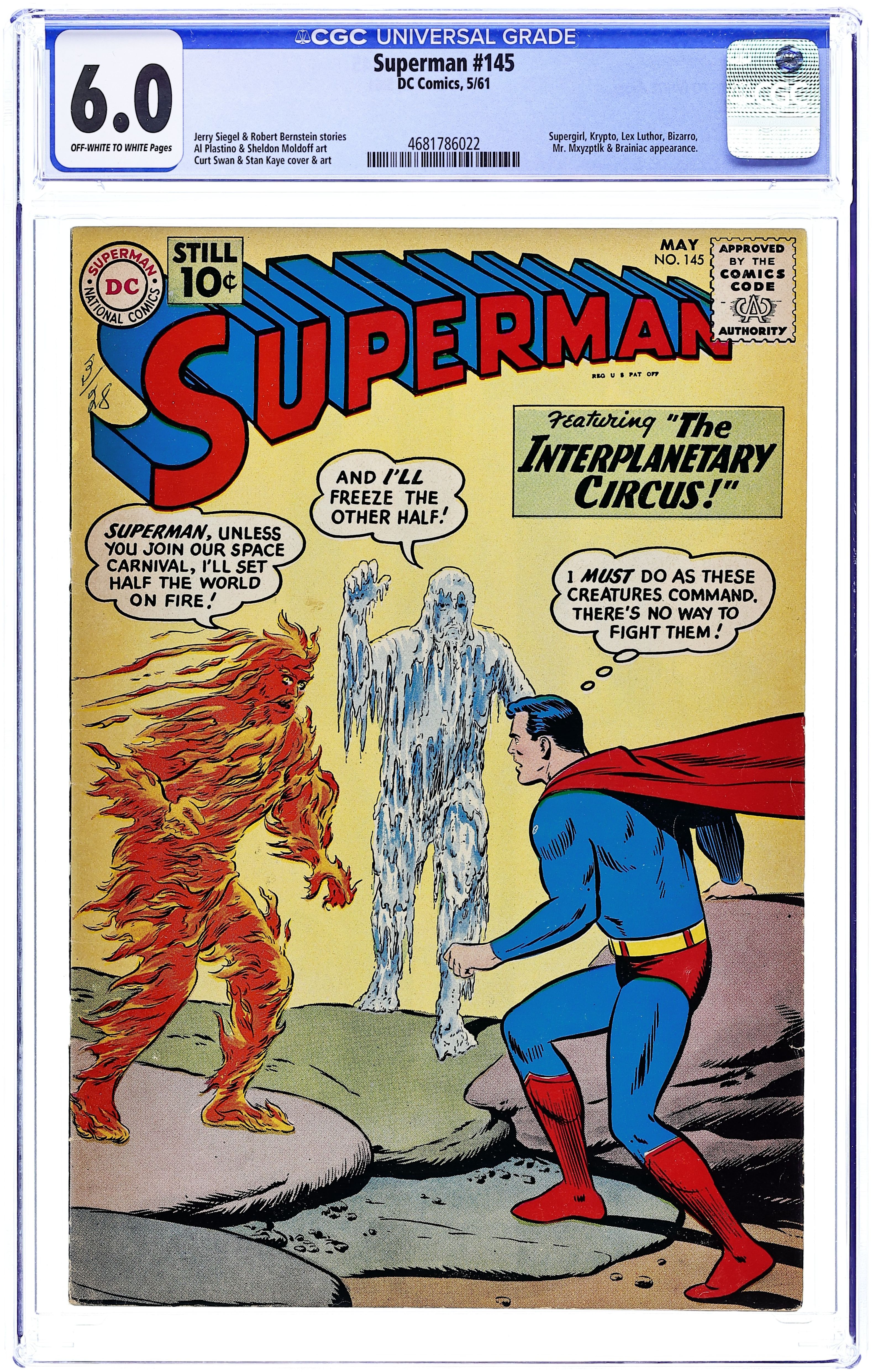 Starts Apr 4 7th appearance of of the Legion of Super-Heroes and 1st appearances of the Legion of Super-Villains and the Adult Legion. Cover pencils by Curt Swan, inks by Sheldon Moldoff. The Great Mento!, art by Al Plastino; Perry White fakes ESP powers as The Great Mento (with Superman's help) to capture wanted criminals. Krypto Battles Titano!, art by Al Plastino; Krypto travels into the prehistoric past to meet Titano. The Legion of Super-Villains!, script by Jerry Siegel, pencils by Curt Swan, inks by Sheldon Moldoff; Luthor contacts and teams up with Legion of Super-Villains from 30th Century; adult Legion of Super-Heroes comes to 20th Century to help Superman. 36 Pages, Full Color. Cover price $0.10.