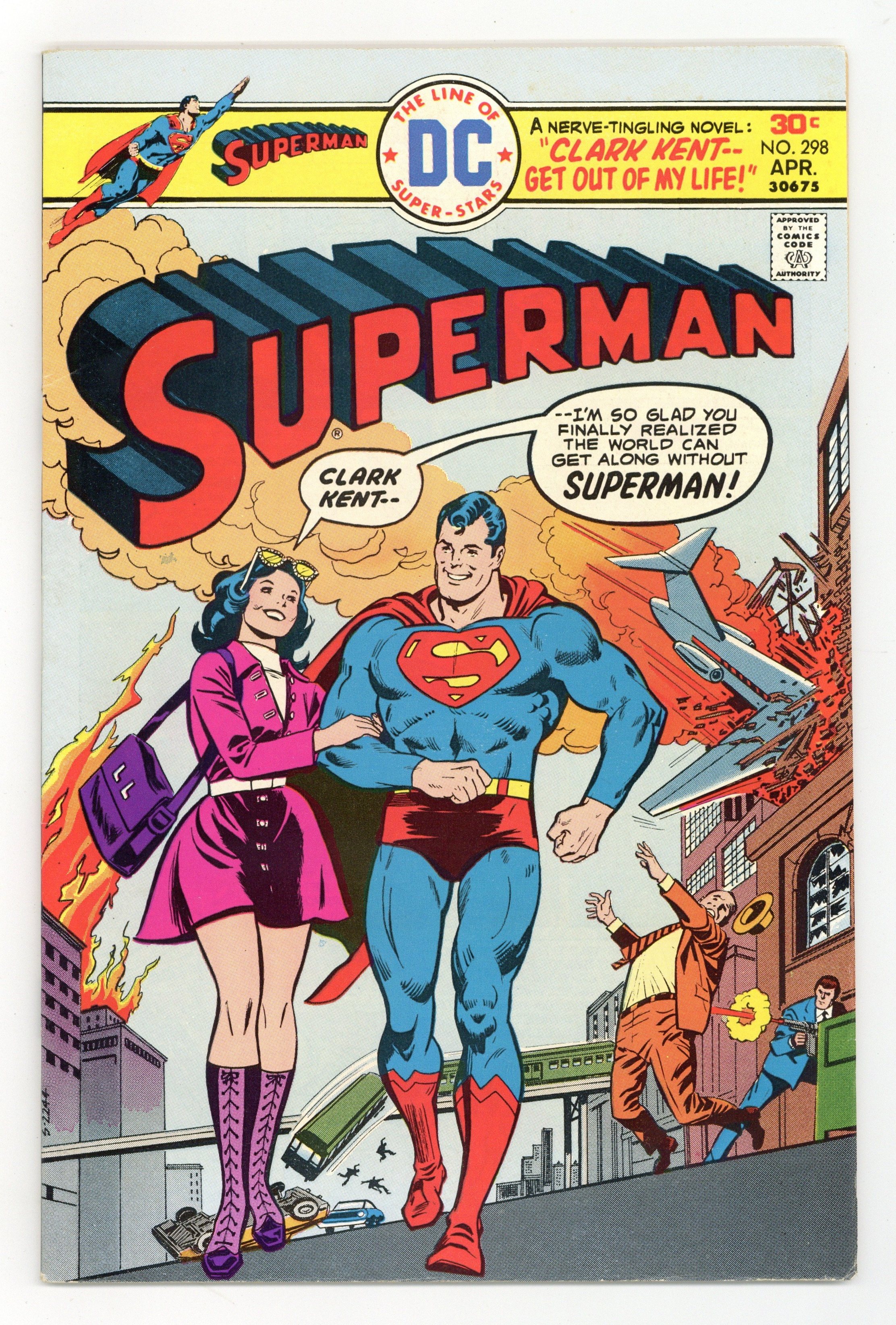 Starts Apr 27 Mark Jeweler Advertisement Insert Variant. First 30c cover-priced issue. Cover art by Bob Oksner. Clark Kent, Get Out of My Life!, script by Cary Bates and Elliot S! Maggin, pencils by Curt Swan, inks by Bob Oksner; Superman tries to live his life as Clark Kent only; he also battles Solarman; Xviar breaks into Clark's apartment. Justice for All Includes Children public service announcement, art by Neal Adams; Superman teaches kids not to fear the police. 36 pgs. $0.30. Cover price $0.30.