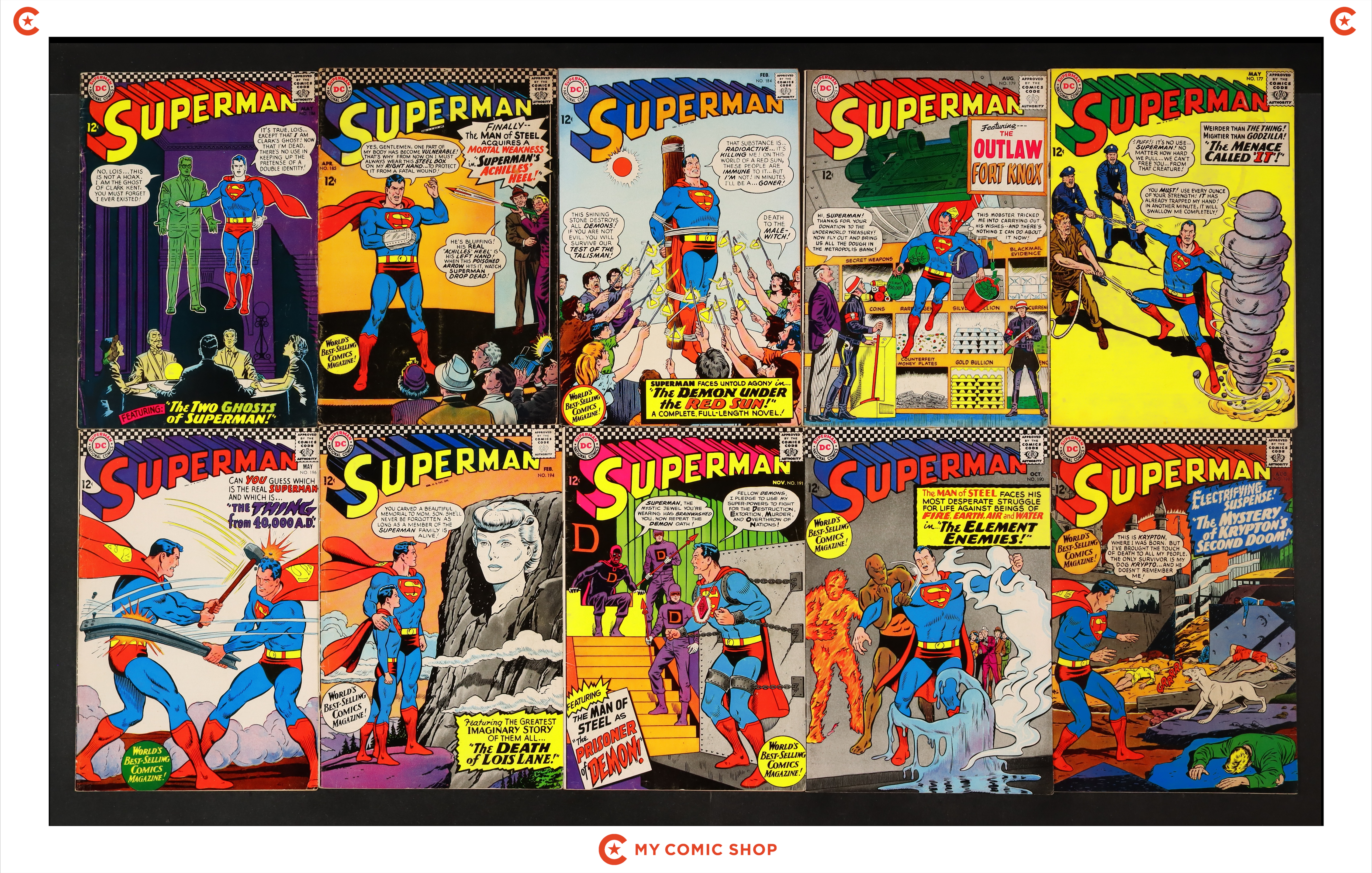 Issues 177, 179, 184, 185, 186, 189, 190, 191, 194, 196 of Superman (1939 1st Series). Most will grade in the GD/VG to FN range.