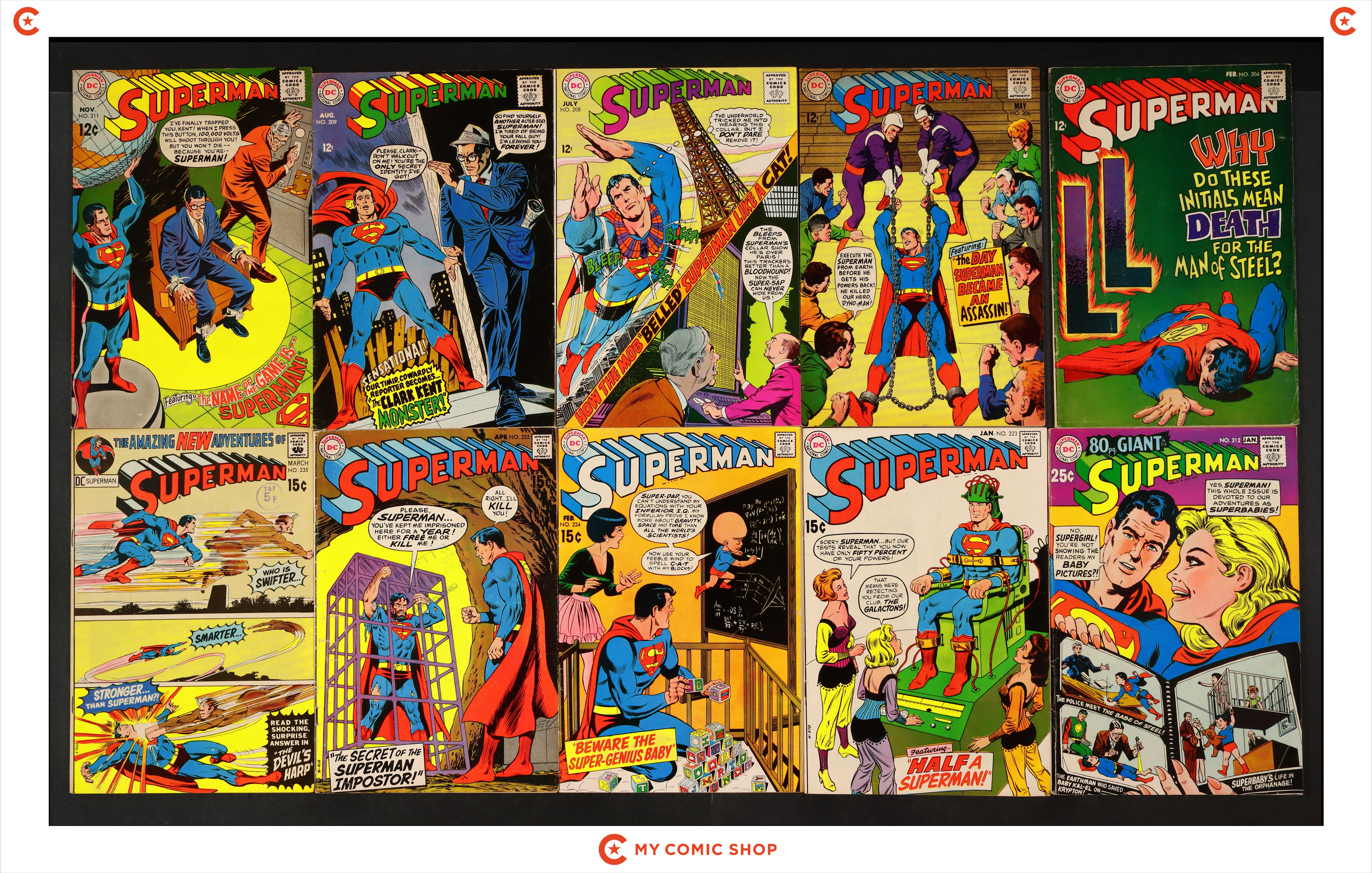 Issues 200, 201, 204, 205, 206, 208, 209, 211, 216, and 219 of Superman (1939 1st Series). Most will grade in the GD to VG range.