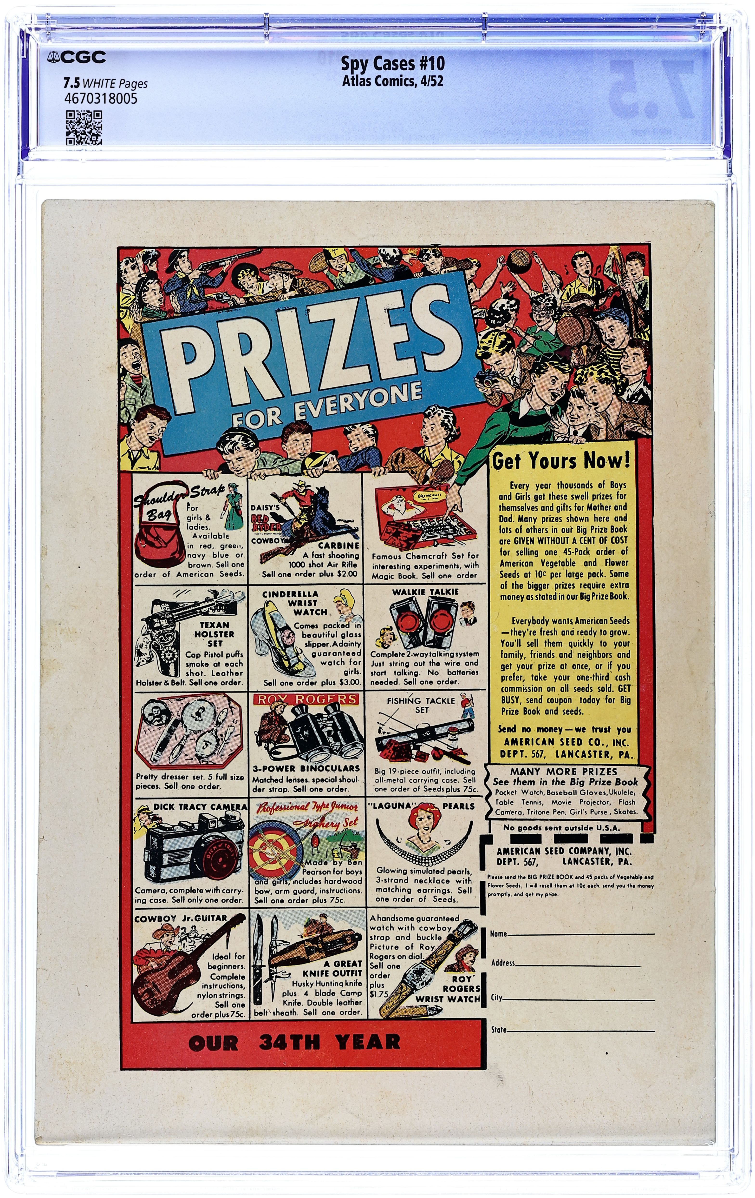 Published Apr 1952 by Marvel/Atlas.Spy Cases (1950) 10 CGC 7.5