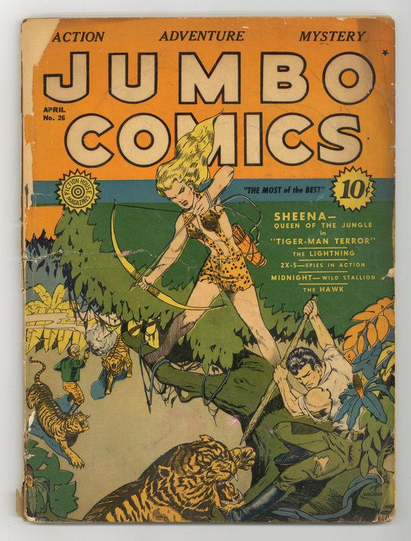 Starts Apr 4 Cover by Nick Cardy. Edited by Malcolm Reiss and Jerry Iger. Stories and art by Will Eisner, Jerry Iger, Art Saaf, Sy Reit, Robert Webb, and Bob Powell. An influential anthology starring jungle hero Sheena, featuring early art by legendary comics artists in the Eisner-Iger Shop. Sheena battles Mahatma Khan, master of tigers; Inspector Dayton tries to catch Carlson Meene, a modern Bluebeard with a suspiciously high number of dead wives; Midnight the colt is adopted by Rick, but then Red Martin shows up. The Hawk; Weird Stories of the Supernatural; Bobby; Sheena, Queen of the Jungle; Garden of Death; Pee Wee; Midnight the Black Stallion; Tom Dick and Harry; ZX-5 Spies In Action; Inspector Dayton; Lightning. 64 pages, Full Color. Cover price $0.10.