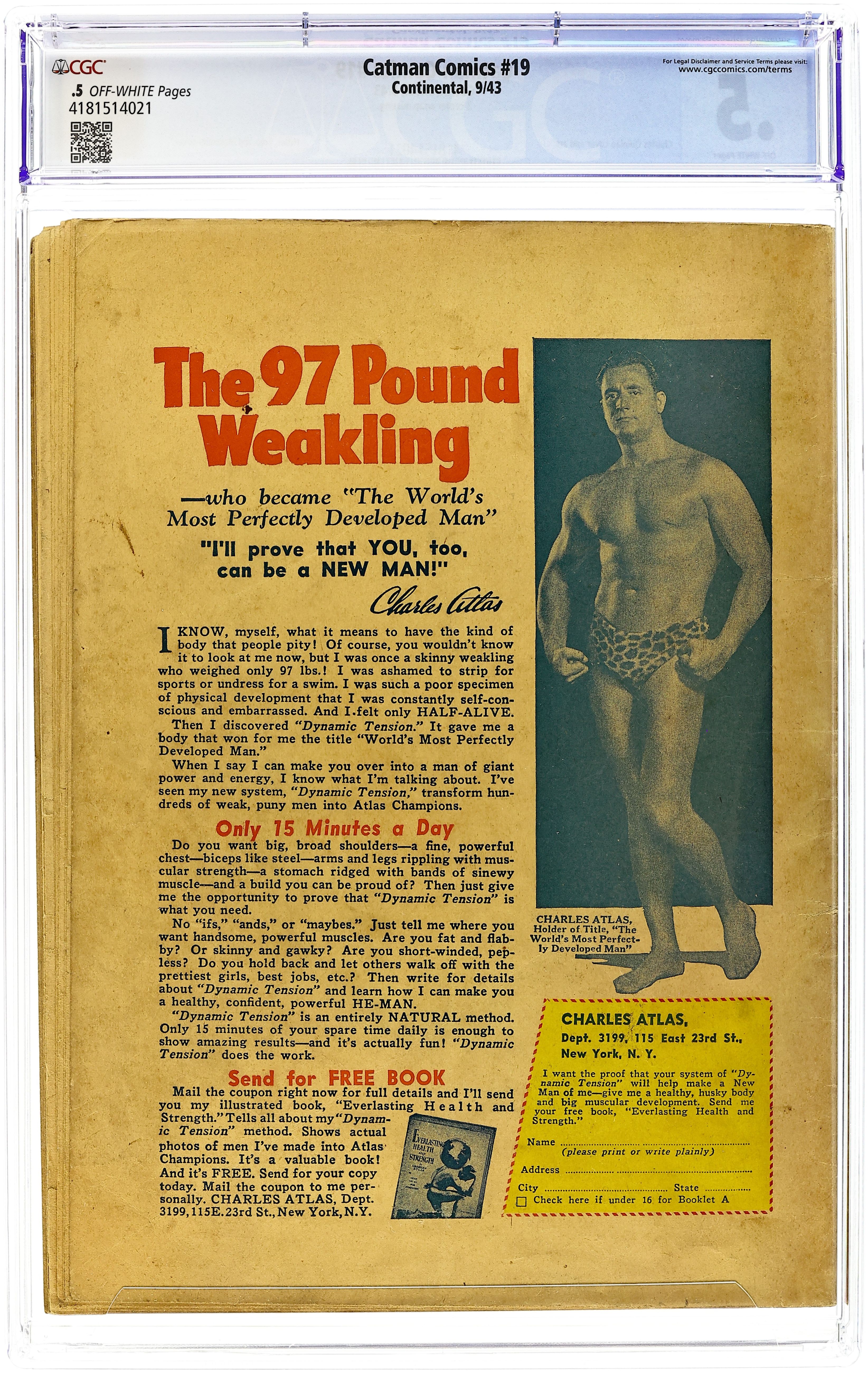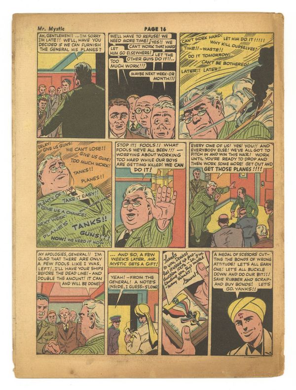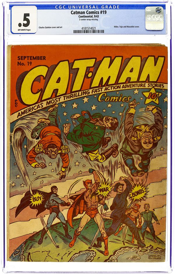 Starts Apr 4 Cover by Charles Quinlan. Stories and art by Bob Fujitani, Charles Quinlan, Herman C. Browner, Robert Turner, Al Mandel and C. R. Schaare. Sometimes listed as Cat-Man Comics Vol. 2 #6. The adventures of Cat-Man and other early superheroes from the Golden Age of comics. The Hood faces the ruthless Axis interrogator Red Lash, who has red whips for hands. Gangsters capture the Deacon and put him into a pit full of man-eating rats, but luckily Mickey is not far away. Kitten and Mickey, the sidekicks of Cat-Man and the Deacon also known as the Little Leaders, search for the train robber who stole a fortune in diamonds intended for the defense industry. Cover by Charles Quinlan features caricatures of the Axis leadership and doubles as a war-bonds PSA. Cat-Man & Kitten: The Two-Faced Terror; The Deacon & Mickey: Vanishing Vagabonds!; The Ragman: Adventure of Formula G275; Little Leaders: Diamonds for Victory!; The Hood: The Red Lash!; Chinatown Trap; Blackout: Death for the Nazis!; The Well Cooked Cook; Hog-Bound. 60 pages, Full Color. Cover price $0.10.