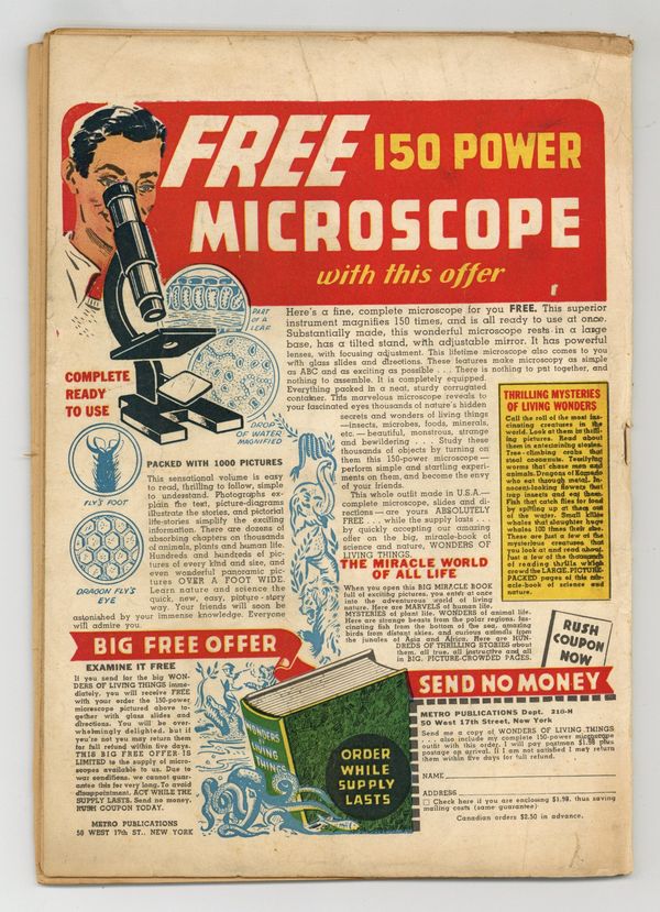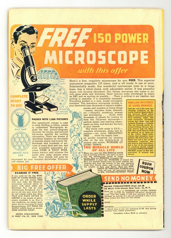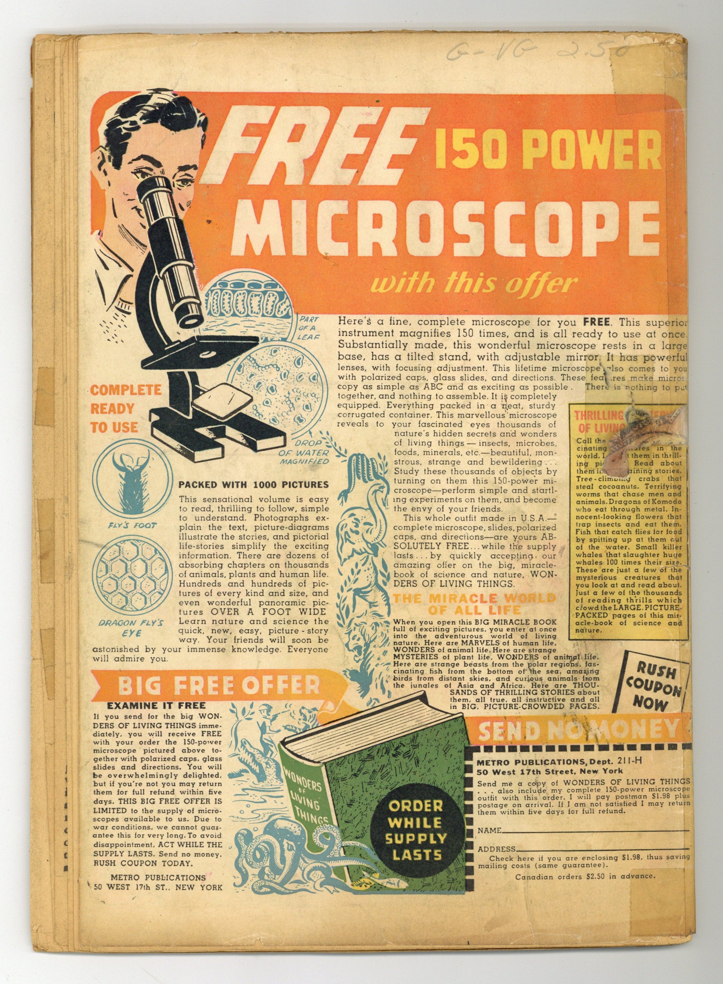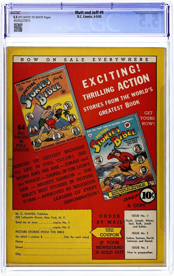 Starts Dec 8 Cover by Sheldon Mayer (credited as Bud Fisher). Stories and art by Al Smith (credited as Bud Fisher), A. W. Nugent, Falcon Mathieu, Sol Hess, and W. A. Carlson. All-American/ DC reprints the comic strip that defined the comic strip, featuring the original tall-and-short comedy duo. Also featuring the "topper" strip Cicero's Cat, and other strips from bygone days. Jeff and Mutt buy a car together, but Jeff wants to divide it. The new pet in the house is a panda, but luckily Cicero's Cat speaks Chinese. Jeff buys a raccoon and a kangaroo, so he can raise fur coats with pockets in them. Plus a vintage ad for Picture Stories from the Bible, one of the first publications from Educational Comics, soon to be known as legendary publisher EC. Also featuring an "editor" credit to M.C. Gaines, inventor of the comic book and founder of EC Comics. Mutt & Jeff; Cicero's Cat; Simp O'Dill; Victory Puzzles; How to Spot the Planes in the Skies; Hop Harrigan. 60 pages, Full Color. Cover price $0.10.