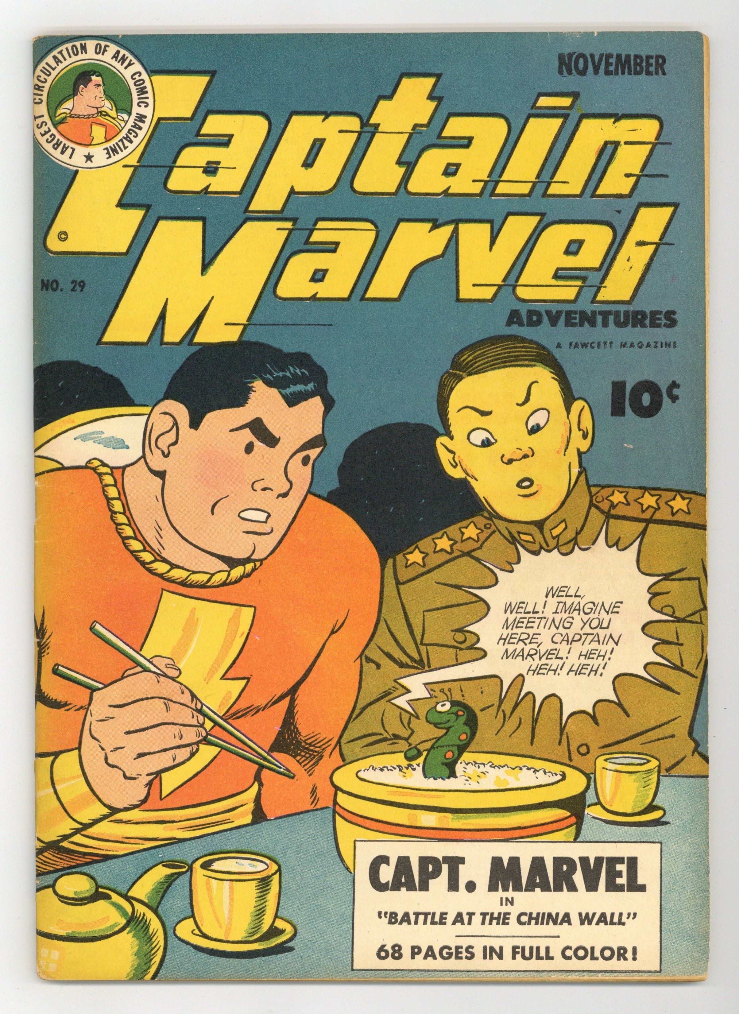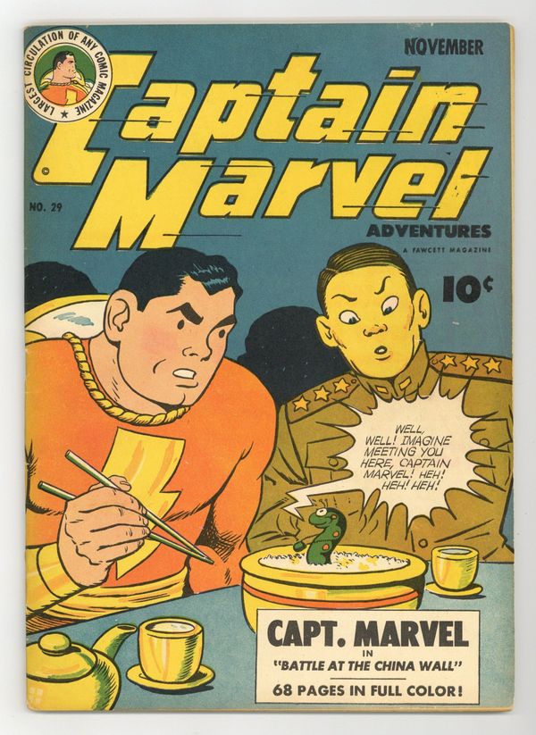 Starts Jan 3 Cover by C.C. Beck. Stories by Otto Binder, Robert Kanigher, Bert Whitman and unknown. Art by C.C. Beck, Bert Whitman and unknown. After Captain Marvel defeats Mr. Mind's monsters, the villain escapes to China where his Japanese allies Doctors Hashi, Smashi, and Peeyu animate the Great Wall and turn it against the Chinese army. Billy is captured again and Mr. Mind spins a cocoon around him which prevents him from speaking his magic word in "The Monster Society of Evil Chapter 8: Battle at the China Wall!" by Otto Binder and C.C. Beck. Captain Marvel also stars in: "Knighthood Flowers Again" with story by Otto Binder (Portland, Oregon city story); "The Reform of Roughneck Ryan!"; and "The Beautiful Baby Contest" with story by Robert Kanigher. Plus: Little Sneezer 2-pager "Fresh Air!" by Bert Whitman; 2-page text story "Send Me in, Coach!" by Tod Shaw; and Captain Kid in an untitled 2-pager. 68 Pages, Full Color. Cover price $0.10.