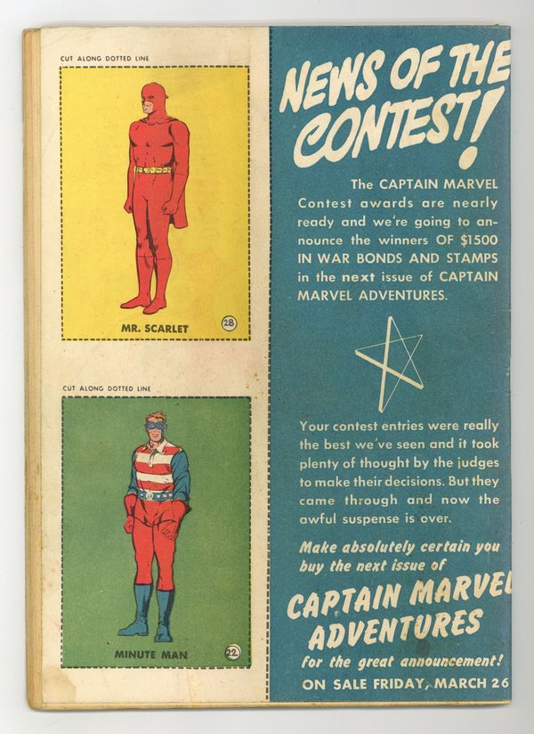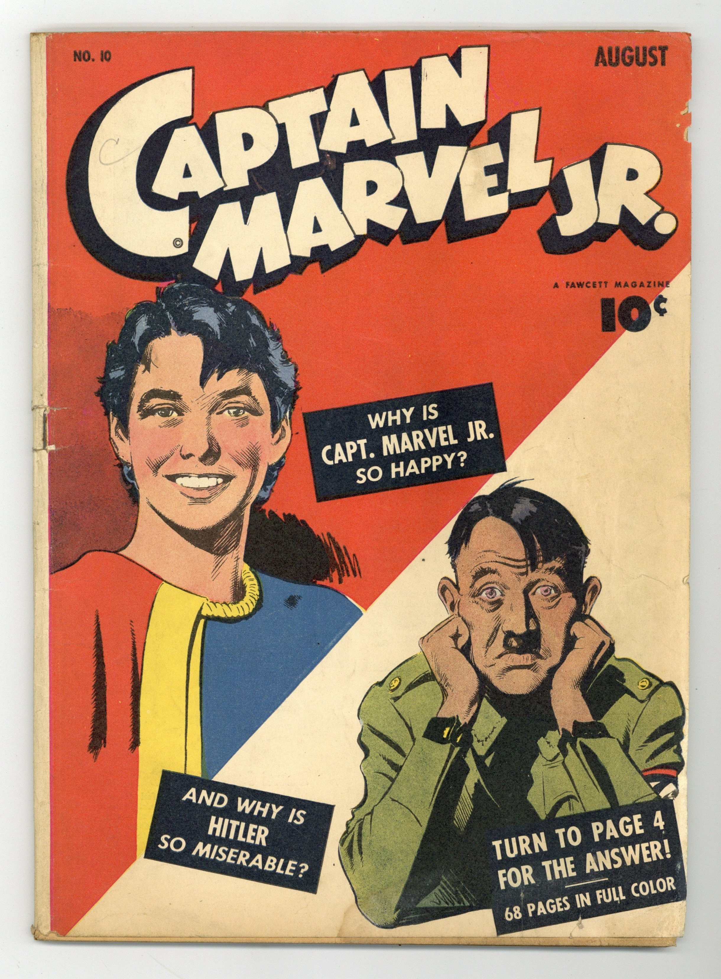 Starts Jan 3 Cover by Mac Raboy. Stories by Otto Binder and others. Art by Mac Raboy and Al Carreno. Superhero action with Freddy Freeman, who gains the same powers as his hero Captain Marvel, better known these days as Shazam. As Germany's fortunes decline in WWII, Hitler and the Nazi command regroup on a moonbase to plan the destruction of Earth - but luckily, Marvel Jr. notices that a captive moon-man in a zoo speaks with a German accent! In a story that reflects its times (with art by Mac Raboy), an Axis scientist invents a formula that turns Americans into Japanese loyal to the Axis. Sivana's latest plot involves time-travel to the American Revolution and a deal with Benedict Arnold, but Captain Marvel Jr. is right on his heels, in a story with a cameo by Captain Marvel/Shazam. The Moon Menace; Demlins; The Yellow Curse; Pix Puzzles; Sivana and an Ancestor's Enemy; Li'l Alaska; Listen Soldier!; Cops of the Crooked Cross. 64 pages, Full Color. Cover price $0.10.