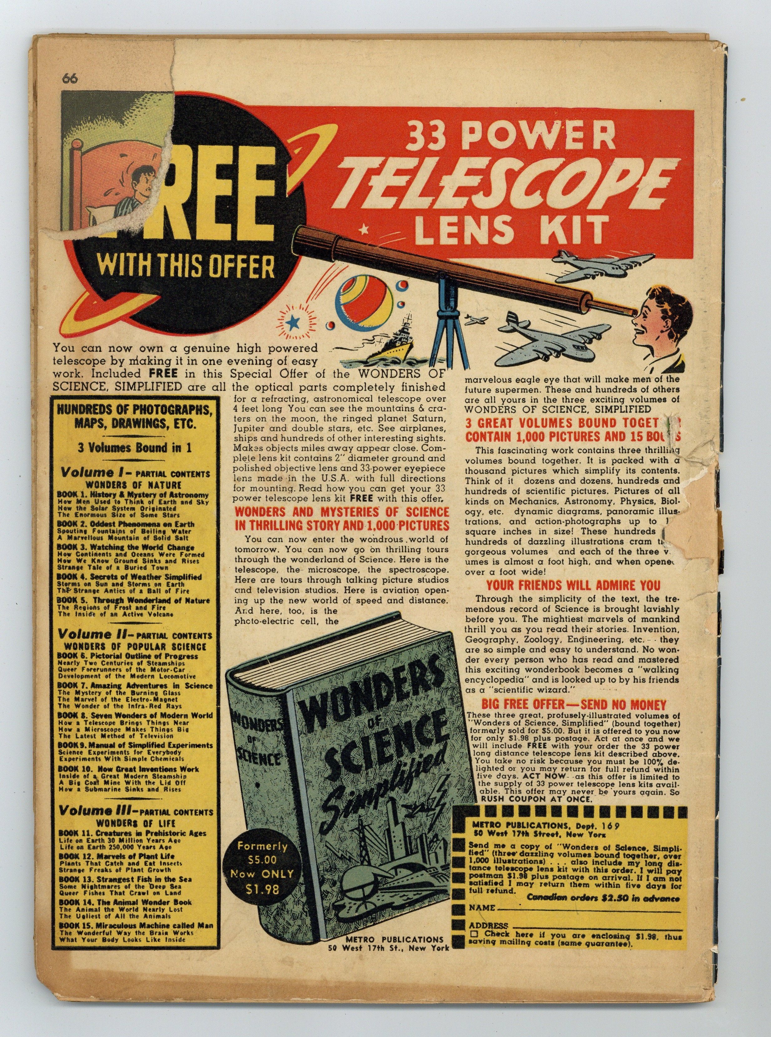 Starts Jan 3 Cover by Mac Raboy. Stories by Otto Binder and Joe Millard. Art by Al Carreno and others. Superhero action with Freddy Freeman, who gains the same powers as his hero Captain Marvel, better known these days as Shazam. To defeat Sabbac, Captain Marvel Jr. must get the demons who empower him to abandon him. Seeds from Mars land on Earth, creating poisonous trees, in an effort to clear the Earth for a Martian invasion. A man named Jonah brings bad luck to anyone he meets, including Marvel Jr. The Nightmare Studio of Sabbac; Captain Marvel, Jr. Battles on Another World; Trolls; The Mad Murders; Killers Incorporated; Jonah the Jinx. 64 pages, Full Color. Cover price $0.10.