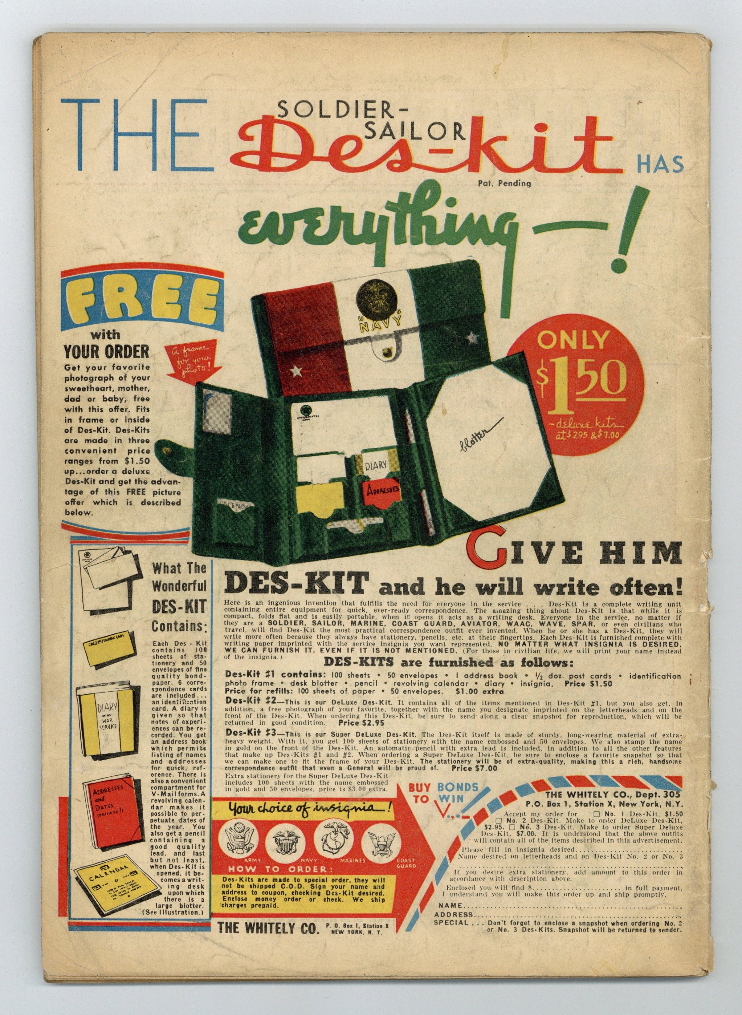 Starts Jan 3 Cover art by Jack Burnley. America's Secret Weapon!, script by Don Cameron [as Jerry Siegel], pencils by Sam Citron [as Joe Shuster], inks by Sam Citron [as Joe Shuster]; When Superman arrives at Camp Towne to make an appearance, he volunteers to participate in the war games that will take place. A Claw For a Clue text story by Tex Raines. Habitual Homicide, script by Jerry Siegel, art by George Roussos [as Joe Shuster]; When Professor Lock makes a move on one of the college girls and is rebuffed, he swears revenge by killing the college dean and blaming her fiance. Hank the Yank humor page by Ray Houlihan. Fashions In Crime starring Superman, script by Jerry Siegel, art by Peter Riss [as Joe Shuster]. Clancy the Cop humor page by Henry Boltinoff. Danger On the Diamond starring Superman, script by Jerry Siegel, art by John Sikela [as Joe Shuster]. 60 Pages, Full Color. Cover price $0.10.
