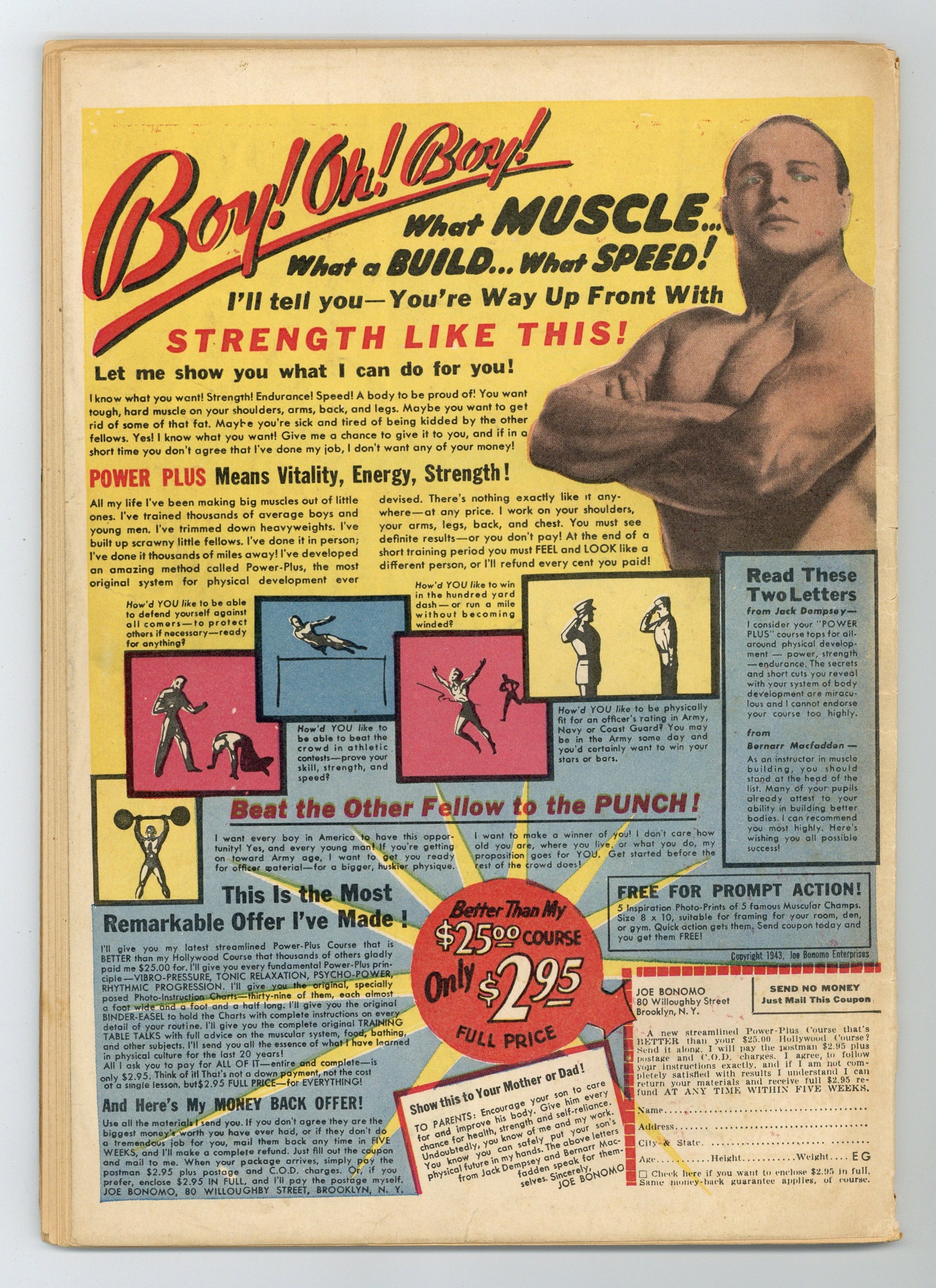 Starts Jan 3 Cover by Mac Raboy. Stories by Otto Binder and Sid Lazarus. Art by Mac Raboy and Sid Lazarus. Superhero action with Freddy Freeman, who gains the same powers as his hero Captain Marvel, better known these days as Shazam. Sivana's latest invention gives him the strength of hundreds of men, which is even greater than Captain Marvel Jr. himself. Shipwrecked on an island, four people compete to find a lost treasure first, and Marvel Jr. has to keep them from killing each other in the meantime. A troll uses magic to turn an egg incubator into a vehicle and make mischief. Holiday-themed cover by Mac Raboy seems to feature Santa Marvel, not Captain Marvel in a Santa suit. The Sinister Stamps; Demlins; Sivana, the Muscle Midget; Invasion at Dawn; On Treasure Island; Snortville Sneeze; The Vest Pocket Levitator. 56 pages, Full Color. Cover price $0.10.