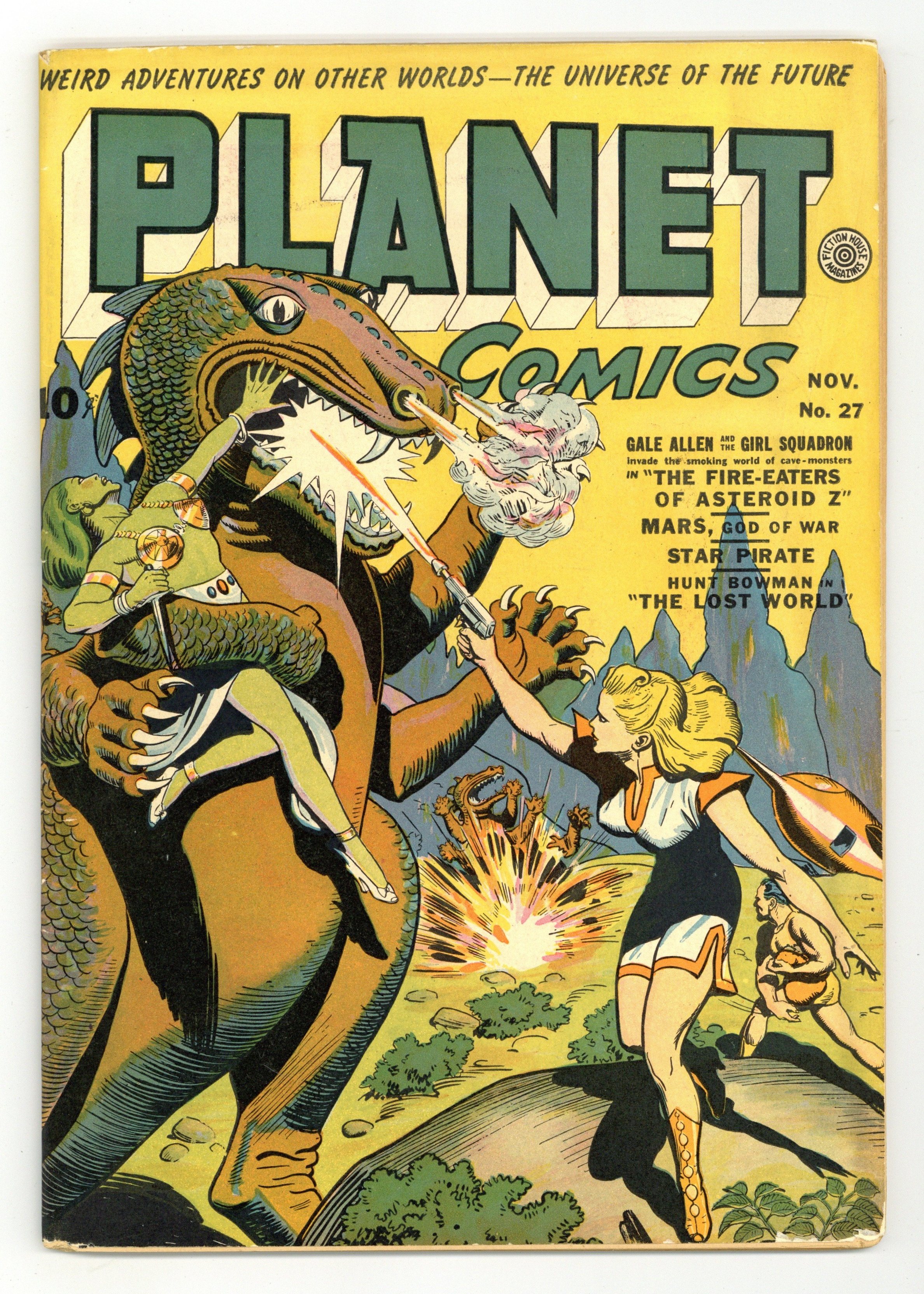 Starts Jan 3 Cover by Joe Doolin. Edited by Malcolm Reiss. Stories and art by Graham Ingels, Joe Doolin, George Appel, and Karen Karol. The first true science fiction comic, Planet Comics featured classic space opera with square-jawed heroes, rockets, rayguns and bug-eyed aliens of every stripe. Gale Allen battles subterranean Armadillo Men who want to transform and enslave the inhabitants of planet Vuur; Norge Benson tries to outwit space Vikings, but they're evenly matched; Hunt and Lyssa encounter primitive humans in The Lost World. Nice Gale Allen/alien-girl cover by Joe Doolin. The Lost World; Gale Allen and the Girl Squadron; Mars, God of War; Space Rangers; Will Man Find the Key to Eternal Life?; Norge Benson; Auro Lord of Jupiter; The Star Pirate. 60 pages, Full Color. Cover price $0.10.