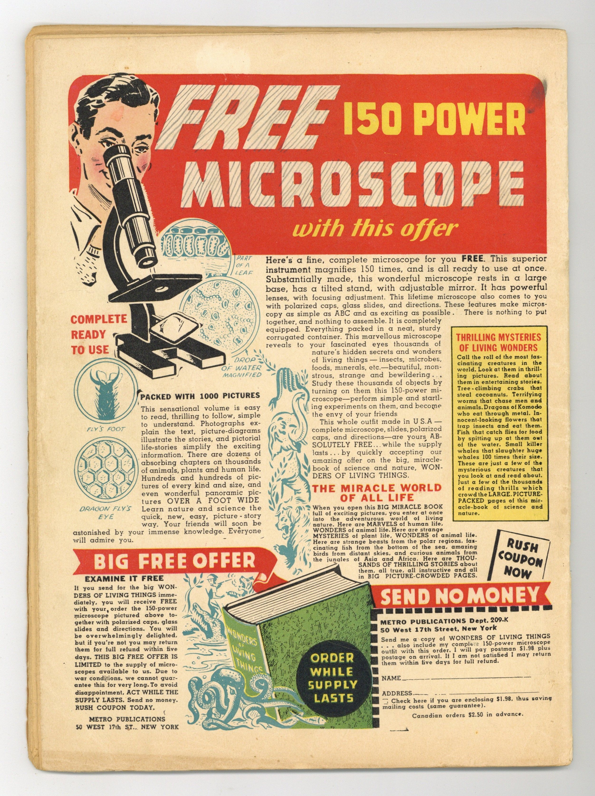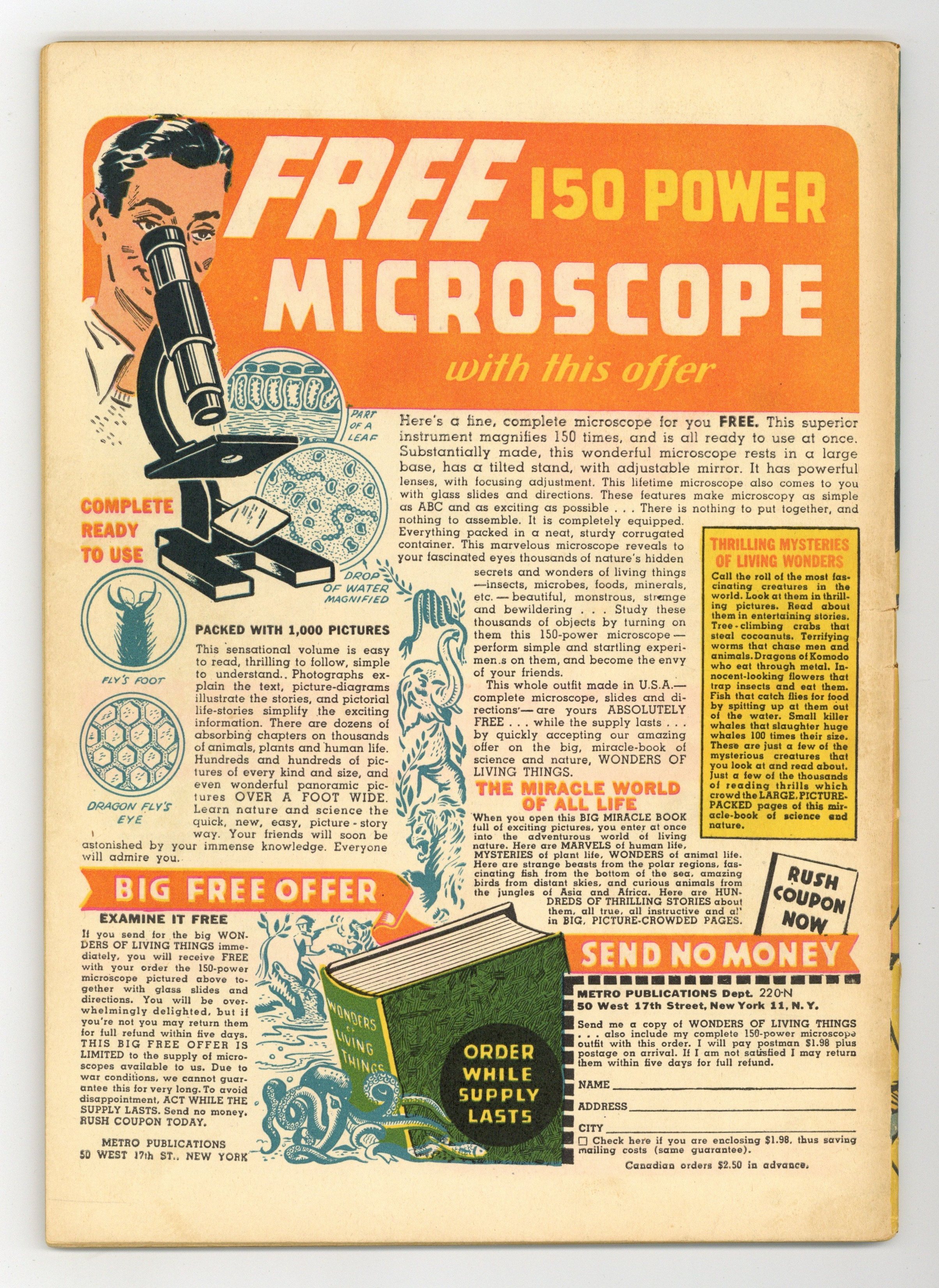 Starts Jan 3 Cover by Mac Raboy. Stories by Otto Binder, Tom McNamara and Art Helfant. Art by Mac Raboy, Tom McNamara, Phil Bard, Art Helfant, Marc Swayze and Al Carreno. Superhero action with Freddy Freeman, who gains the same powers as his hero Captain Marvel, better known these days as Shazam. Freddy Freeman crash-lands on a mysterious floating island that turns out to be a base for Axis forces. Captain Marvel Jr. encounters sinister mad scientist Prof. Quiddle and his enforcer, Eza Zombey. Sivana uses giant insects in his latest plot, in a story that includes scenes of Air Force jets dogfighting with giant wasps. The Floating Island; Demlins; Professor Quiddle's Zombie; Stand-in for a Dummy!; Rubbernose Randolph; Captain Marvel Jr. Battles the Insect Giants; Oofty Goofty; Baffin Land. 56 pages, Full Color. Cover price $0.10.