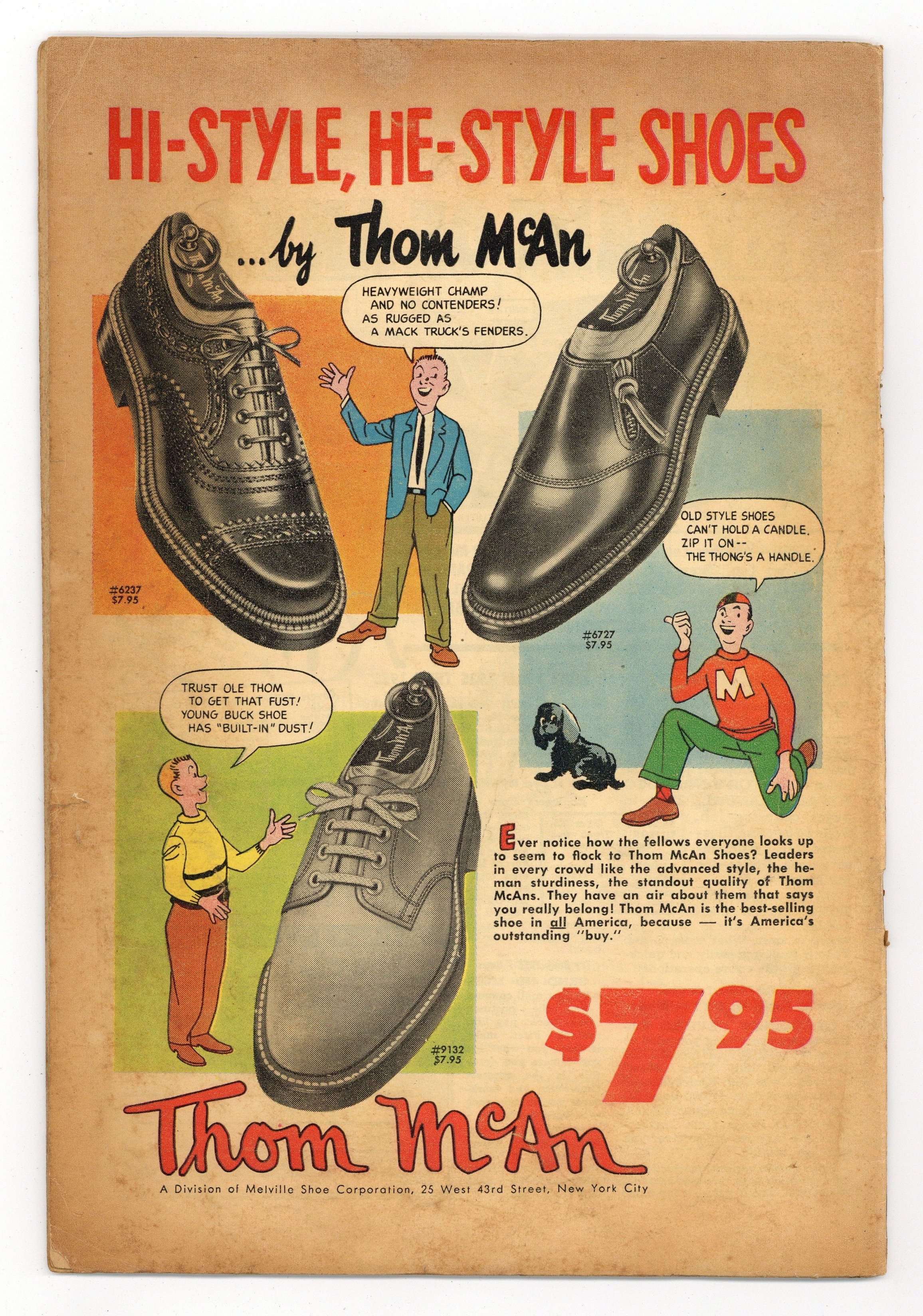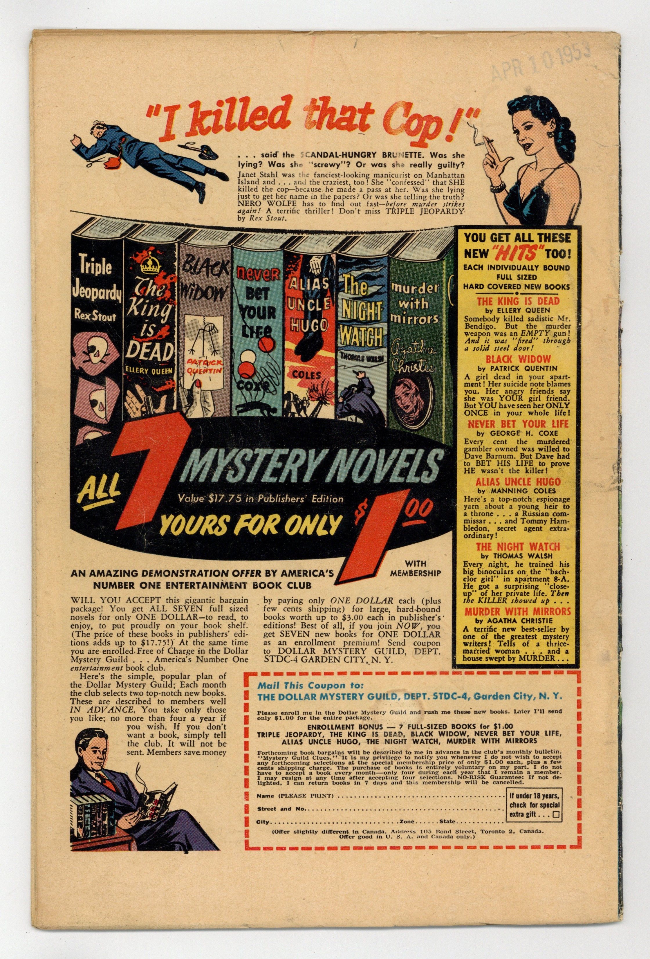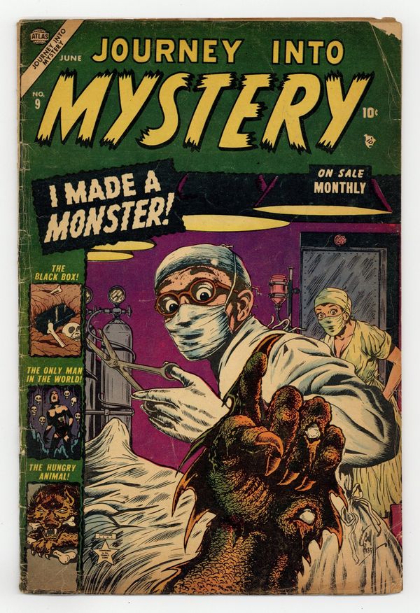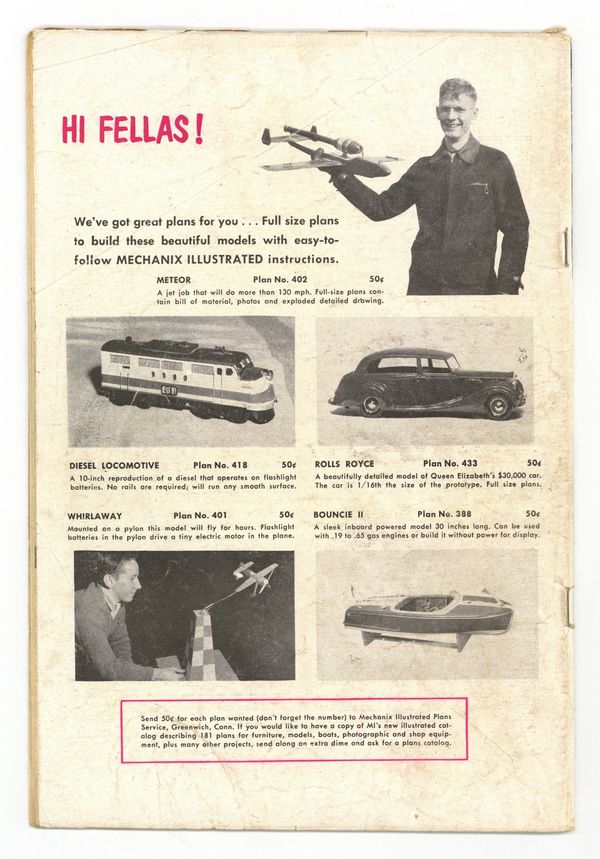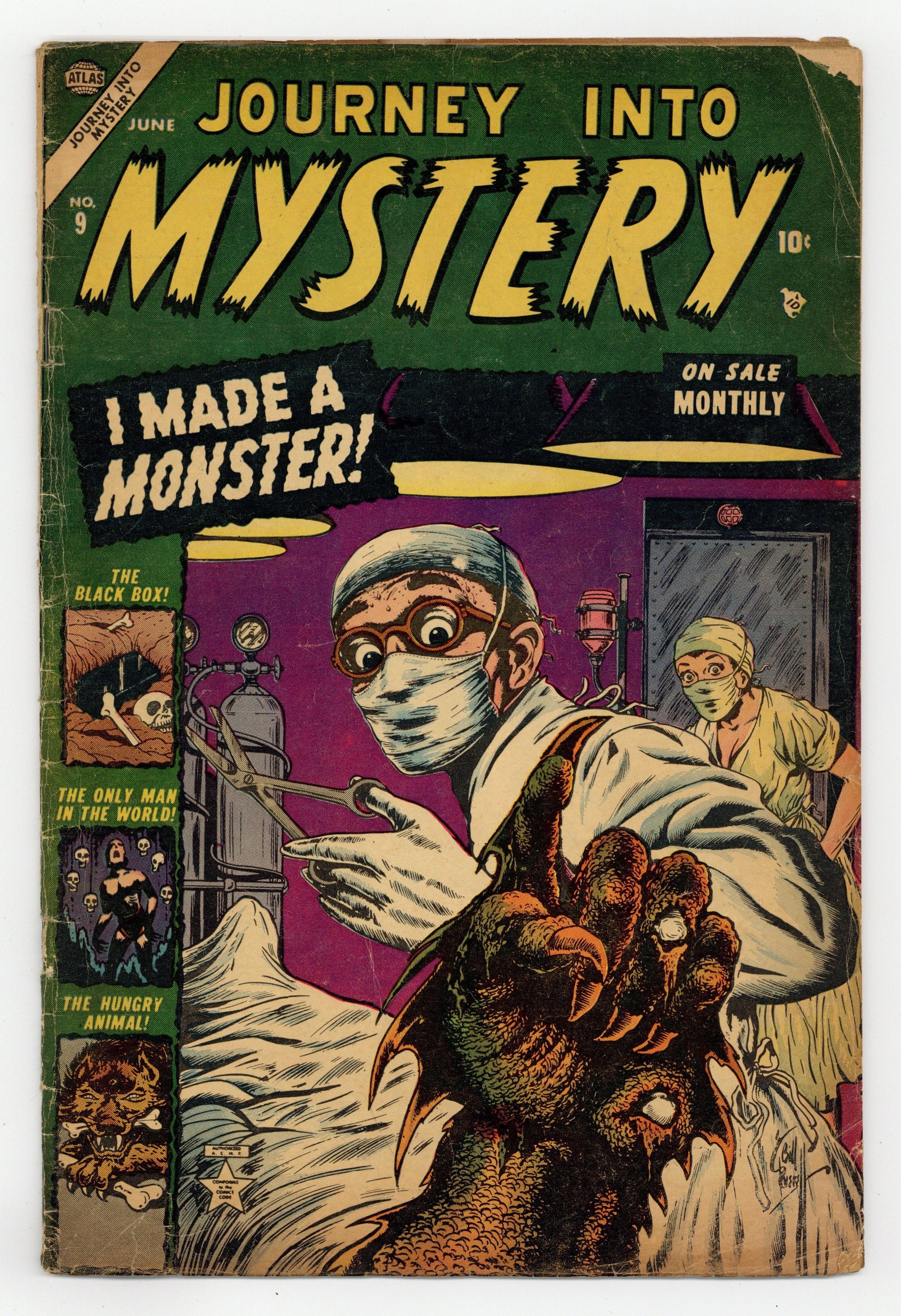 Starts Jan 3 Cover by Bill Everett. "The Only Man In the World" (Part 1), art by Jerry Robinson; Aliens from dimension X stop time and then destroy humanity. "I Made a Monster," art by John Forte; When a jilted scientist is building a Frankenstein monster to kill for him, he decides to test it by using the type of lipstick his love interest wears as a kill trigger in order to pay her back for spurning him. "Last Verdict" text story. "The Hungry Animal!," art by Ed Goldfarb; Synopsis: When two robbers murder a retired sea captain in his seashore house, they decide to kill his pet as well, lest it begin to howl before they have time to get far enough away from the scene of the crime. "The Black Box!," art by Mac Pakula; A shoplifter regrets stealing and opening a black box from a "monster sale." "My Brother's Killer!," art by Paul Reinman; A brother decides to murder his brother for an inheritance, but when the train they are traveling crashes, he decides to merely leave him to perish in the fire. When the will is read, it is revealed that the dead man was the only person who knew the location of the mine wherein the fortune was kept. 36 pgs., full color. $0.10. Cover price $0.10.