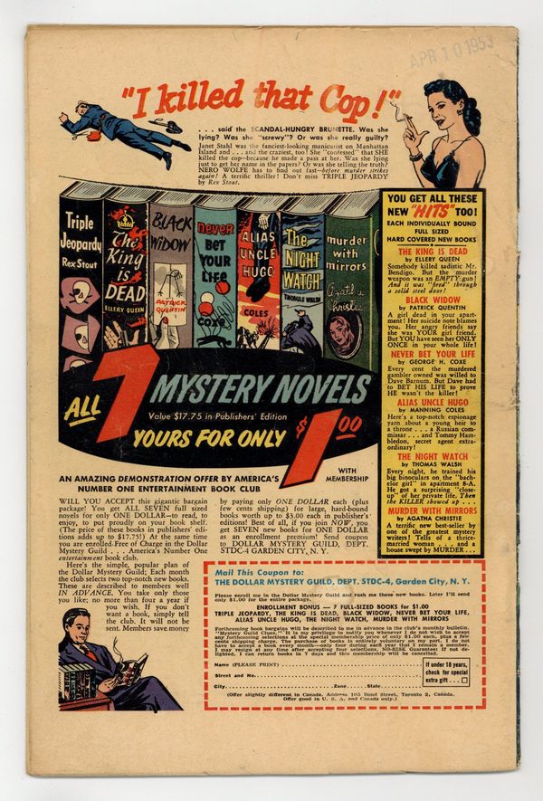 Starts Jan 3 Cover by L. B. Cole. Pre-Code crime comics from L. B. Cole's Star Publications. Twins try to outdo each other in crime and murder. Poisoner Cordelia Botkin uses a deadly box of candy on her romantic rival, and accidentally sets a legal standard for the prosecution of interstate crimes. A superstitious hood consults a fortune teller to learn the path forward, but her predictions are dark indeed. The Twin Killers; The Poison Parcel; Murder for Money; I Predict Death. 32 pages, Full Color. Cover price $0.10.