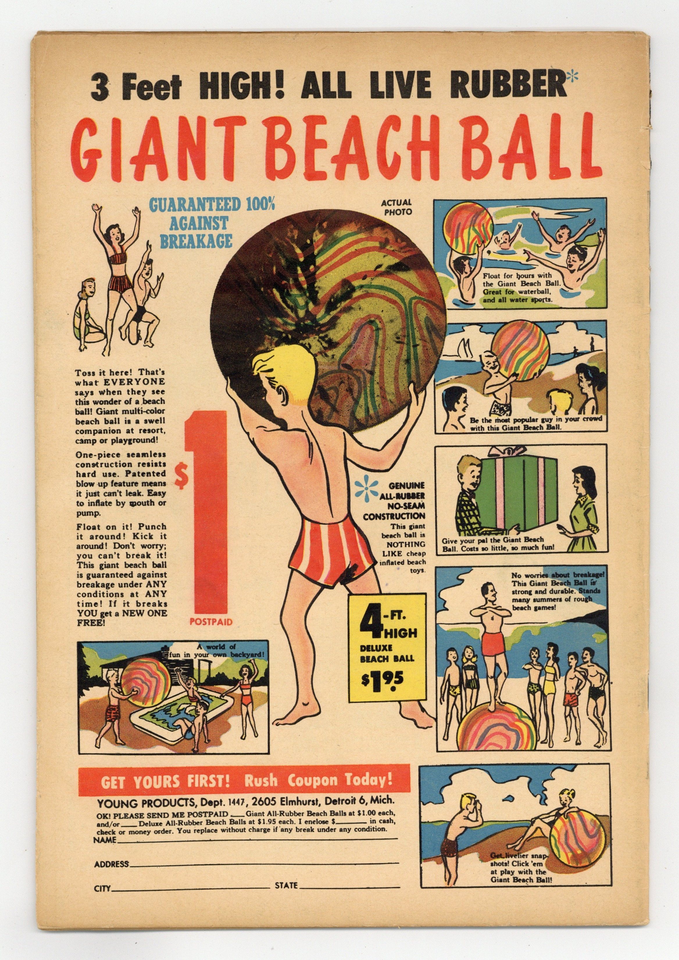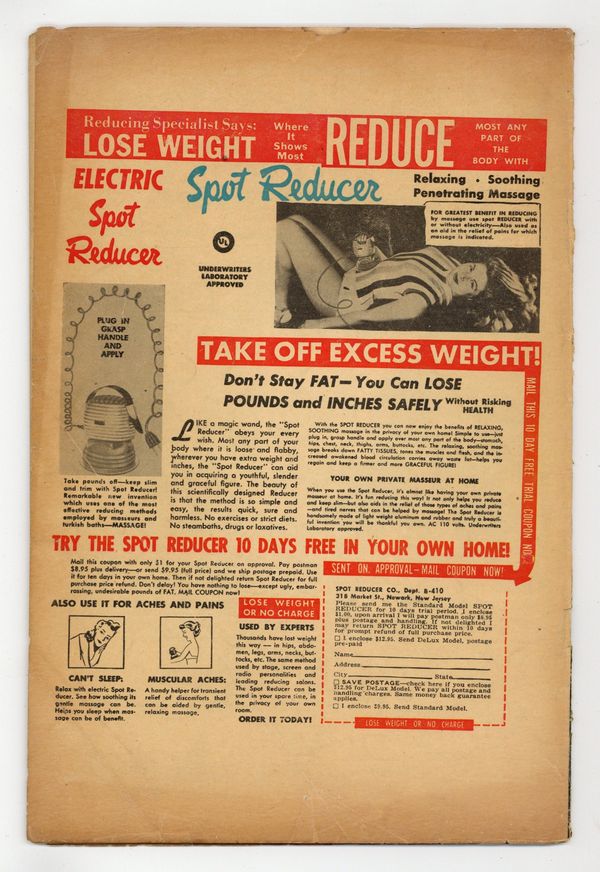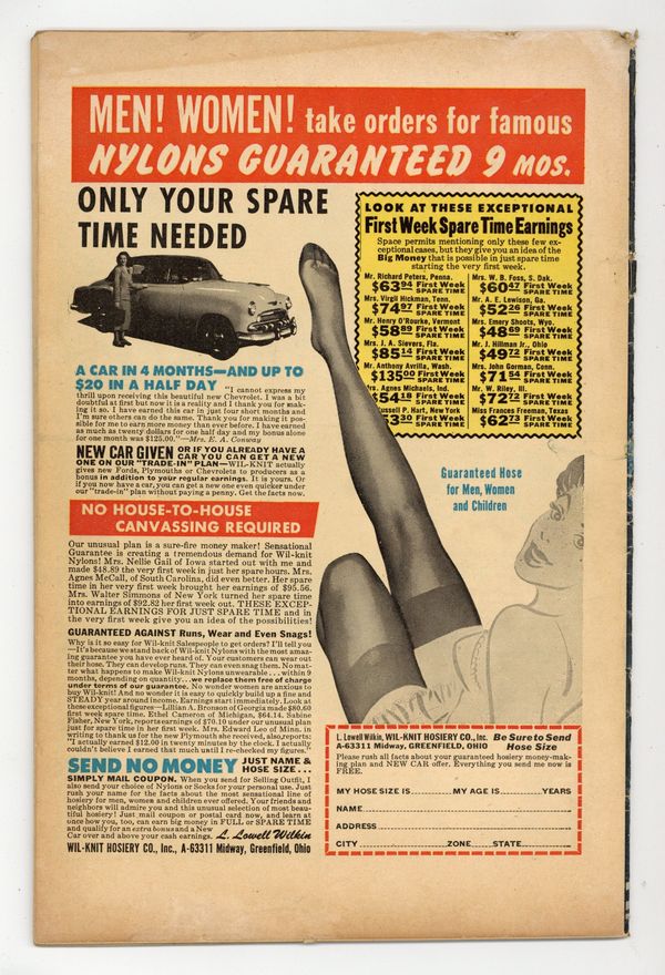 Starts Dec 8 "Cheaper By the Cousin"; Archie's hopes of an evening alone with Veronica are hampered by her young cousin. "A Fish in Time"; While the others eagerly anticipate going through the tunnel of love at the amusement park, Jughead would rather go fishing. "Weak-End Trip"; As a joke, the boys intimate they are going to play around on Betty and Veronica once they leave Riverdale for a lakeside vacation. "Number Please," pencils by Samm Schwartz; Suzie tries to call Ferdie, but gets the butcher shop instead. Untitled story, script by Bill Woggon, pencils by Hazel Marten (as Bill Woggon), inks by Cassie Bill; Katy and K.O.'s afternoon of fishing is spoiled by Katy's stalker. Katy's Fashions page, art by Cassie Bill. "Mock Rock," art by Harry Lucey; Veronica mistakes a giant sea turtle for a rock and sets her picnic lunch on its shell. "Wasted Effort," script by Frank Doyle, pencils by Harry Lucey; Ginger tries to help Patsy with her diet. 36 pgs., full color. Cover price $0.10.