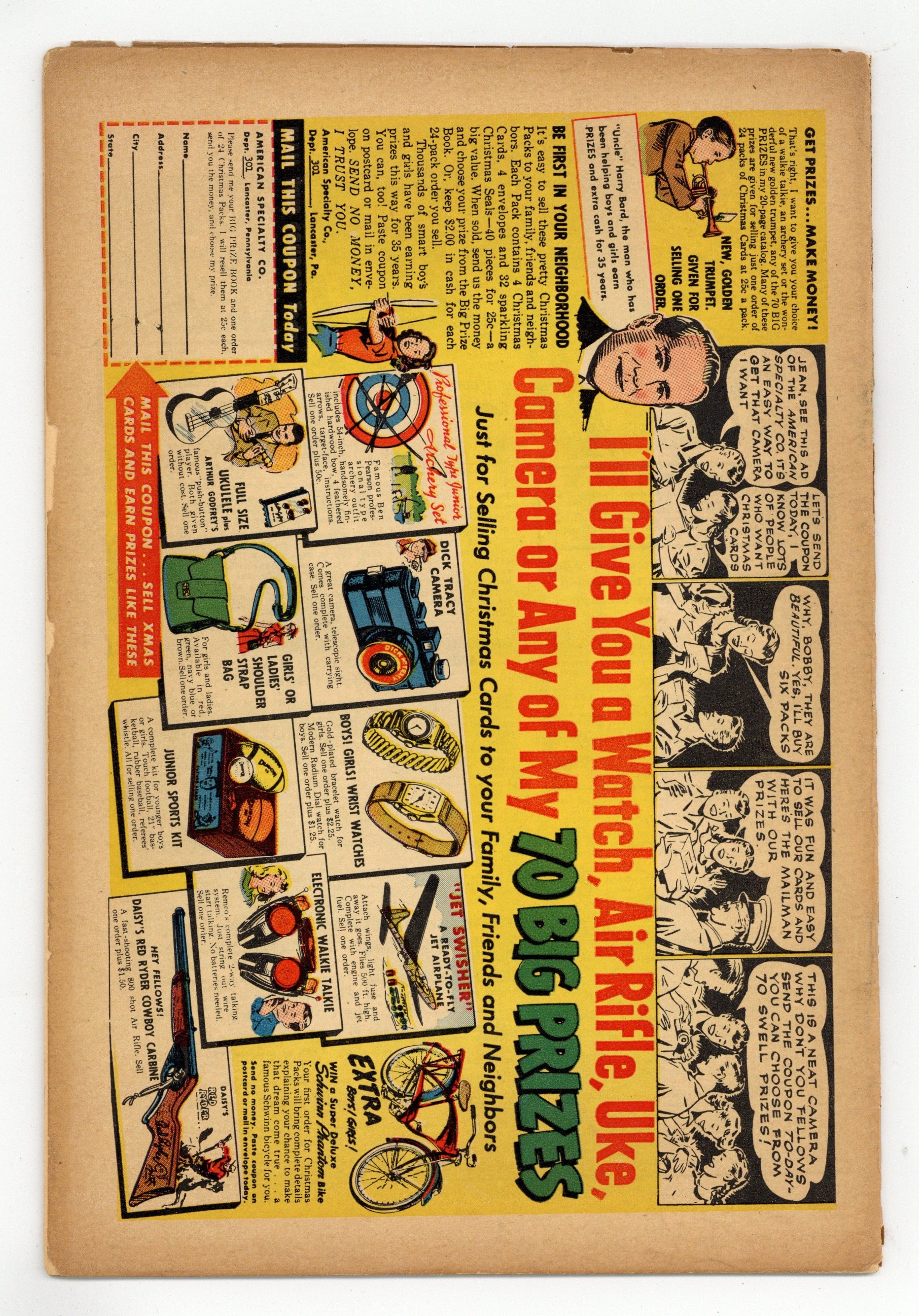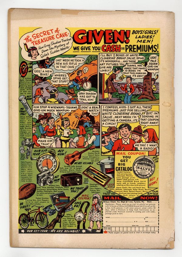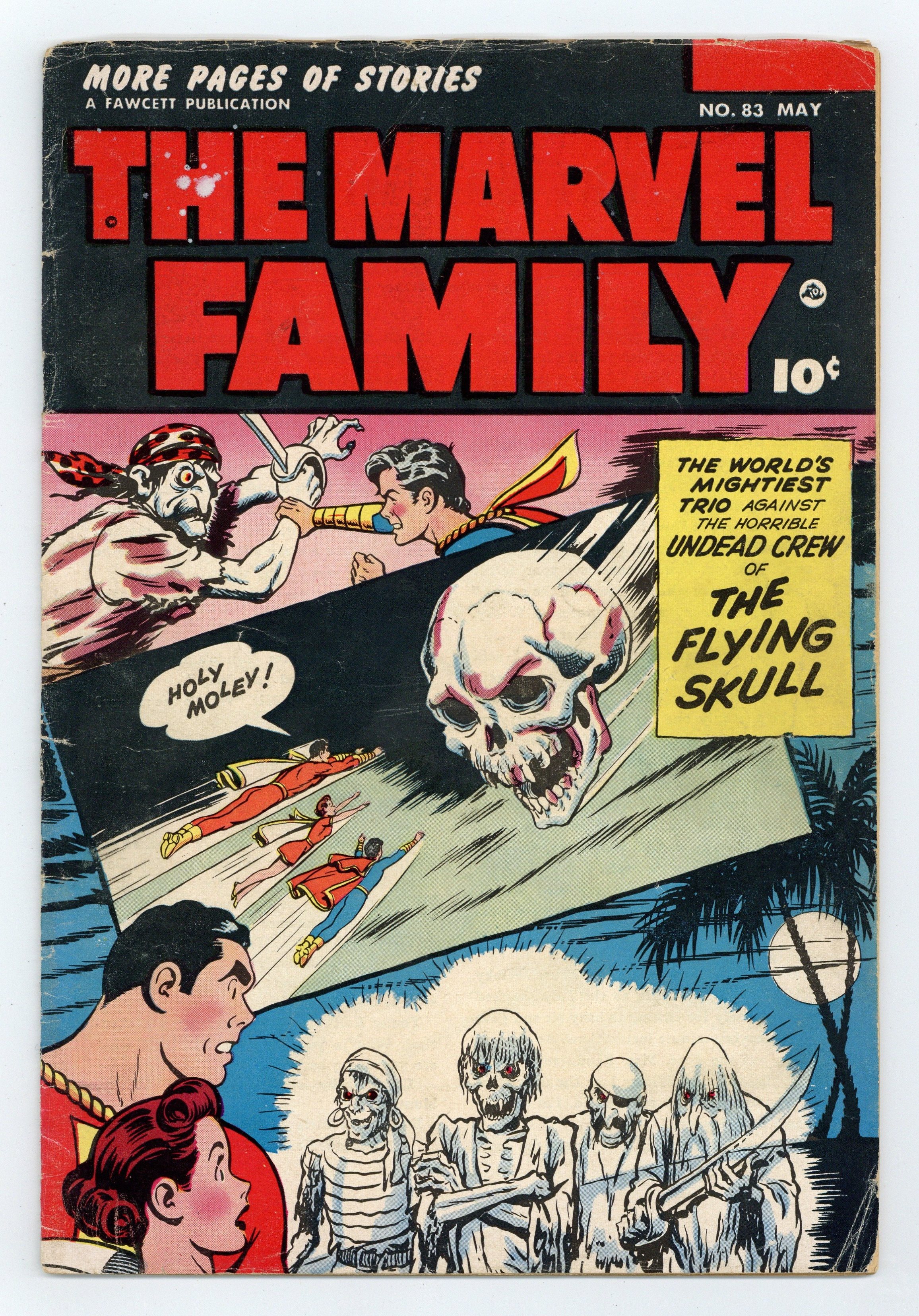 Starts Jan 3 Stories and art by Otto Binder, Kurt Schaffenberger and Howard Boughner. Fawcett's most popular heroes, the original Captain Marvel (Shazam) and family, in solo and shared adventures. While visiting Pa Potter, Billy, Mary and Freddy discover an old treasure map and go in search of lost treasure. This Goonies-style adventure takes a left turn with the appearance of the Scarlet Skull and his army of zombies, something only the Marvels can handle. Headline Harry's hand-grenade joke gets him assigned to the underworld beat. The Flying Skull; FBI Triumphs; Lazy Lee; Boxcar Benny; The Marvel Family Puzzle Page; Headline Harry: The Handy Hand Grenade; Wilbur the Waiter; Rubbernose Randolph; The Marvel Family Battles Chief Thundercloud. 32 pages, Full Color. Cover price $0.10.