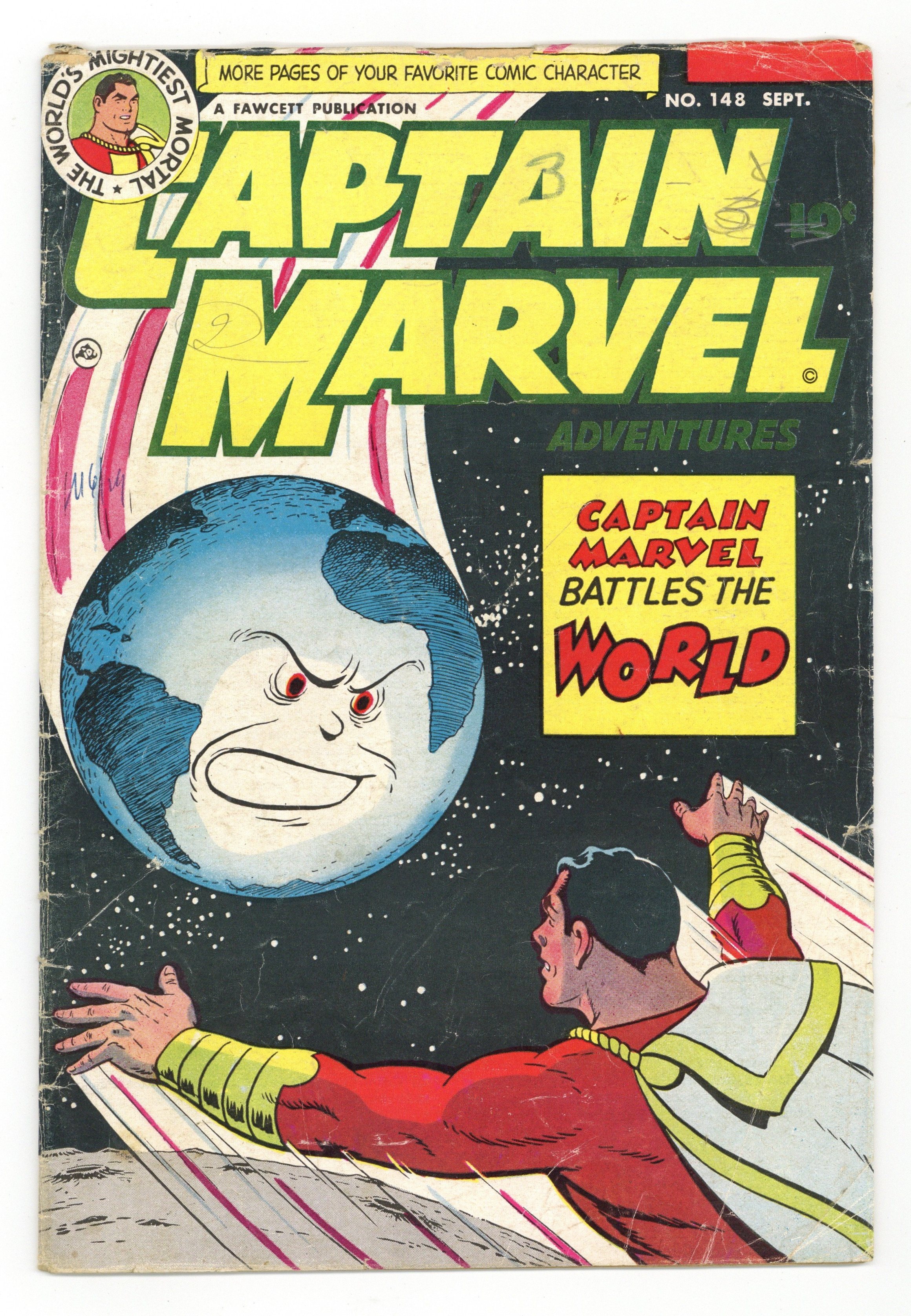 Starts Dec 15 Cover by C.C. Beck. Stories by Otto Binder and Al Liederman. Art by C.C. Beck and Al Liederman. Captain Marvel (Billy Batson) stars in: "Sivana Saves Captain Marvel" by Otto Binder and C.C. Beck (appearances by Sivana, King Zurk and Mr. Grunbock); "Captain Marvel Battles the World" by Otto Binder and C.C. Beck; and "Captain Marvel Meets the Impossible Ghost" by Otto Binder and C.C. Beck (Dexter Knox appearance). Plus: Captain Kid in "The Message from Across the Seas!" by Al Liederman. And: Jon Jarl in the 2-page text story "Space Parade" with script by Otto Binder (as Eando Binder). 36 Pages, Full Color. Cover price $0.10.