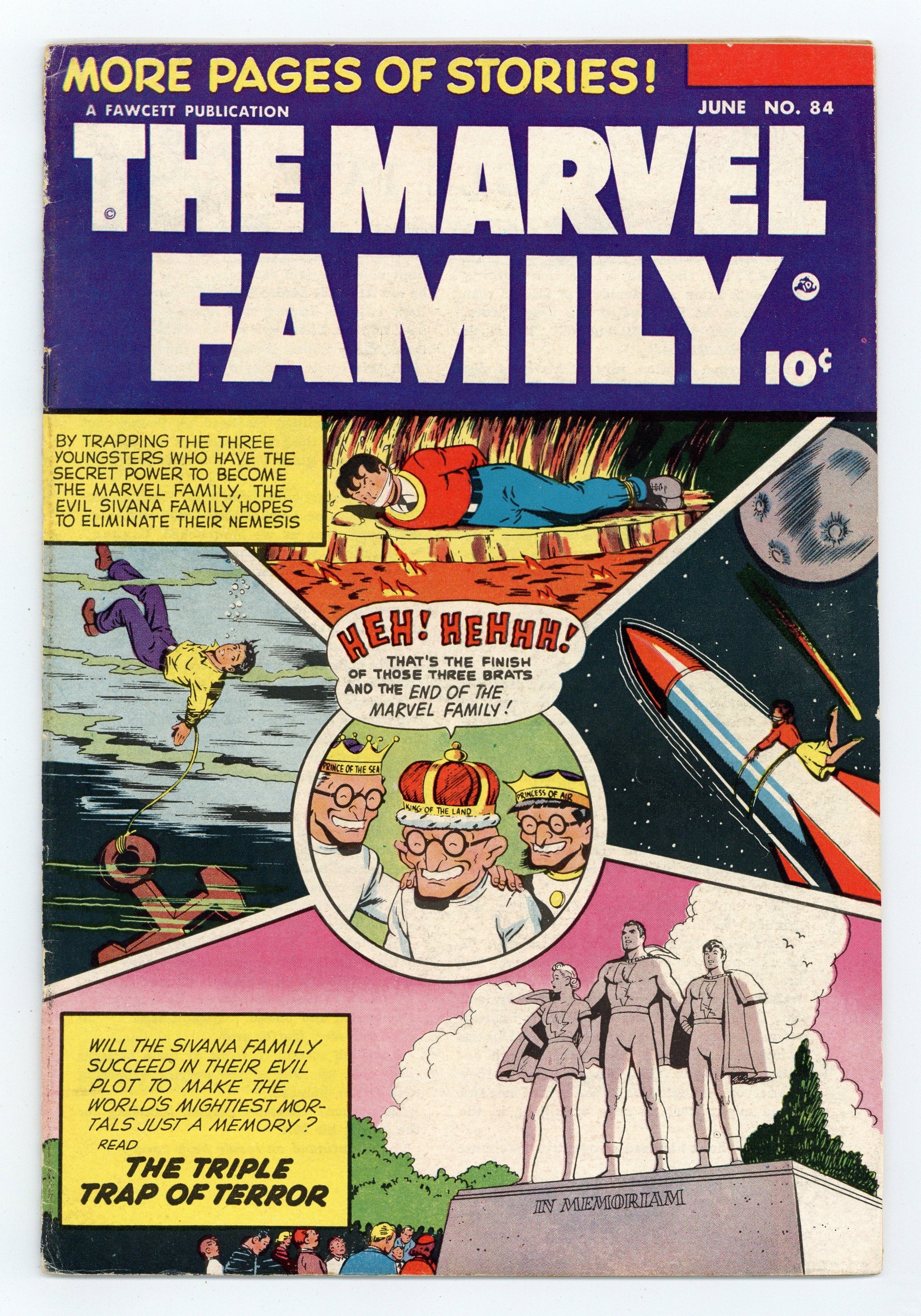 Starts Dec 22 Cover by Kurt Schaffenberger. Stories and art by Otto Binder, Kurt Schaffenberger, Art Helfant and Howard Boughner. Fawcett's most popular heroes, the original Captain Marvel (Shazam) and family, in solo and shared adventures. In a multi-part adventure, the Sivana family plots three different death traps for each of the three members of the Marvel Family in their human identities. This triple death-trap is the Golden Age swan song of the younger Sivanas, who don't appear again until the 1970s. The Triple Trap of Terror, Chapter One: The Sinister Sivana Scheme; Chapter Two: The Boiling Menace; Chapter Three: The Avalanche Terror; Chapter Four: Rulers of Land, Sea and Air; Jungle Fate; The Marvel Family Puzzle Page; Headline Harry: The Haunted House; Wilbur the Waiter; Dizzy Daisy; Rubbernose Randolph; Captain Marvel, Jr.: The Victim of Circumstances. 32 pages, Full Color. Cover price $0.10.