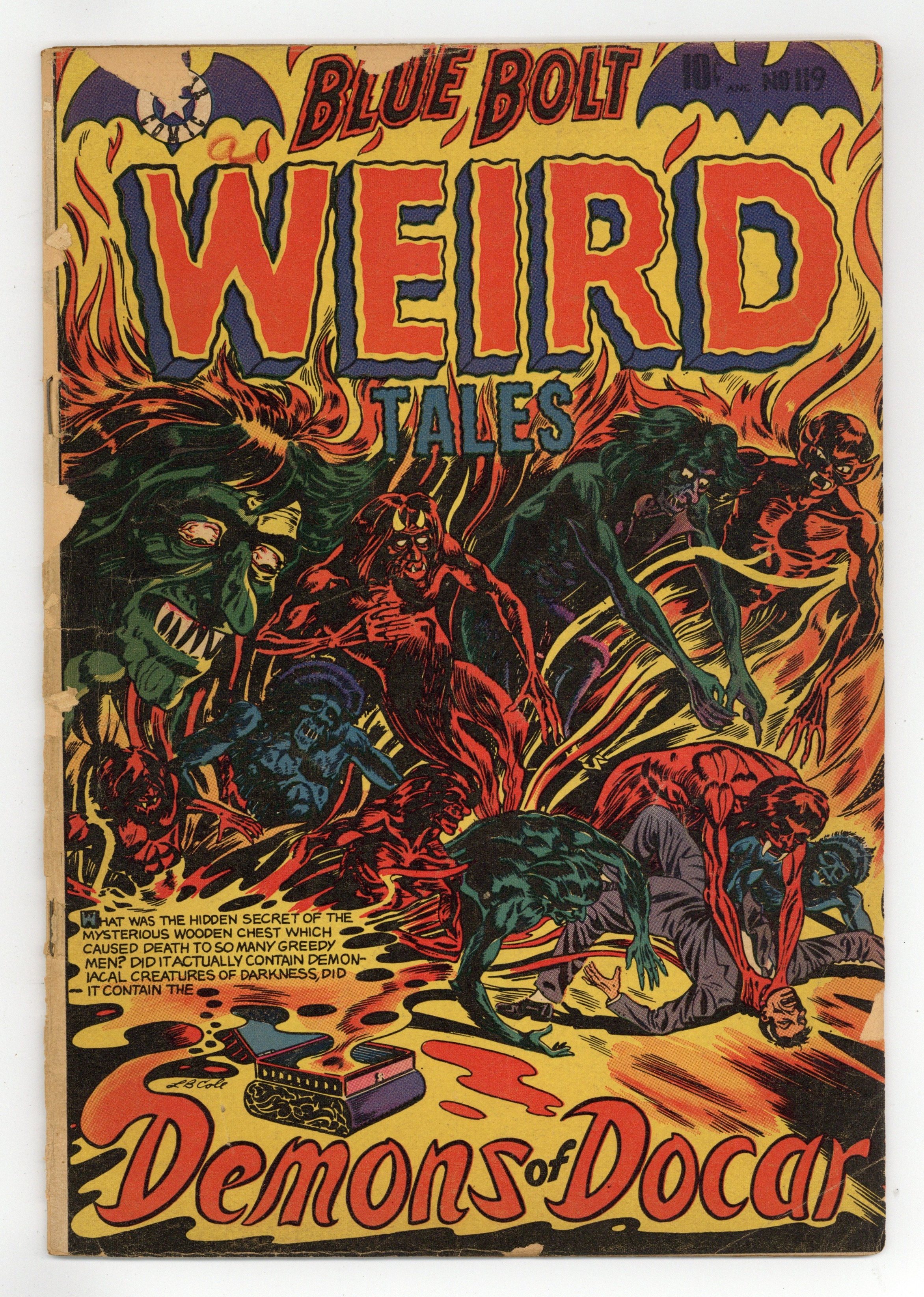 Starts Jan 3 Cover by L. B. Cole. Stories and art by Jay Disbrow and others. Pre-Code tales of horror and monsters, unofficially called Blue Bolt Weird Tales of Terror. Official indicia title for issues #117- 119 was Blue Bolt Weird Tales. Jeff Barton purchases a mysterious wooden chest at auction that, unknown to him, is all that binds a group of demons. American hero Jock MacReady discovers the nefarious plans of scientist Helmut Stefan during a cabaret performance in the American zone of occupied Germany. Jungle hero Jo-Jo and his mate Tanee discover a lost city in the Congo, but two inhabitants are already there. Demons of Docar; The Image; Die a Weird Death; Ghostly Tiger; Jo-Jo: Weird City. Final issue under this title; numbering continues with Ghostly Weird Stories (1953) #120. 36 pages, Full Color. Cover price $0.10.