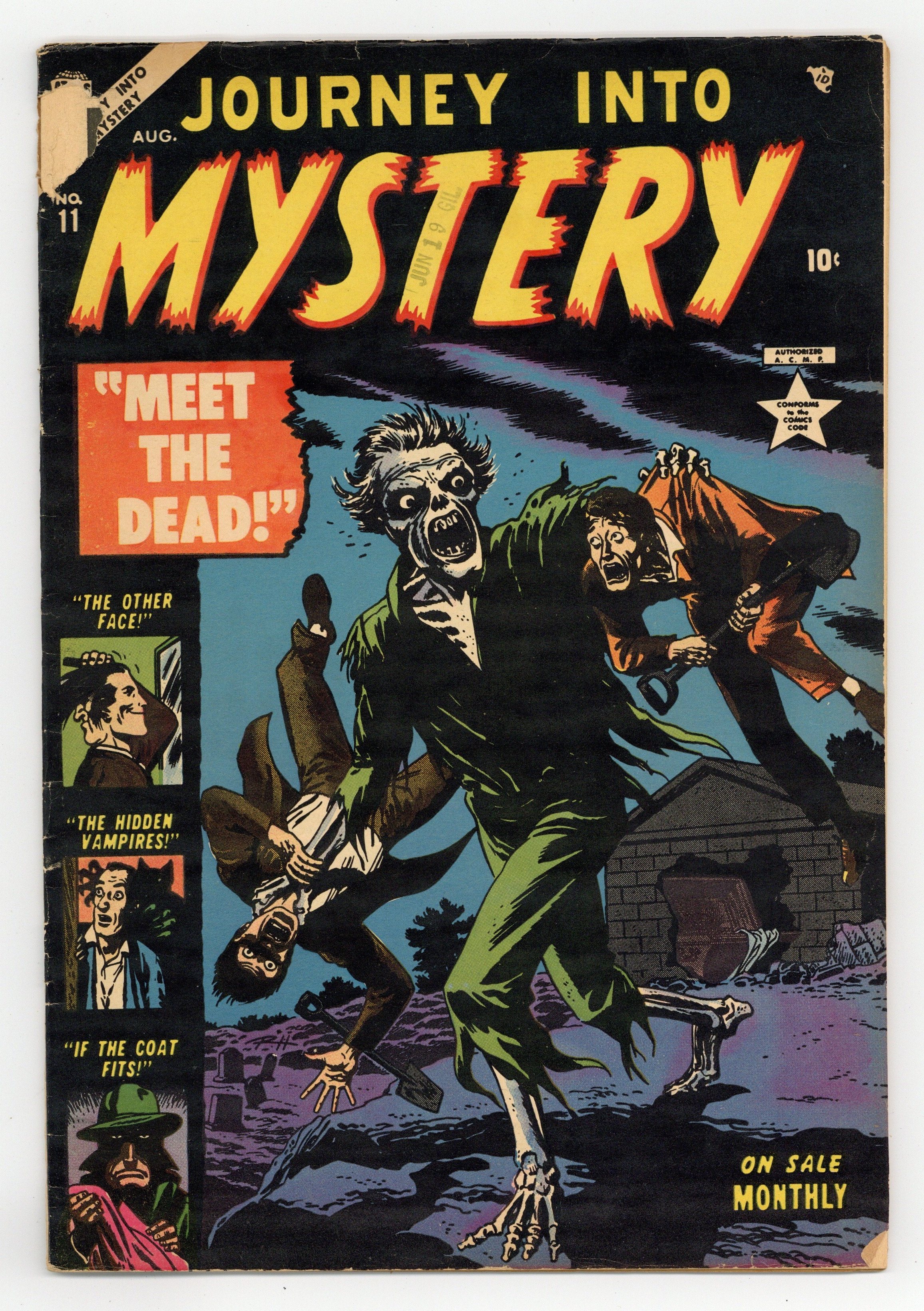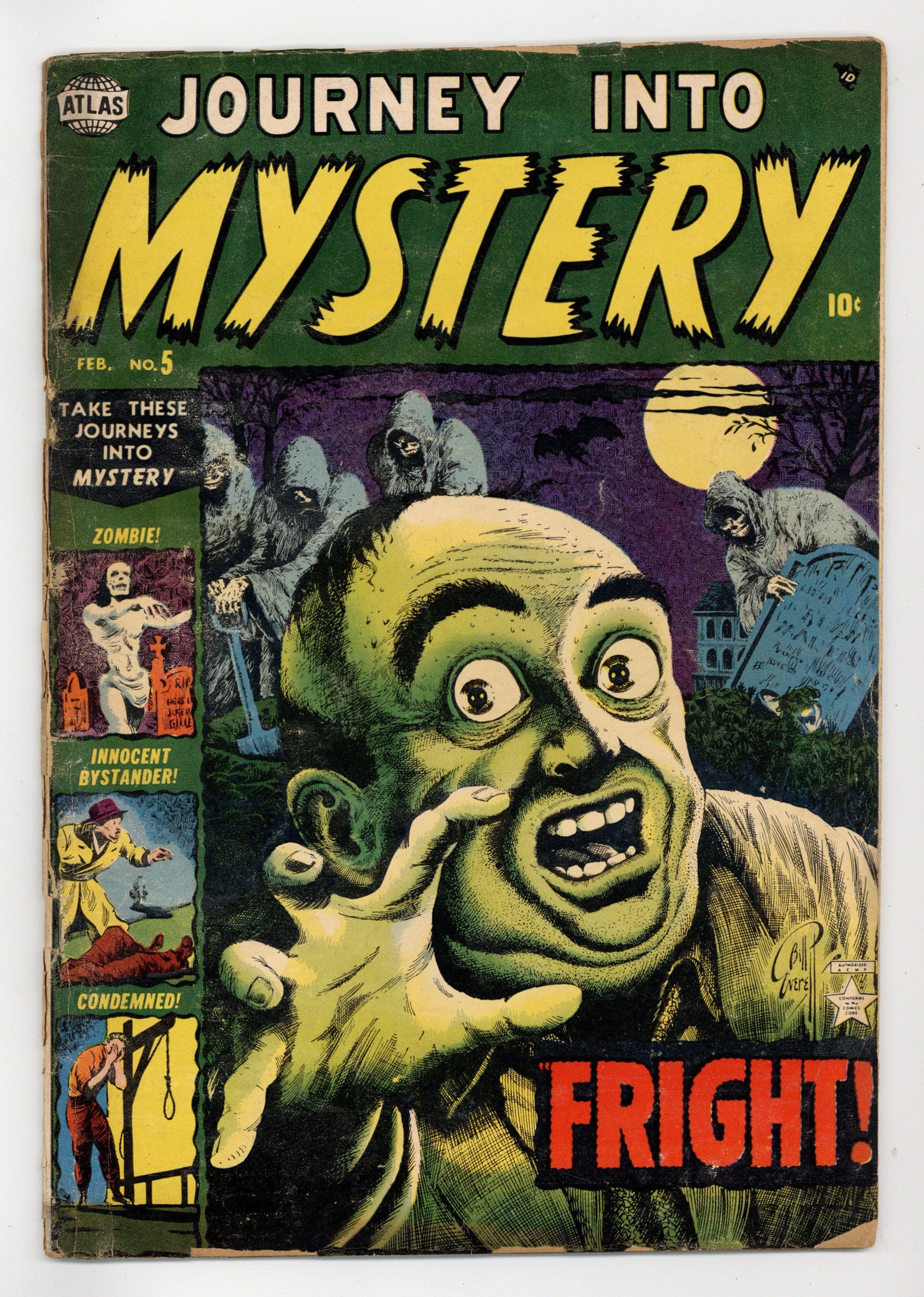 Starts Dec 15 Cover by Bill Everett. "Fright," script by Stan Lee, art by Russ Heath; A cruel asylum keeper is drugged by his assistant as he and the asylum keeper's wife wish to marry. "The Big Shoes" text story. "Zombie!," art by Tony DiPreta; In a Haitian village, a criminal named Blackie becomes afraid for his life when a man named Larson he framed for a crime has learned how to raise the dead and control the reanimated corpses as zombies; After a close brush with death when fighting off the zombie, Blackie decides to go and learn how to raise a zombie himself. "Condemned!," art by Carl Hubbell. "Innocent Bystander," art by Dick Briefer; A woman buys an antique statue that murders her in her sleep. 36 pgs., full color. $0.10. Cover price $0.10.