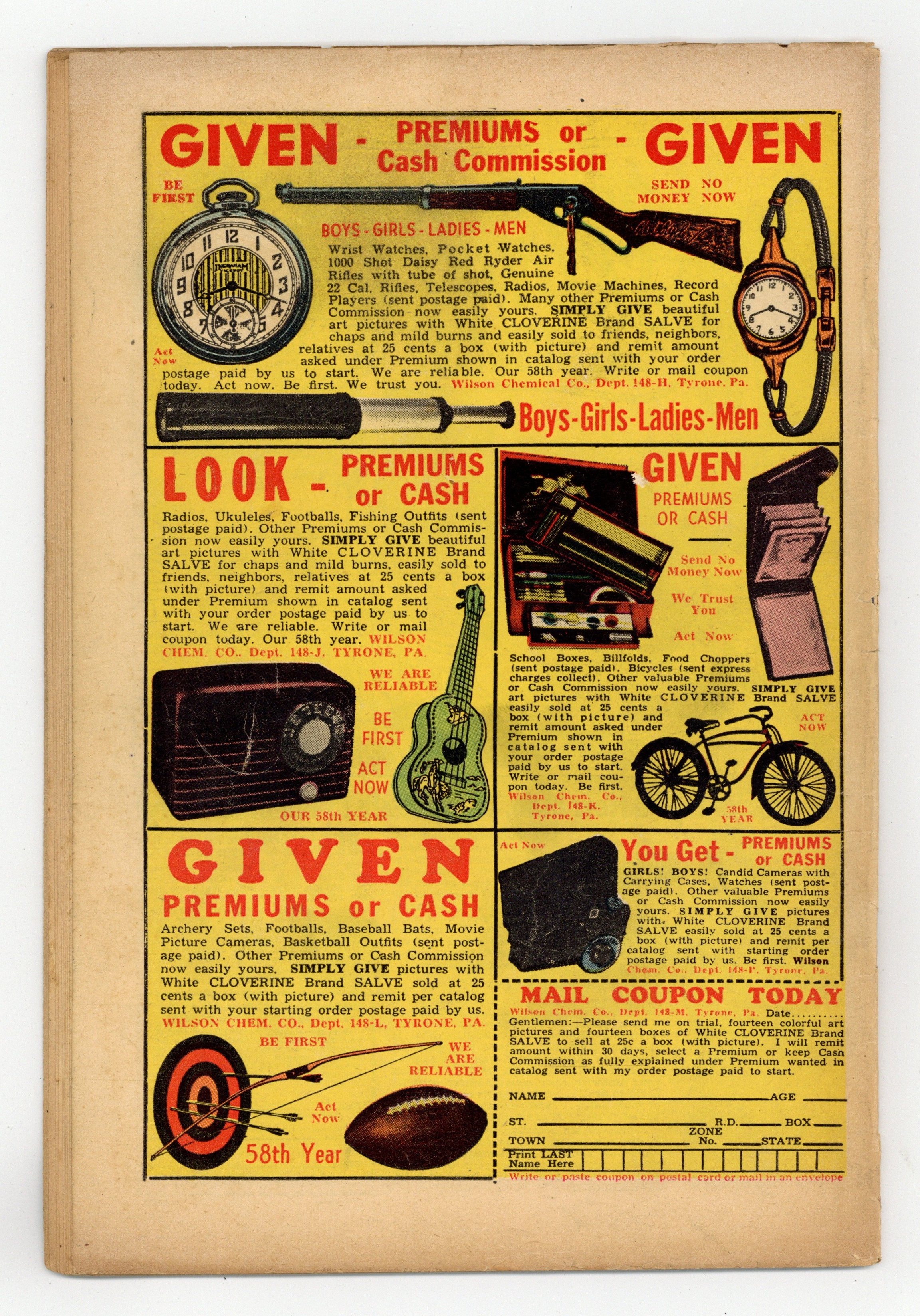 Starts Jan 3 Cover by Bud Thompson. Stories by Bill Woolfolk, Art Helfant and Howard Boughner. Art by Bud Thompson, Art Helfant, Howard Boughner, and Joe Certa. Superhero action with Freddy Freeman, who gains the same powers as his hero Captain Marvel, better known these days as Shazam. An ancestor of Freddy Freeman summons Captain Marvel Jr. to the past to rescue Robin Hood and his Merry Men from the Earl of Nottingham. Prof. Edgewise's latest invention is a gigantic vacuum cleaner which, like most Edgewise inventions, lacks a kill switch. Sucker Sam is the laziest crook ever. Getting His Goat; The Hammer of Hate; Judge Smudge; Rubbernose Randolph; Kanvasback: The Super Stupid Salesman; The Lazy Genie; In the Days of Robin Hood; The Lost Space Ship; The Great Vacuum. 32 pages, Full Color. Cover price $0.10.