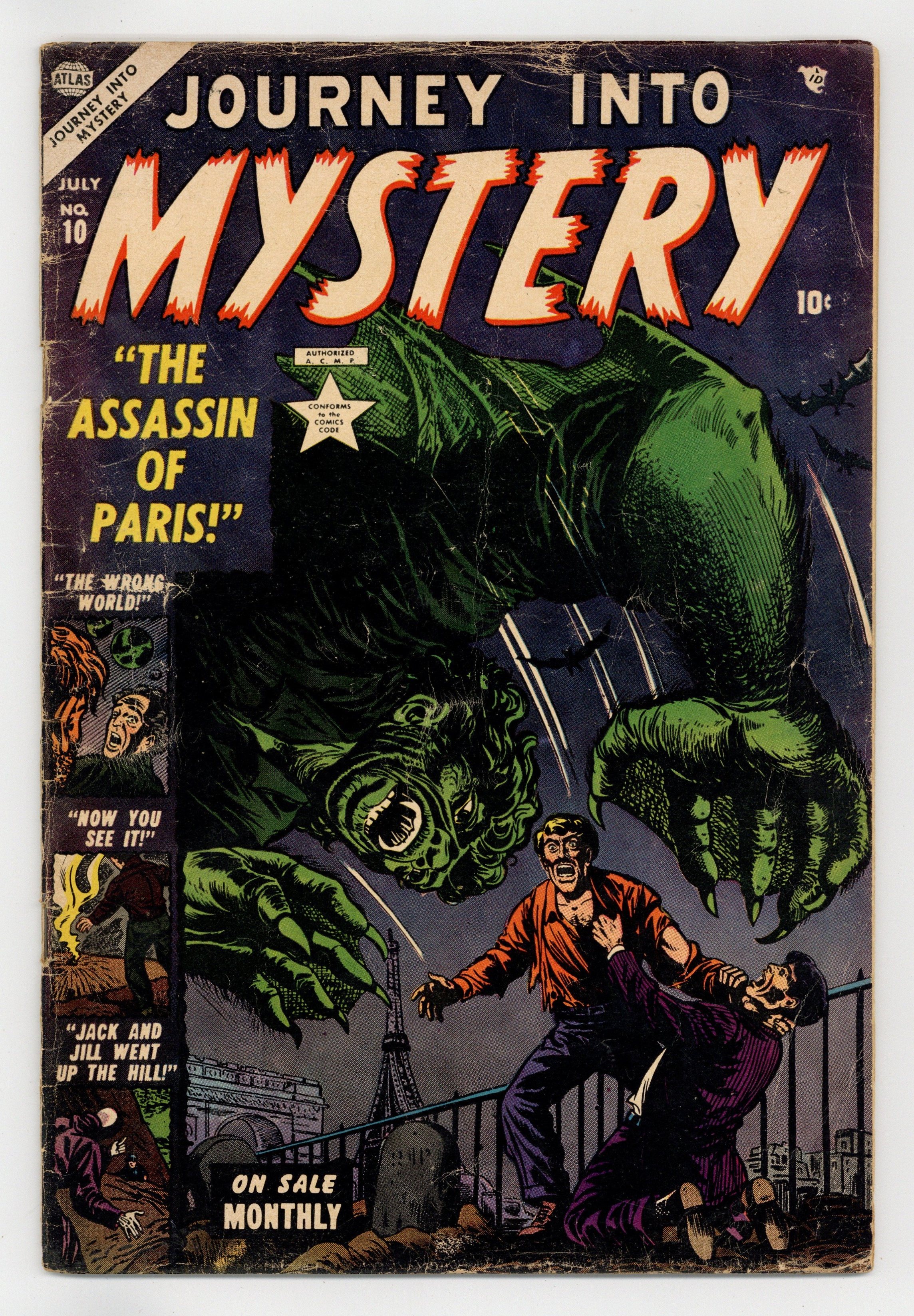 Starts Jan 3 Cover by Bill Everett. "Death!," script by Stan Lee, art by Russ Heath; When a scientist reanimates the body of a murder victim he has freshly killed in order to learn what death is like, his victim shows him by strangling him. "The Experiment" text story, art by Paul Reinman. "Wings of the Vampire!," script by Stan Lee, art by Ed Winiarski; A European village inspector thinks he is safe from the town vampire by locking himself inside the jail, but it turns out that is the vampire's hideout. "The Perfect Specimen!," art by Tony DiPreta; When a recruiting station tests what appears to be the perfect recruit they are surprised the x-ray results reveal him to be a robot. "The Man Who Went Back," script by Carl Wessler, art by Sam Kweskin; An escaped killer, due to be hanged, gets on a bus that moves forward in time so that the passengers age rapidly. "Till Death Do Us Part!," script by Carl Wessler, art by Mort Lawrence; A man who murders his wives for their money hooks up with a woman who just murders her husbands for kicks. 36 pgs., full color. $0.10. Cover price $0.10.