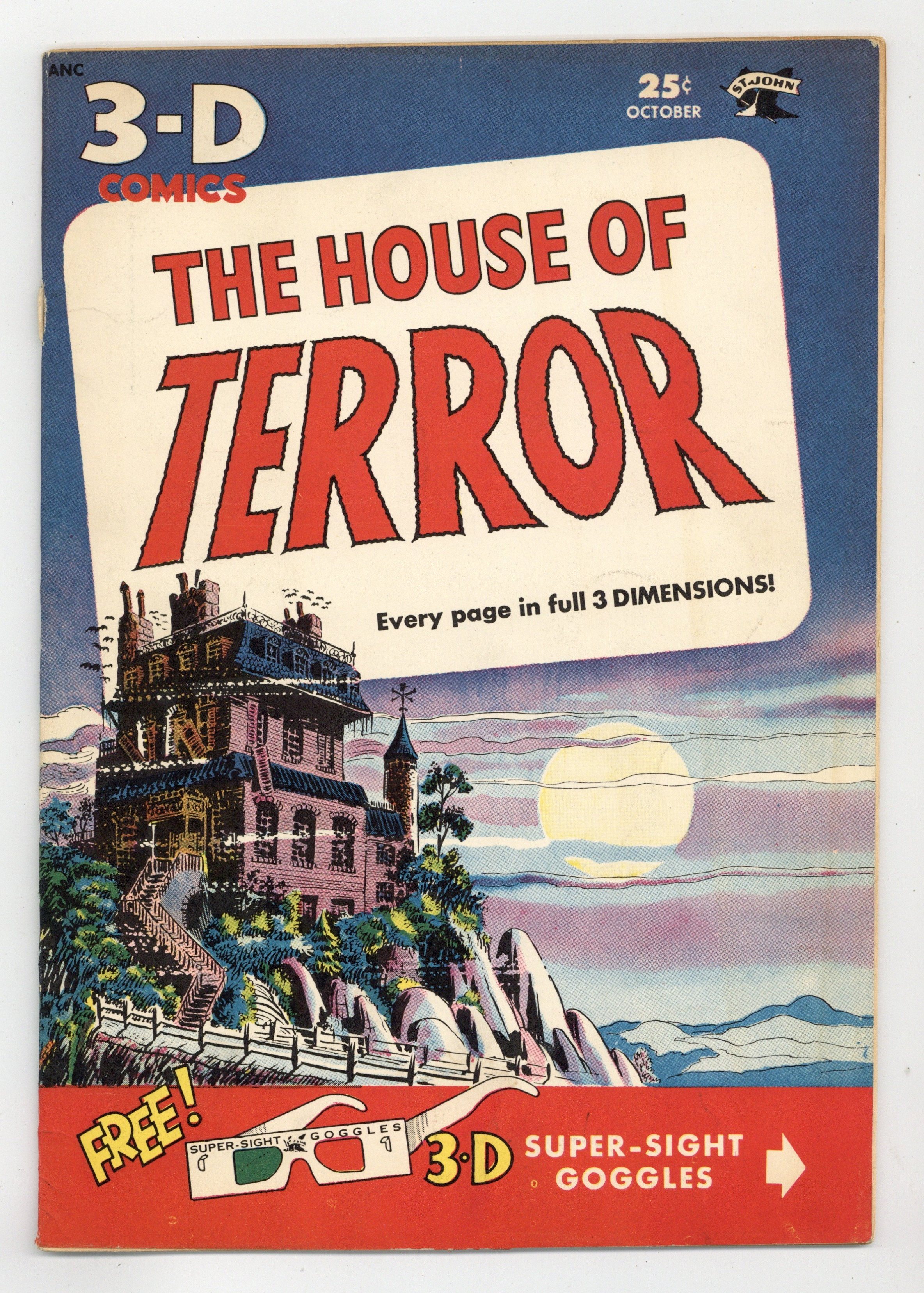 Starts Jan 26 Does not include original 3-D glasses. Cover by Joe Kubert. Stories and art by Joe Kubert, Les Zakarin and Enrico Bagnoli. Pre-Code horror from St. John featuring nice art by comics legend Joe Kubert and Enrico Bagnoli. St. John was a pioneer in 3-D comics during the original 3-D craze of the 1950s. Aspiring painter Henry makes a deal with the devil after he purchases a cursed painting, in a story with early art by comics legend Joe Kubert. In another Kubert story, robbers commit murder while fleeing police, then are pursued by the murdered man's spirit. A violinist falls under the spell of a cursed Stradivarius. Picture of Evil; The Violin of Death; The Curse of Khar; The Devil's Chair. 32 pages, B/W with 3-D effects. Cover price $0.25.