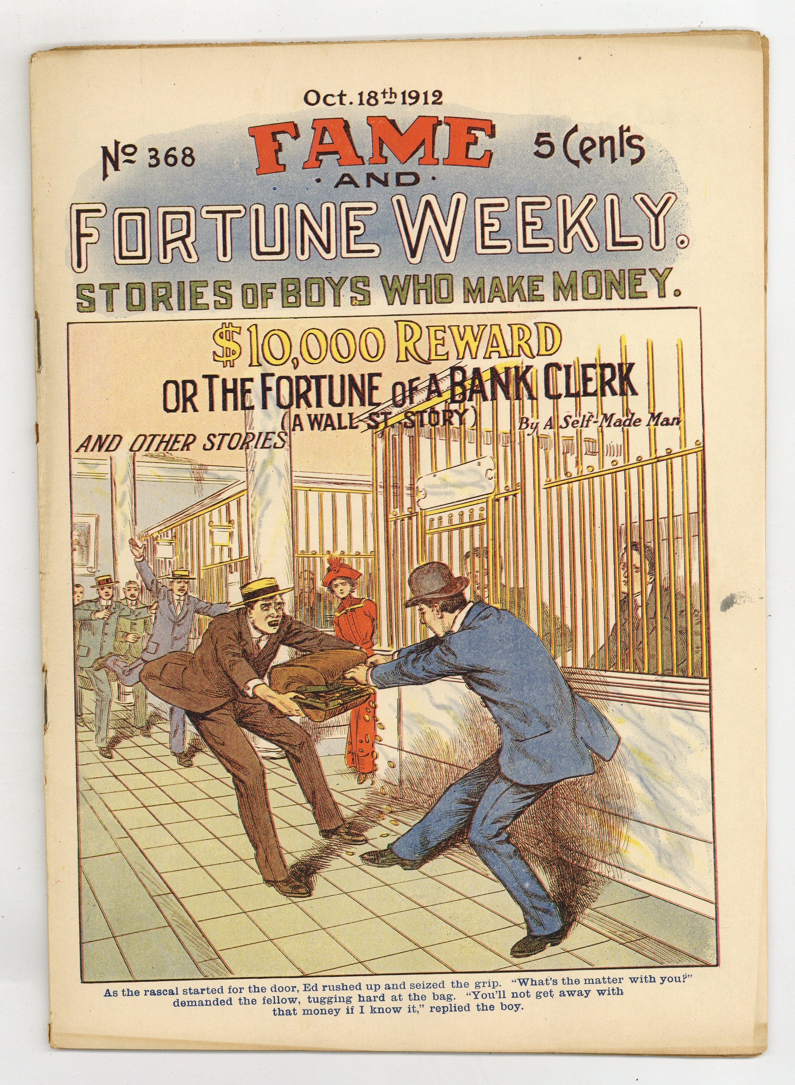 Starts Apr 4 October 18, 1912. $10,000 Reward; or, The Fortune of a Bank Clerk. 11" x 8", 36 pages. Cover price $0.05.