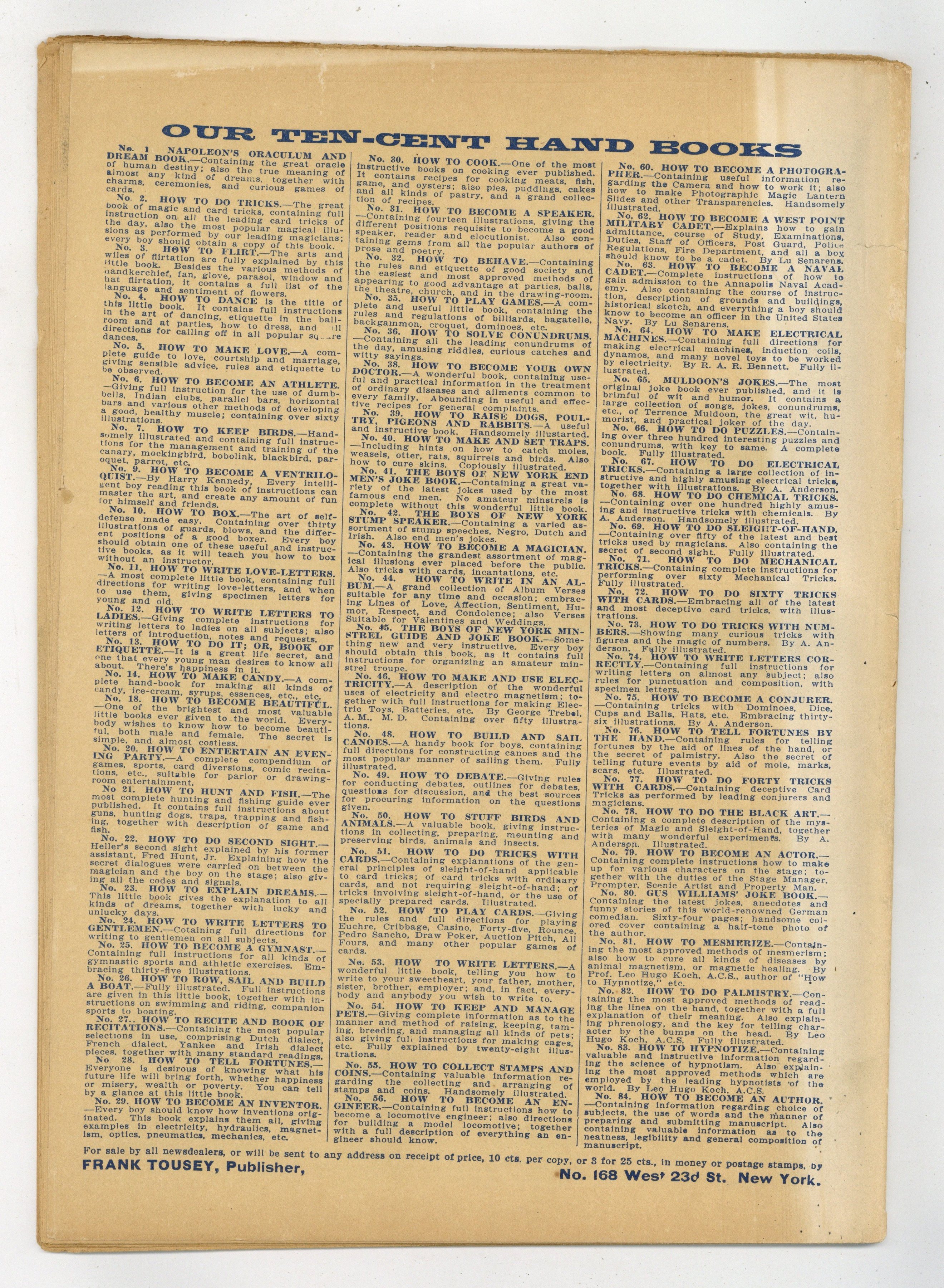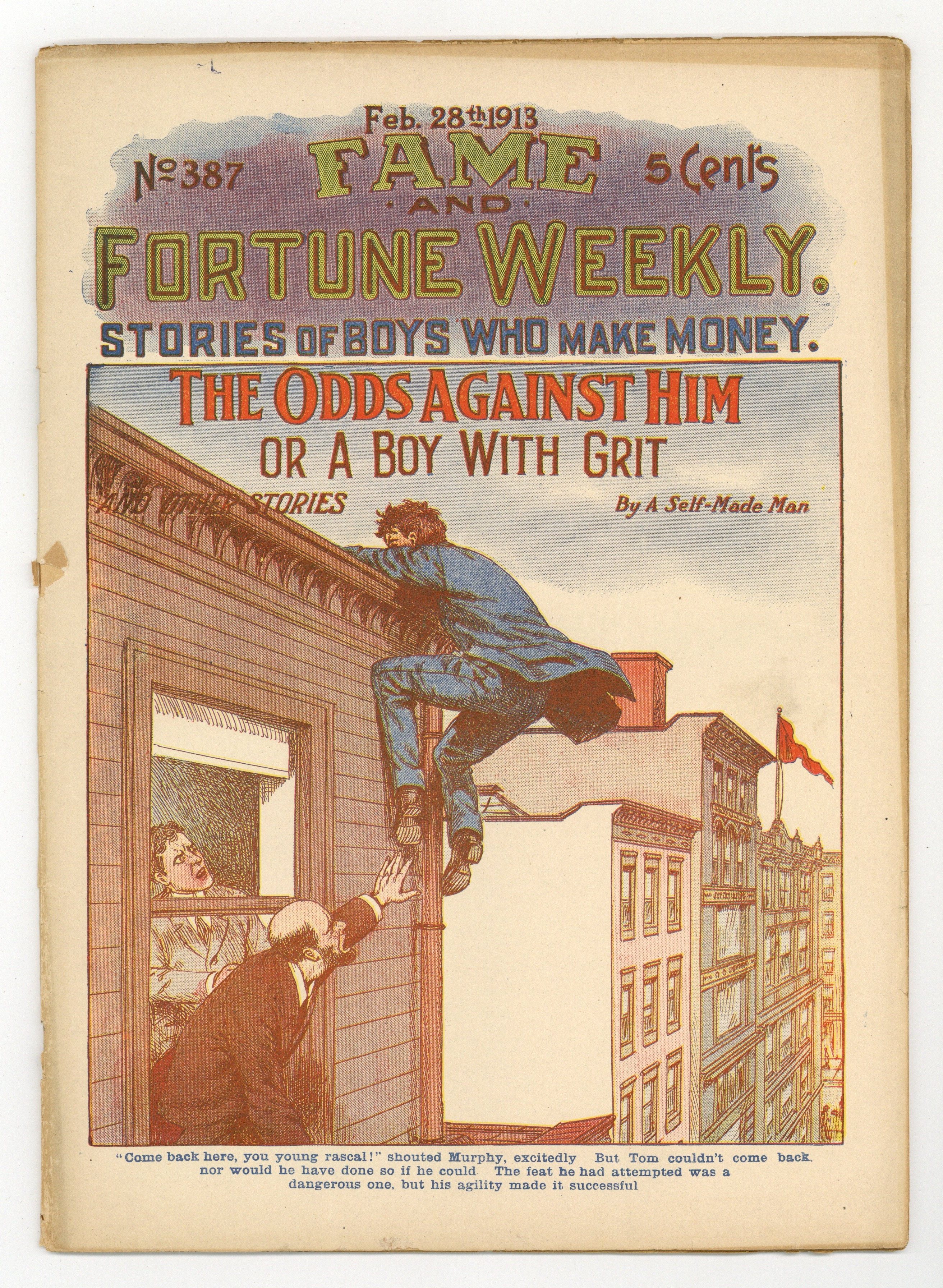 Starts Jan 3 February 28, 1913. The Odds Against Him; or, A Boy with Grit. 11" x 8", 36 pages. Cover price $0.05.