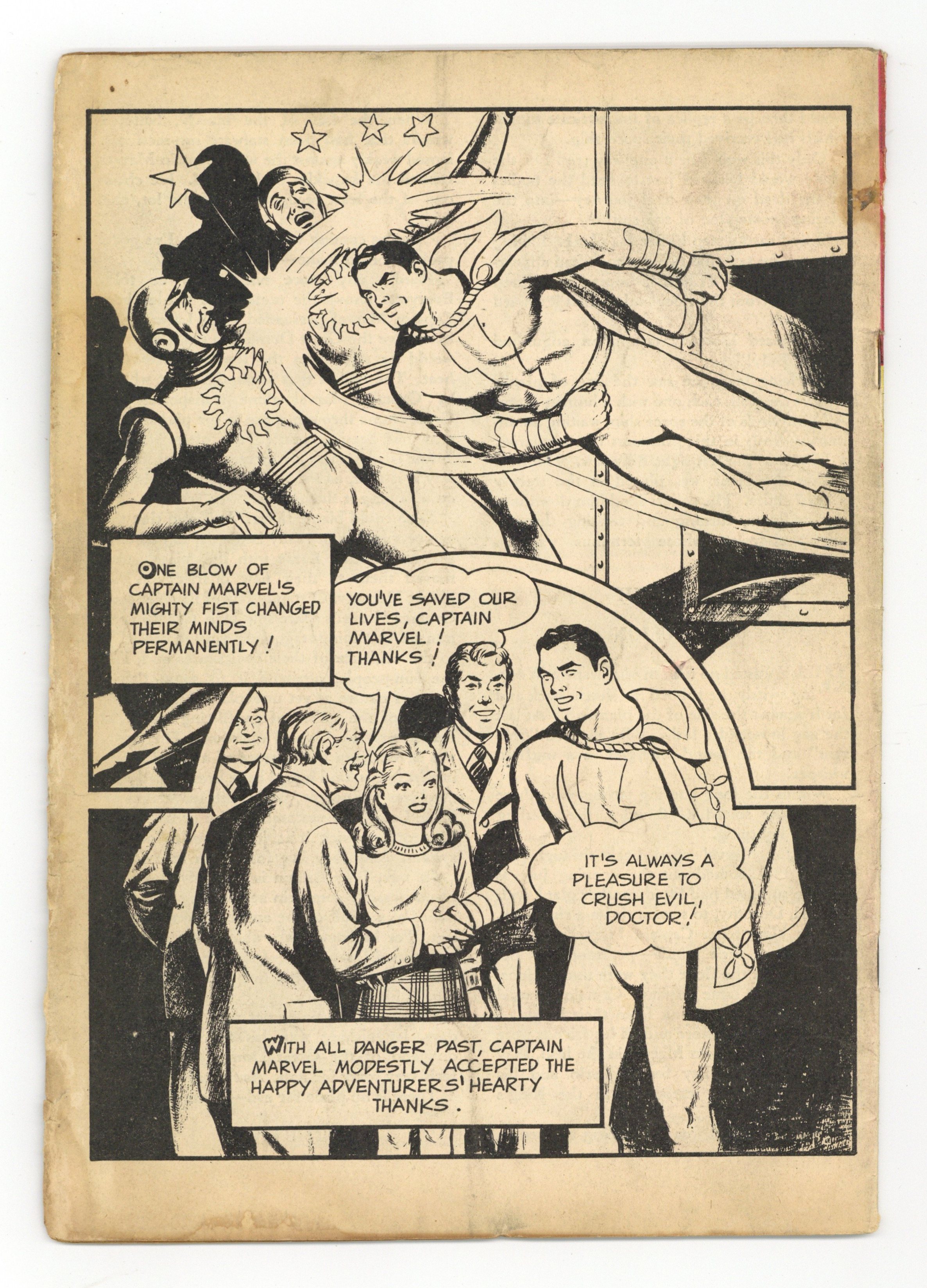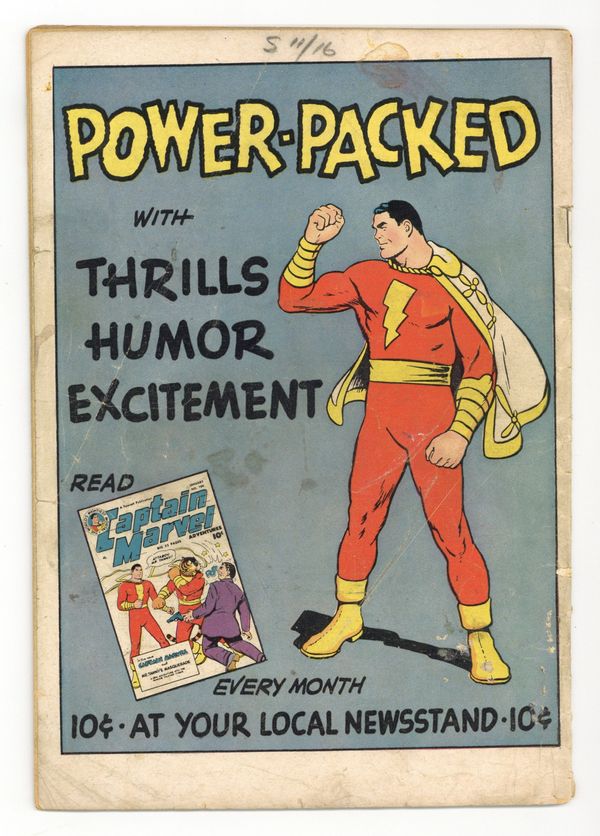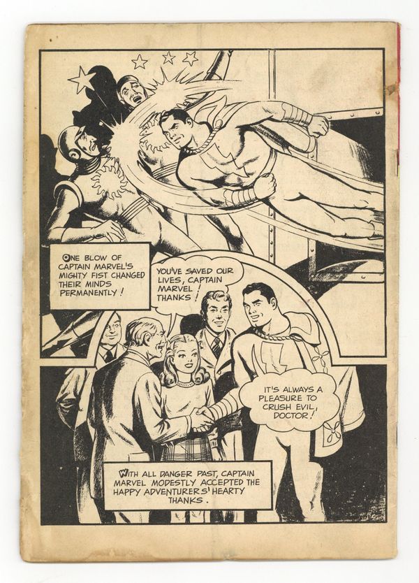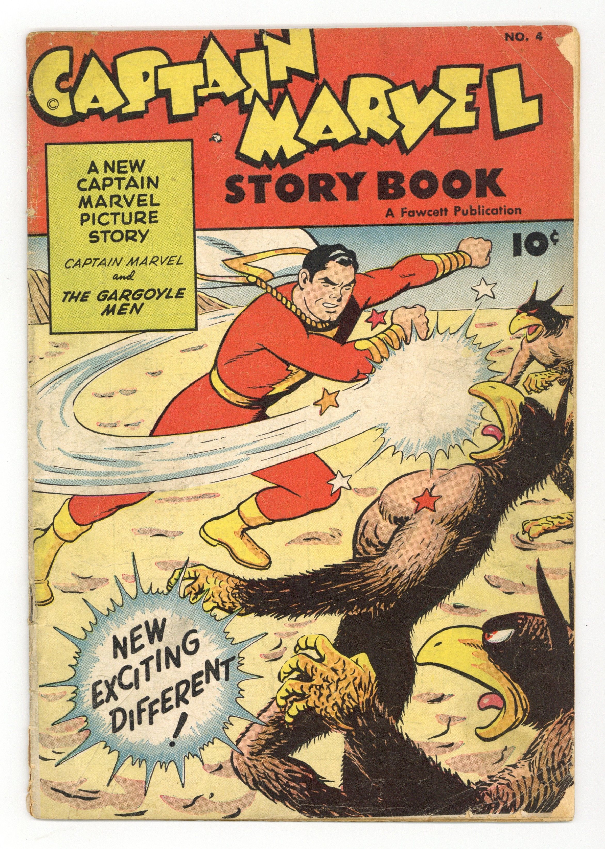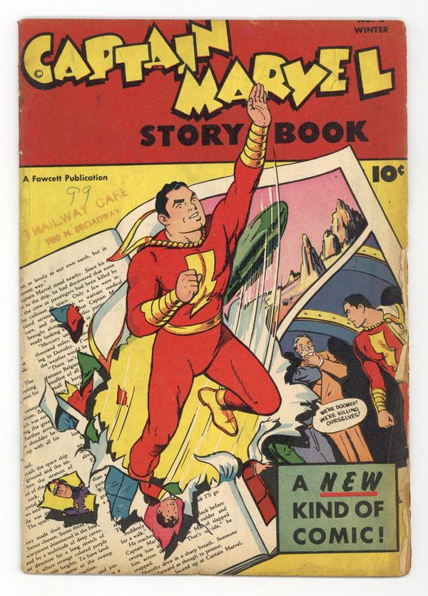Starts Jan 3 Cover by C. C. Beck and Pete Costanza. Stories and art by C. C. Beck, Pete Costanza and Al Liederman. The Captain Marvel Story Book featured an innovative combination of text and comics art, featuring great full-page illustrations by Shazam co-creator C.C. Beck. Billy Batson goes on assignment to Egypt, where Captain Marvel tries to uncover the secret of the Gargoyle Men. The desert trail leads to the beautiful but deadly Queen Ashtira, in an issue-length story, The Gargoyle Men. Final issue of the series. 32 pages, Full Color. Cover price $0.10.