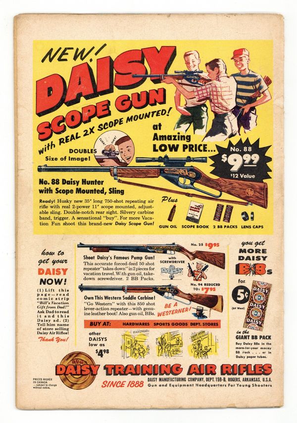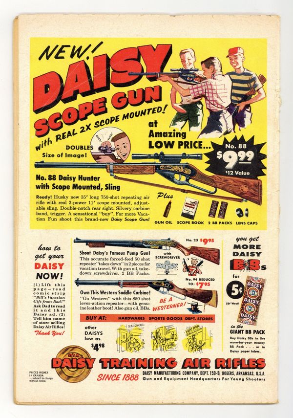 Ends Feb 23 9:48 PM CST Bid History 11 bids Current Bid $26 Your Secret Max Bid If you'd like to bid, please log in or register. Cover by Joe Maneely. "Gunfight at Rawhide Ridge!", script by Stan Lee, art by Joe Maneely; The Two-Gun Kid tries to stop an out of control stagecoach when he notices that there is no driver on board. "The Other Two-Gun Kid!", script by Stan Lee, art by Joe Maneely; The owners of the Rock River Bank are shocked when they are apparently robbed by the Two-Gun Kid, who gets away with the robbery. "Maverick," art by Alfonso Greene. "The Tribute" text story, art by Joe Maneely. "The Day the Kid Was Helpless!", script by Stan Lee, art by Joe Maneely; The Two-Gun Kid is in a saloon in the heart of the badlands where he watches over a card game between a man named Perkins and the Yarger brothers. 36 pgs., full color. $0.10. Cover price $0.10.