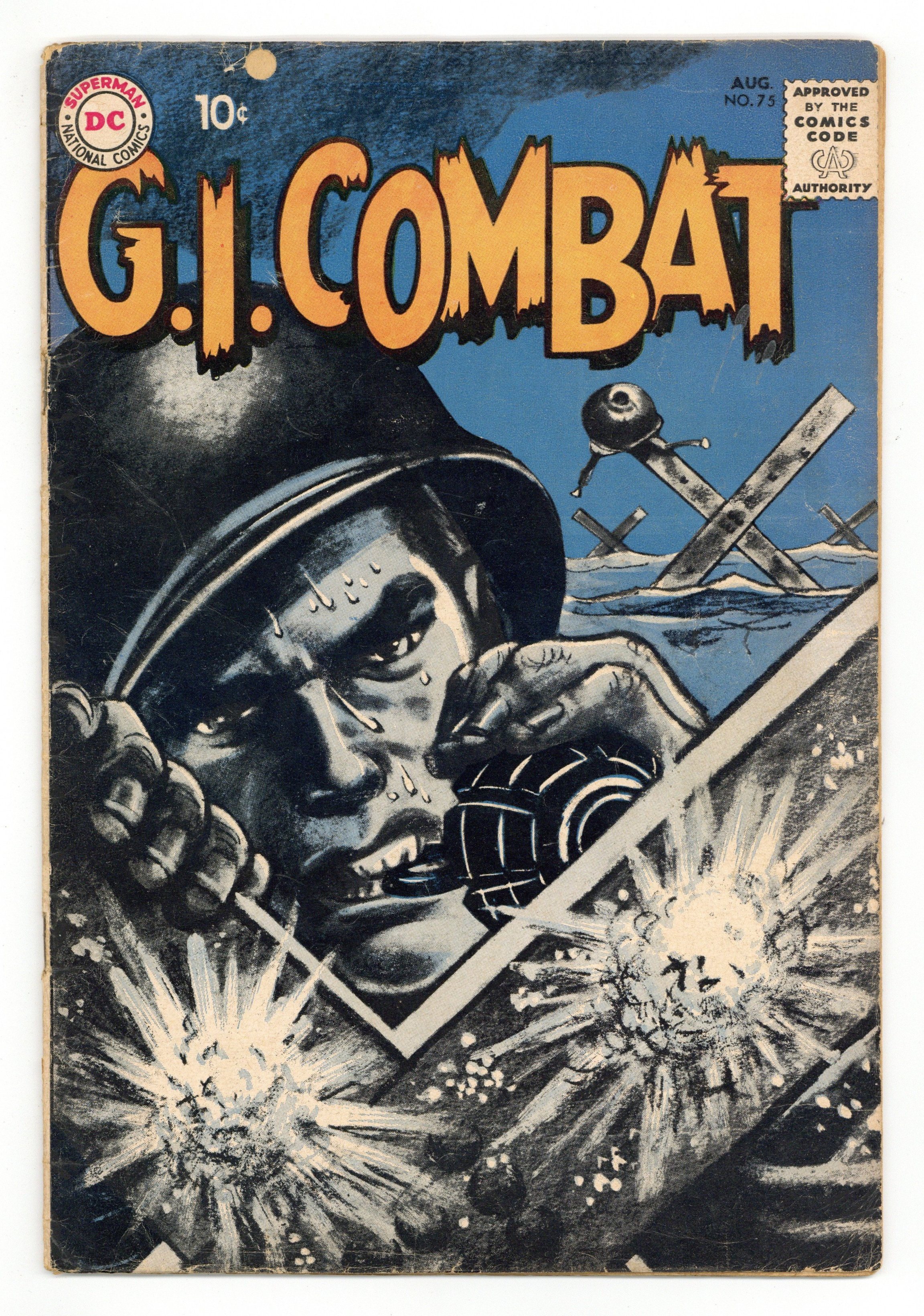 Ends Feb 23 9:15 PM CST Bid History 9 bids Current Bid $34 Your Secret Max Bid If you'd like to bid, please log in or register. Cover art by Jerry Grandenetti. T.N.T. Spotlight starring Mademoiselle Marie, script by Robert Kanigher, art by Mort Drucker. Khaki-Yaks humor page by Henry Boltinoff. School for a Frogman!, script by Bob Haney, pencils by Ross Andru, inks by Mike Esposito. To the Utmost Extent of our Power!, script and pencils by Morris Waldinger, inks by Tom Nicolisi; story of the 60th Infantry Regiment. Get One For Smitty!, script by Bob Haney, art by Joe Kubert. 36 Pages, Full Color. Cover price $0.10.
