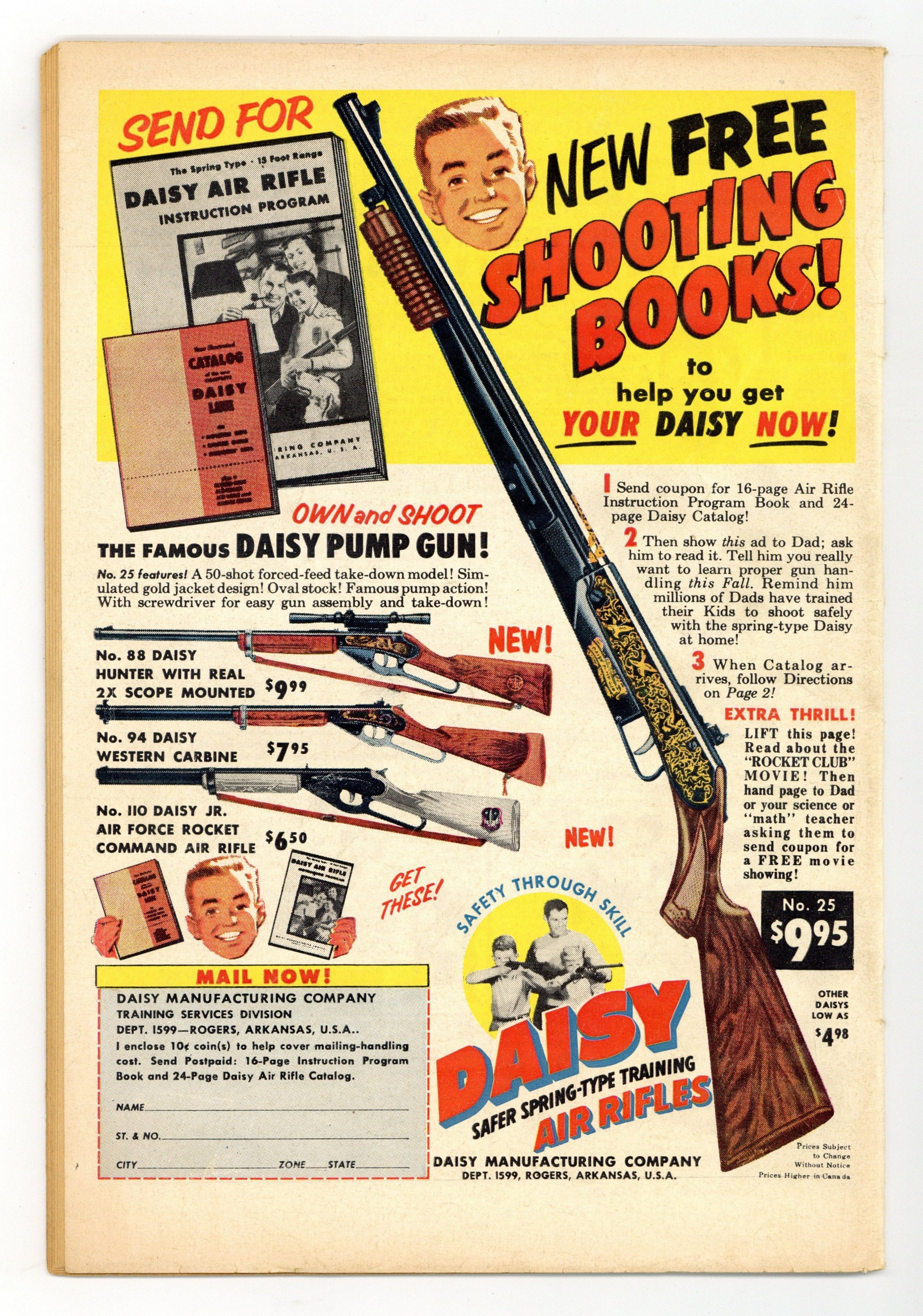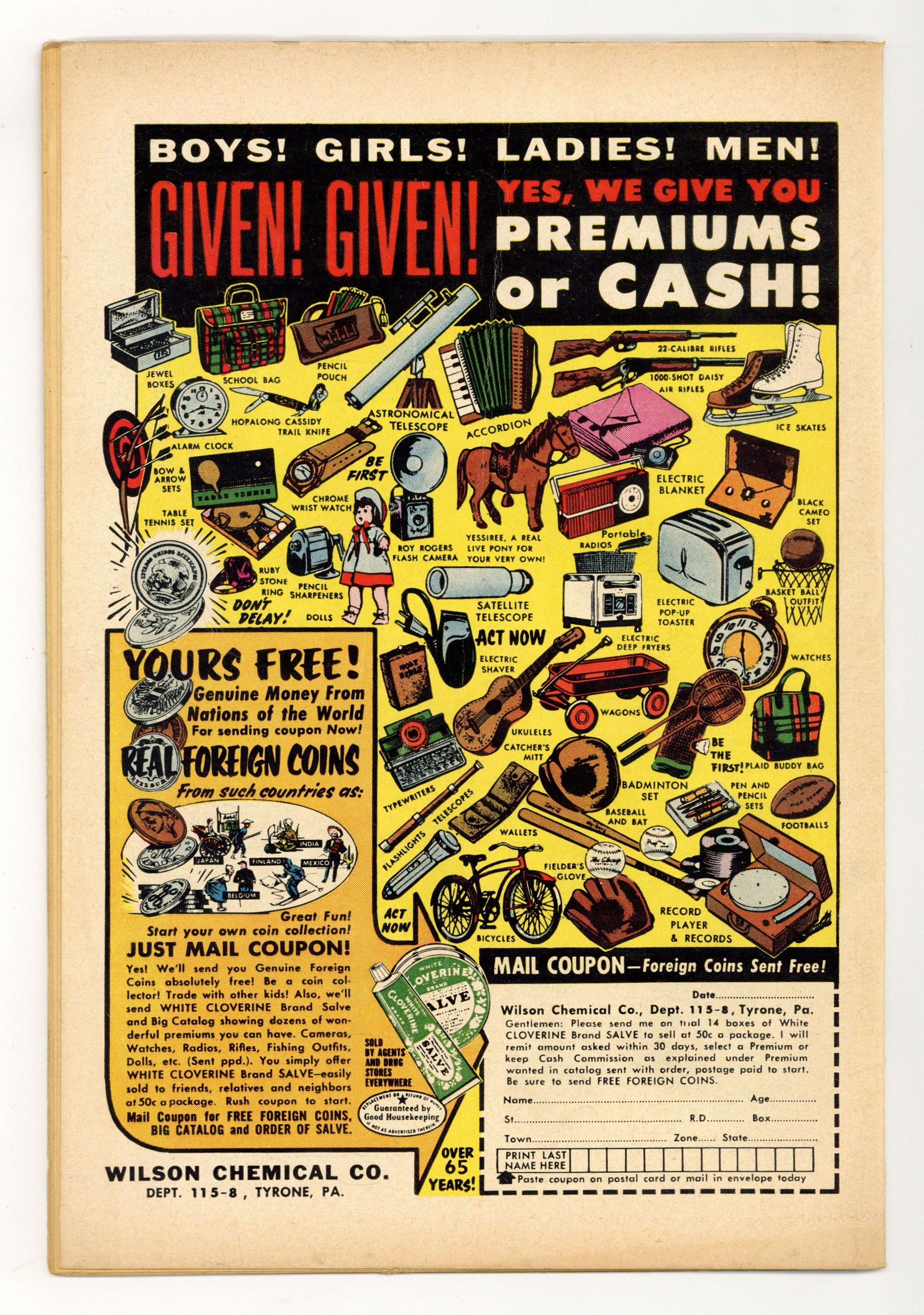 Starts Mar 2 Cover by Sheldon Moldoff. "The Interplanetary Batman," script by Bill Finger, art by Sheldon Moldoff; Batman and Robin spot an alien being in need of help, and by doing so, get captured and transported to a strange planet. The Atom Servant of Man public service announcement, script by Jack Schiff, inks by Tommy Nicolosi. "The Million Dollar Puzzle," script by Bill Finger, pencils by Sheldon Moldoff, inks by Charles Paris; The Caped Crusaders are hot on the trail of some auction items that were stolen, each of which are clues to the location of $1,000,000! One-page Warden Willis story by Henry Boltinoff. "The Batman Baby," script by Bill Finger, pencils by Sheldon Moldoff, inks by Charles Paris; Batman is given a baby to protect from danger and learns the child belongs to the Prince and Princess of Morania; When the baby is kidnapped, Batman follows the kidnapper, saves the Royal family and the child. 36 Pages, Full Color. Cover price $0.10.