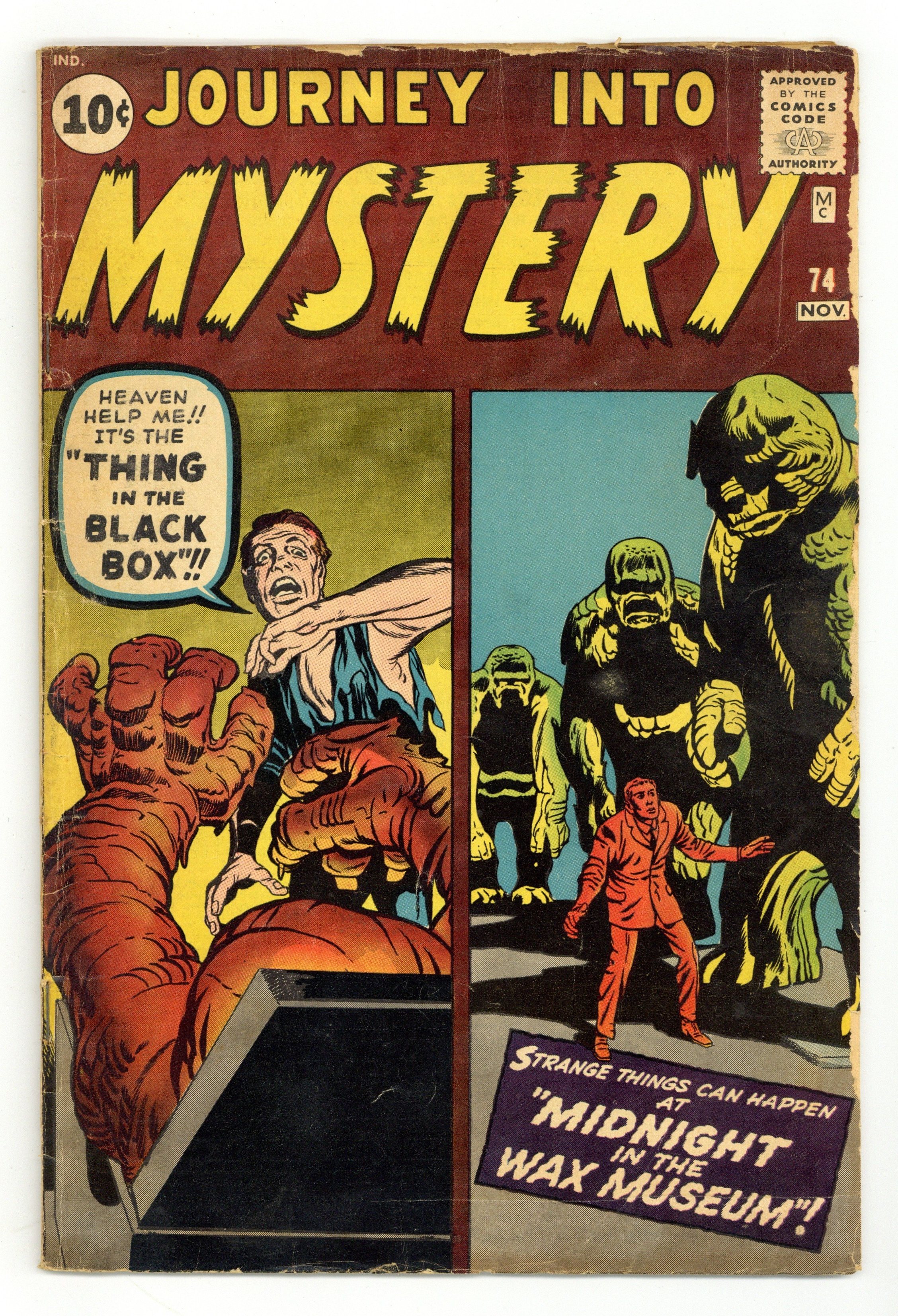 Starts Mar 9 Cover pencils by Jack Kirby, inks by Dick Ayers. "The Thing in the Black Box!," pencils by Jack Kirby; A shipwrecked man meets the legendary Pandora, who tricks him into releasing the demons from her box. "The Remedy Oil" text story, art by Marie Severin. "Midnight in the Wax Museum," pencils by Jack Kirby; An artist falls asleep in a wax museum and after midnight he is awoken by a sound; When he investigates, he finds that the wax figures are really aliens who are observing humans. "The Mechanical Men!," script by Stan Lee, art by Steve Ditko; An alien plot to infiltrate Earth with robotic dolls is unwittingly foiled by a police officer trying to get rid of peddlers. "Forever Is a Long Long Time!," art by Don Heck; A greedy businessman bullies a scientist into giving him a device that can give humans the 1,000-year lifespan of a giant redwood. 36 pgs., full color. $0.10. Cover price $0.10.