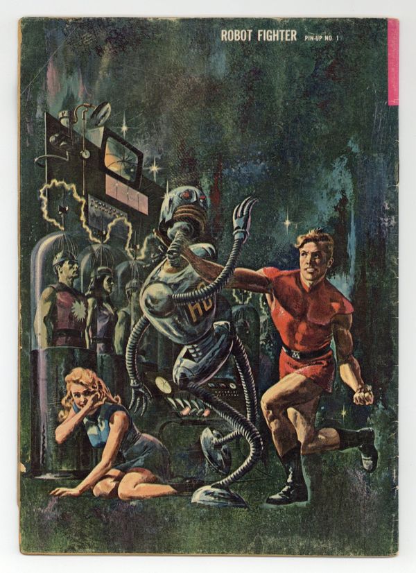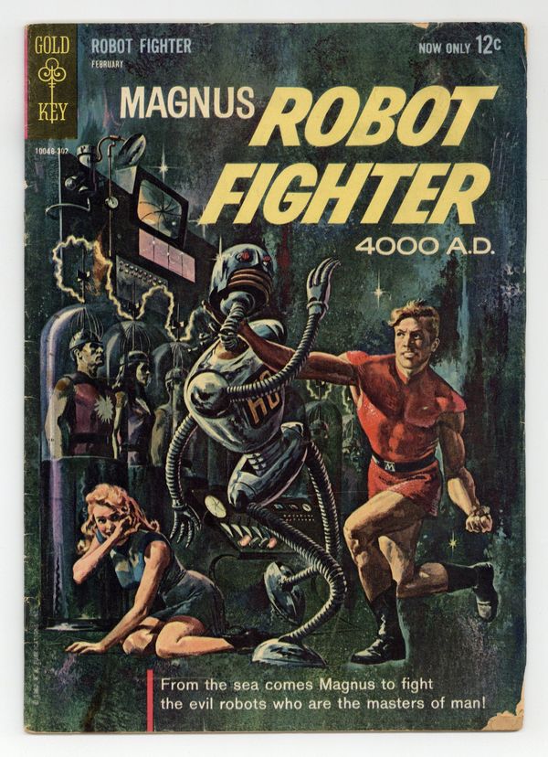 Starts Jan 3 Cover art by Russ Manning (sketch) and George Wilson (painted). Origin and first appearance of Magnus Robot Fighter in "Magnus, Robot Fighter," script and art by Russ Manning; 1A takes Magnus to North Am where he begins his crusade against evil robots by stopping the Polrob Chief H8. "The World of the Future" article on the prophecies of Nostradamus. "The Aliens," script and art by Russ Manning; For the first time, an Earth ship meets an alien ship, which attacks with missiles; The Earthmen would jump-drive for home, but the aliens follow; To safeguard Earth's location, Captain Johner must destroy the enemy; The aliens are saucer-headed loop-limbed giants captained by Zarz, who also must protect his planet. Robot Fighter Pin-Up No. 1on back cover, art by Russ Manning (sketch) and George Wilson (painted). # on cover 10046-302. February. #1 2/63. 36 pgs., full color. Cover price $0.12.