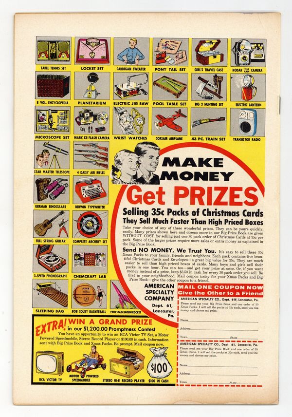 Ends Dec 22 7:10 PM CST Bid History 4 bids Current Bid $8 Your Secret Max Bid If you'd like to bid, please log in or register. Cover by Al Plastino. "Superman Loses His Powers," script by Jerry Coleman, pencils by Wayne Boring, inks by Stan Kaye; Exposure to ancient Atlantean experiments gives Bart Wellins super-powers and Superman can't stop him because exposure to the same experiments have increased his powers so much, he doesn't dare to use them at all. "The Jungle Journal," script by Jack Miller, art by Nick Cardy. One-page Ollie story by Henry Boltinoff. Adventures in Coin Collecting article. Supermen of America ad. One-page Lem 'n' Lime story by Henry Boltinoff. 36 Pages, Full Color. $.10 Cover price $0.10.
