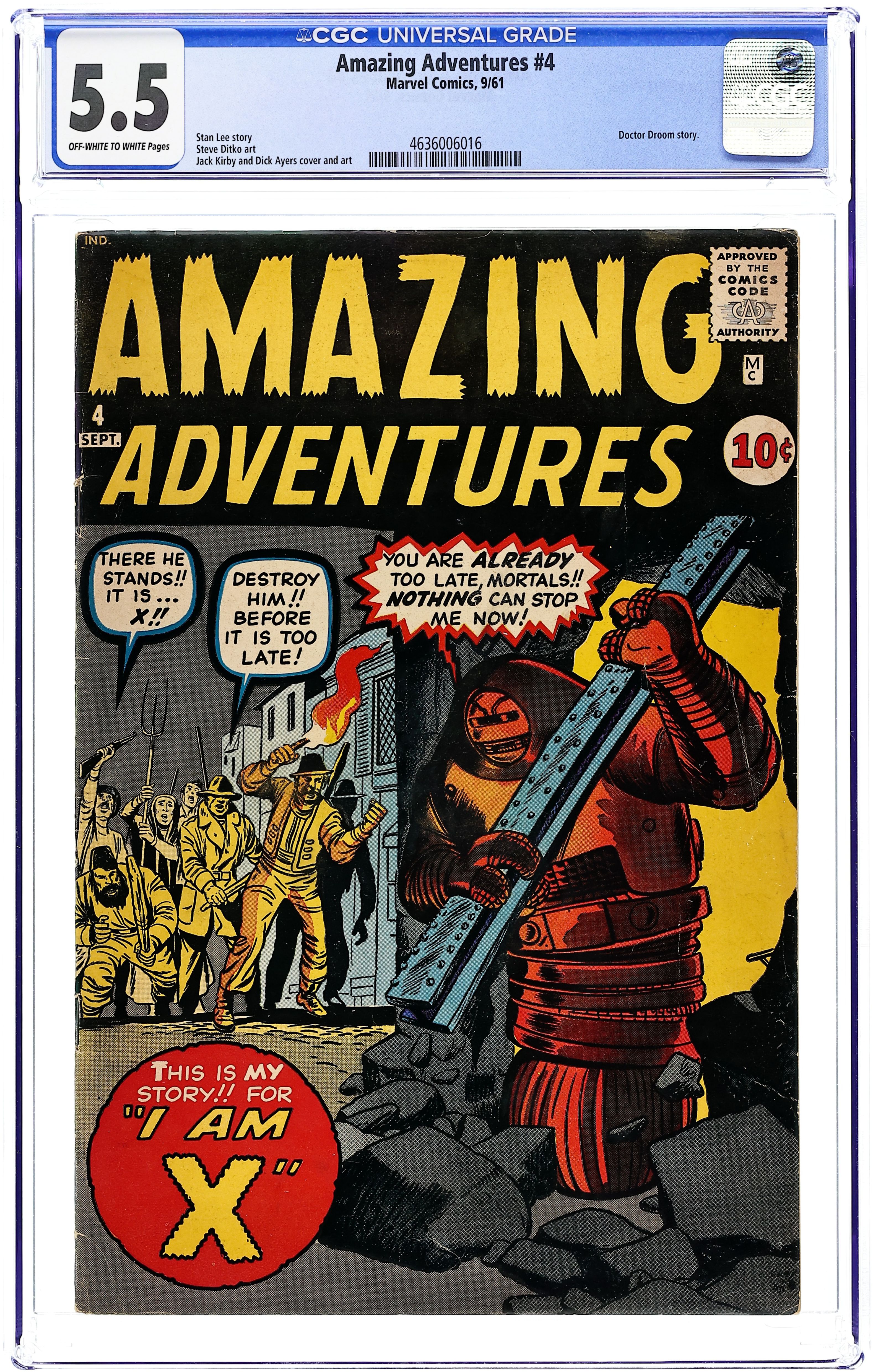 Starts Apr 4 Cover pencils by Jack Kirby, inks by Dick Ayers. I Am Robot X, script by Stan Lee, pencils by Jack Kirby, inks by Dick Ayers; The creation of sentient robots provokes a demagogic campaign revealed to be the work of Martian spies. The Pact text story, art by Joe Maneely. Who or What Was...the Bootblack?, script by Stan Lee, art by Steve Ditko; Simon Sledge is a cruel and heartless businessman who delights in making others suffer; On the way to the biggest deal of his life, one that will eliminate the last of his competition, he stops for a shoeshine; Suddenly his feet are moving away from his destination, taking him far from the deal that will give him a monopoly in his field. What Lurks Within? starring Doctor Droom, script by Stan Lee, pencils by Jack Kirby, inks by Dick Ayers; Doctor Droom frightens off alien invaders by convincing them that a construction sites wrecking ball is a life-form. 36 pgs. $0.10. Cover price $0.10.
