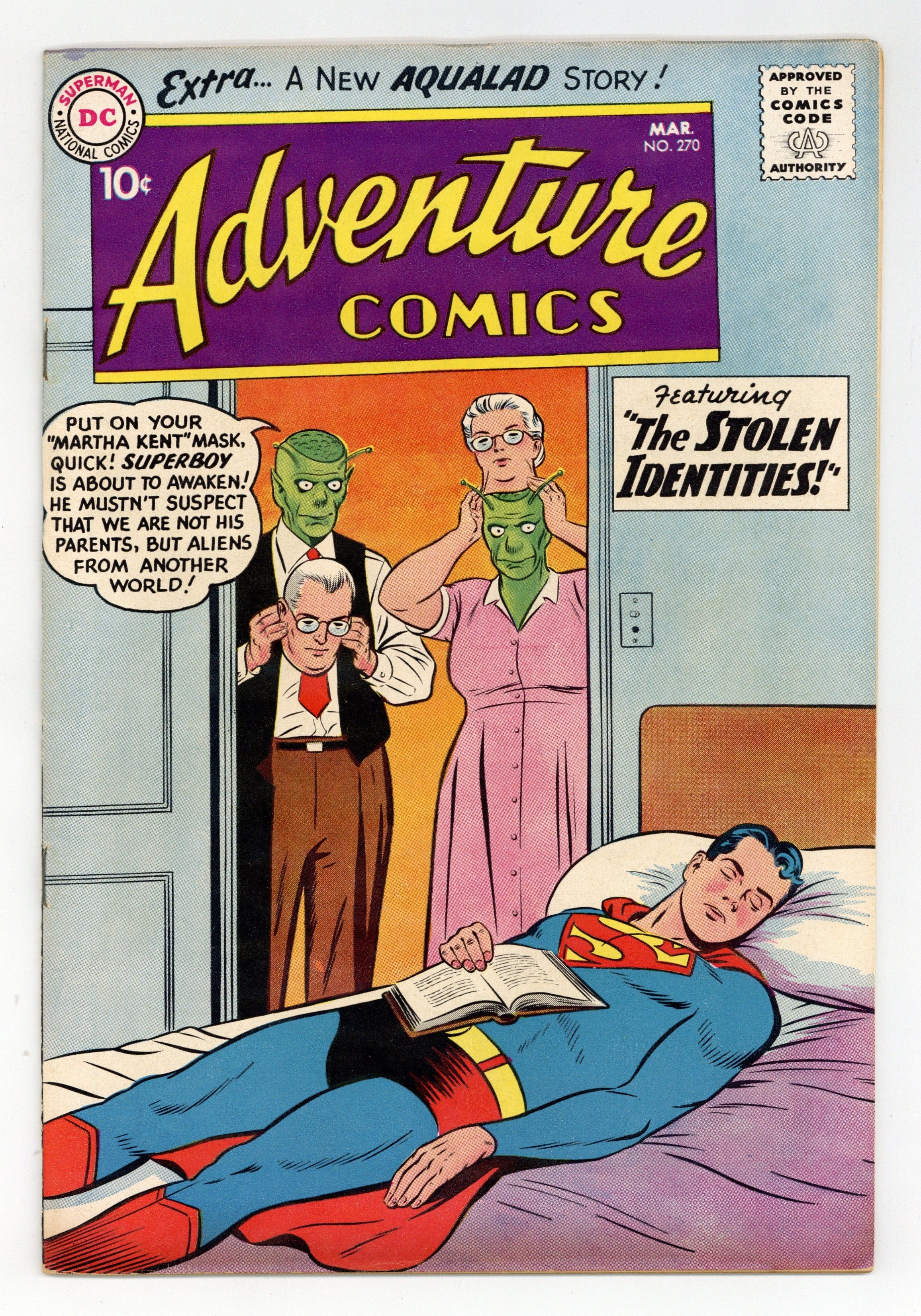 Starts Jan 19 Cover pencils by Curt Swan, inks by Stan Kaye. The Stolen Identities, script by Jerry Siegel, art by George Papp; Two Xelthunians secretly replace Ma and Pa Kent to perform a secret mission, not knowing that the Kents are Superboy's foster parents; After Ma Kent unwisely mentions Superboy's vulnerability to kryptonite, the Xelthunians power the transporter ray they plan to use to send Superboy to their planet with red kryptonite and it turns him into a fat Boy of Steel, a bullet-sized Boy of Steel, and a giant Boy of Steel. The Ninth Wonder starring Congorilla, script by Robert Bernstein, art by Howard Sherman; In his Adventure Comics debut, Congorilla stops river pirates, frees a kidnapped scientist, and stops an attack by the Wambus, all before a retelling of his origin. Casey the Cop humor page by Henry Boltinoff. The Menace of Aqualad! starring Aquaman, script by Robert Bernstein, art by Ramona Fradon. 36 pages, Full Color. Cover price $0.10.