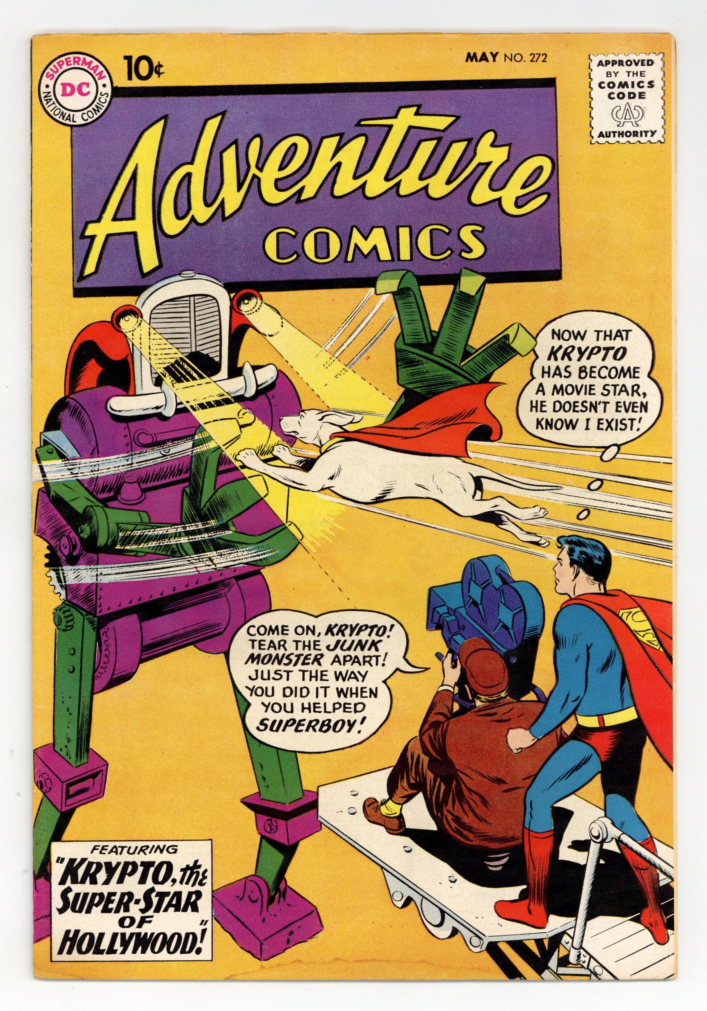 Starts Jan 19 Cover pencils by Curt Swan, inks by Stan Kaye. The Super-Star of Hollywood!, script by Jerry Siegel, art by George Papp; Krypto becomes swell headed after going to Hollywood to make a movie. The Strong Boy of the Jungle starring Congorilla, script by Robert Bernstein, art by Howard Sherman. The Human Flying Fish!, script by Robert Bernstein, art by Ramona Fradon; Dr. Krill, a skilled surgeon, operates on Bragg, turning him into a Human Flying Fish to pull robberies that Aquaman cannot stop. 36 pages, Full Color. Cover price $0.10.