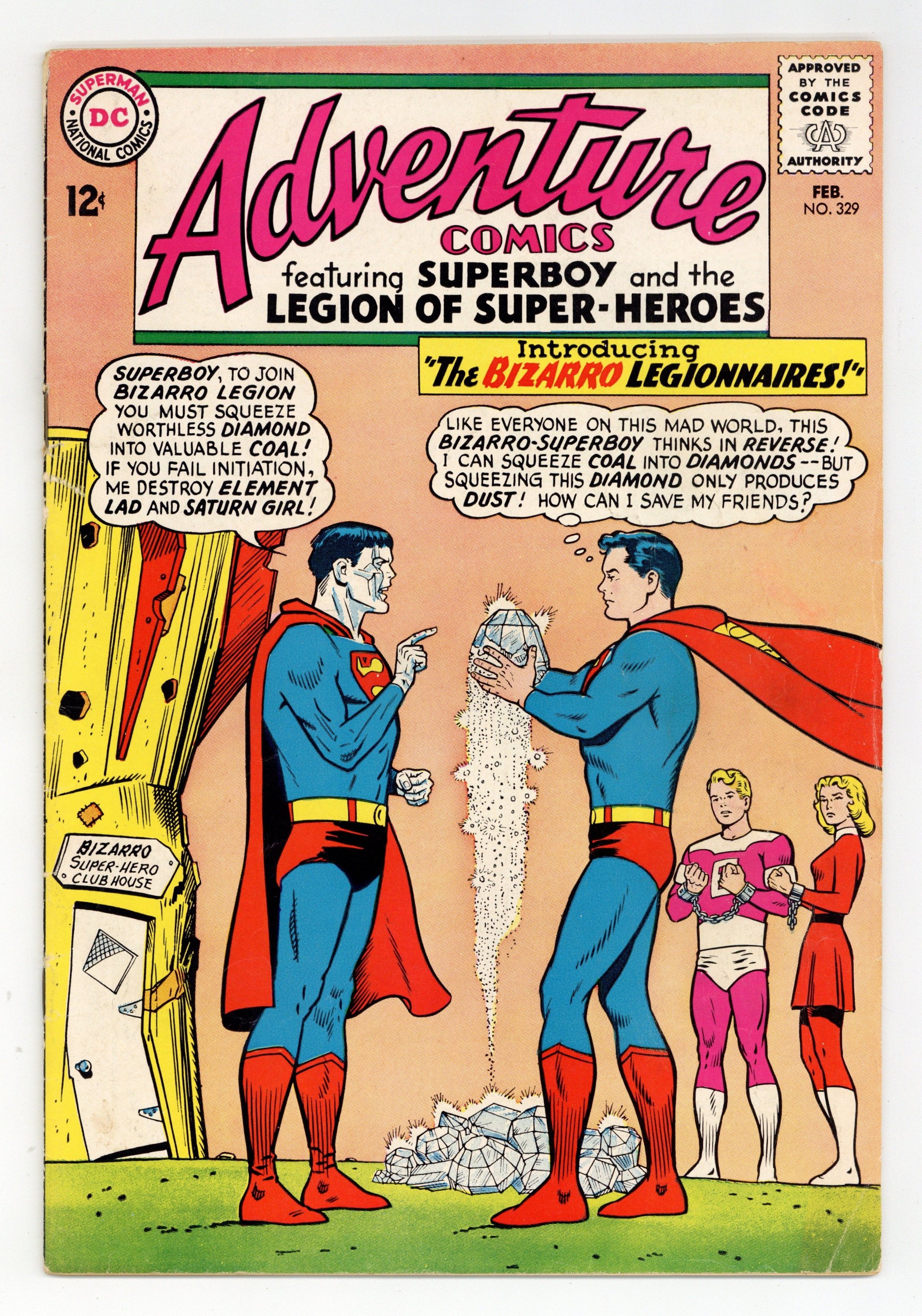 Starts Jan 19 Cover pencils by Curt Swan, inks by George Klein. The Super-Planet of Clark Kent and Lana Lang, art by George Papp; Lana and Clark are accidentally transported to a strange world where Clark must make her think they both have superpowers in order to prevent her from guessing he's Superboy. House ad for Superman Annual #5. Tales of the Legion of Super-Heroes series begins in The Face Behind the Lead Mask!, script by Jerry Siegel, pencils by John Forte, Al Plastino (page 4 and some Superboy and Luthor heads only), inks by John Forte and Al Plastino; At a regular meeting of the Legion of Super-Heroes, the Legionnaires lose control of their powers; Mon-el joins the Legion. 36 pages, Full Color. Cover price $0.12.