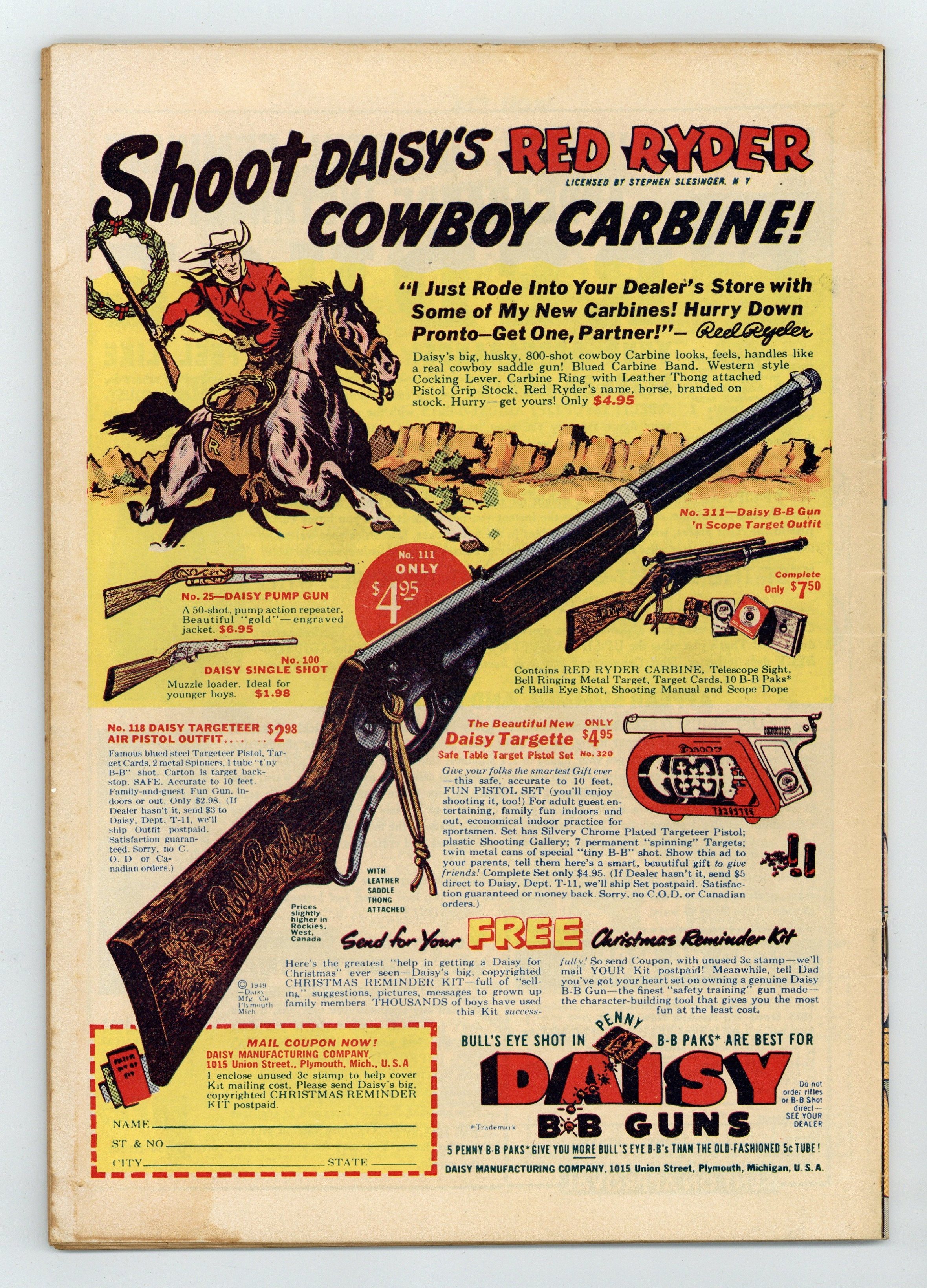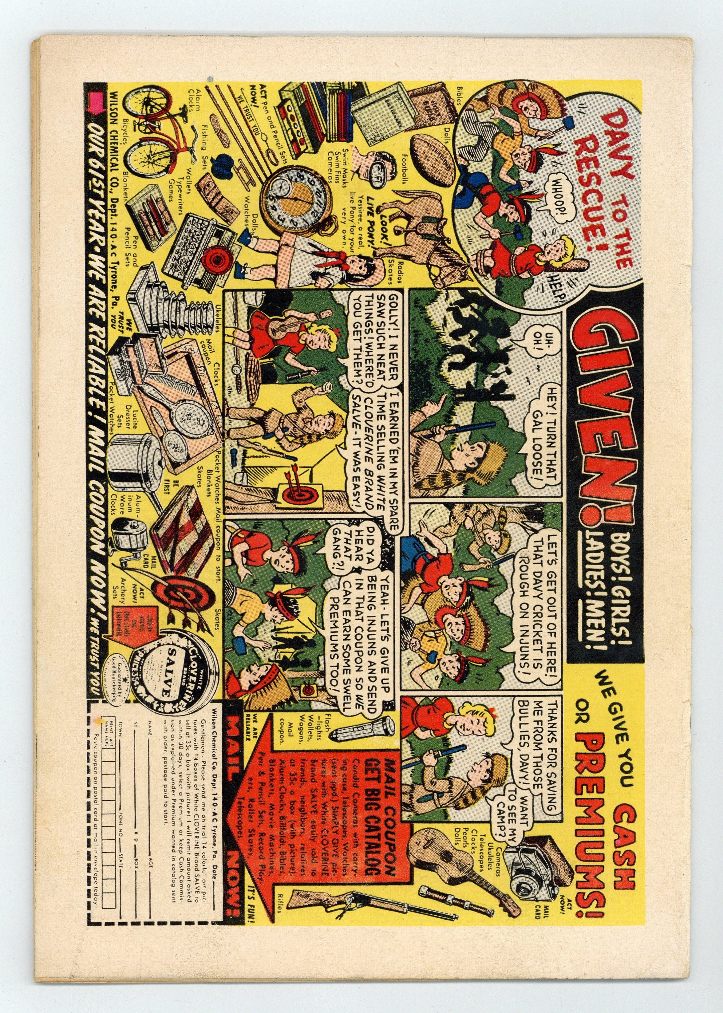 Starts Apr 4 Cover art by Al Fagaly. "Swing It, Mr. A", art by Bill Vigoda; Archie has Betty teach him how to play golf so he can take Veronica golfing; When Betty finds out, she tees off and hits Archie in the head with the golf ball. Untitled story, script and art by Bill Woggon; Katy invites Sis, four guys and a newspaper photographer to a picnic and forgets the food. "The Way to a Man's Heart!"; Betty, Veronica, and Lana decide to break the Campus Queen tie by seeing who has the most boy appeal and taking Jughead on a date. Suzie ad. "School Daze!" starring Li'l Jinx, script and art by Joe Edwards. Untitled story, script and art by Bill Woggon; When Willie is attacked by a bear Nevada Jones kills it and adopts its orphaned cub; When Nevada's dog, Chip, is attacked by a mountain lion, Nevada kills the mountain lion. Hollywood Gossip article. "Bull's Eye," art by Samm Schwartz; Betty, Veronica and Archie get caught in a love triangle involving archery. 52 pgs., full color. Cover price $0.10.