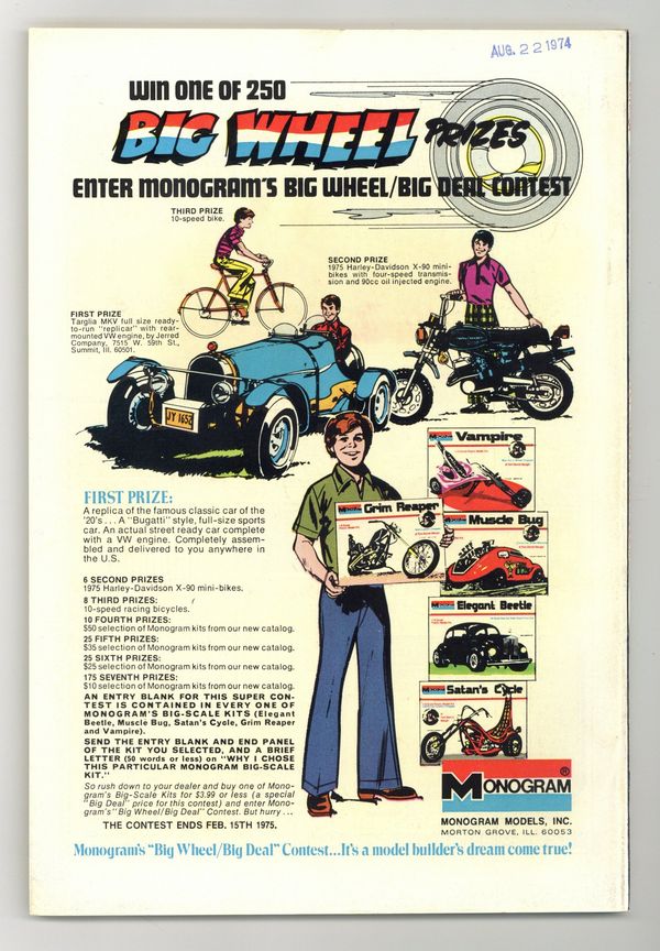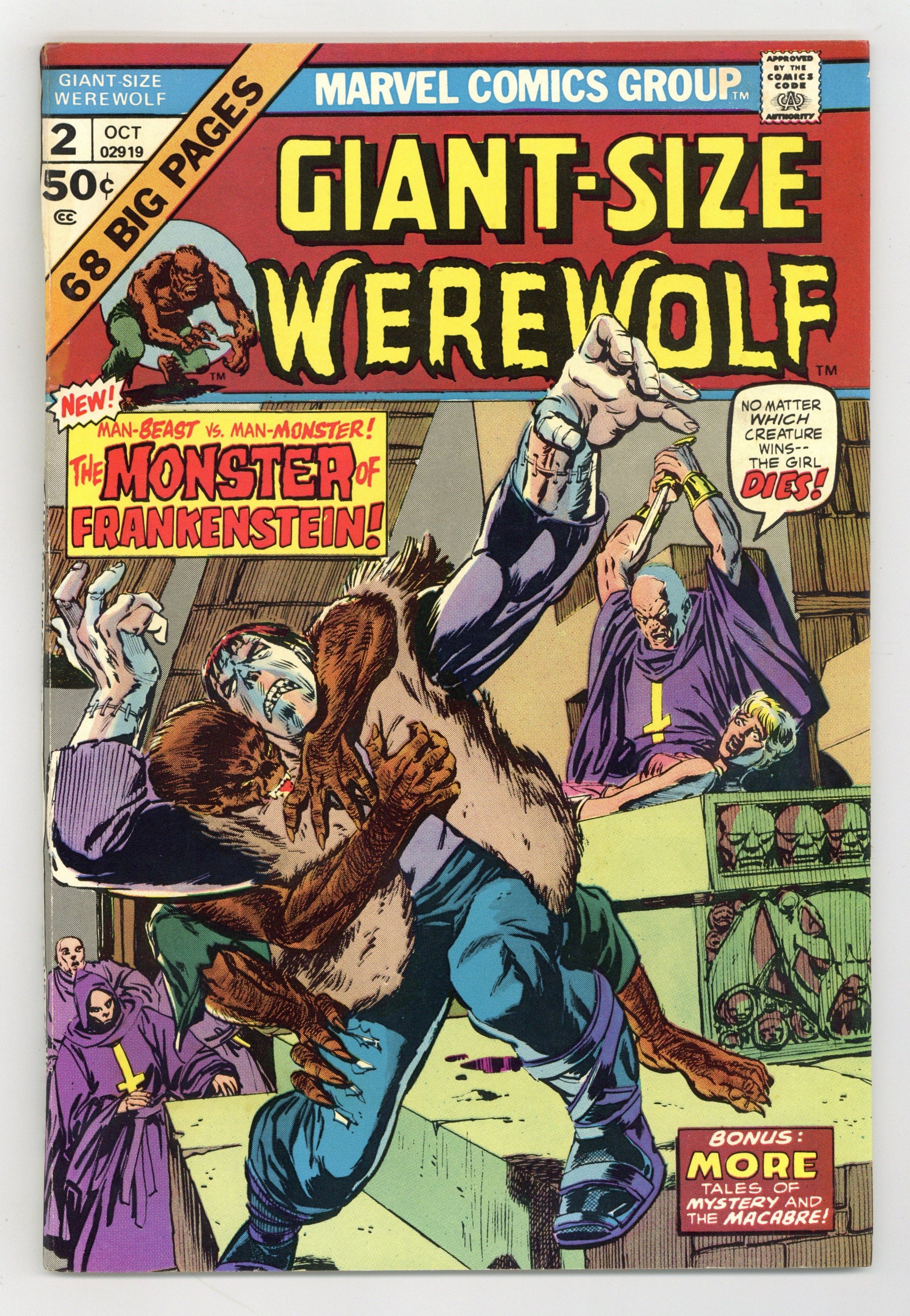 Starts Feb 23 Cover pencils by Gil Kane and John Romita (alterations), inks by Tom Palmer and John Romita (alterations). "The Frankenstein Monster Meets Werewolf By Night," script by Doug Moench, pencils by Don Perlin, inks by Vince Colletta; The Frankenstein Monster travels to California to see if Danton Vayla can help him; At the same time, the Brotherhood of Baal, run by Vayla, kidnaps Lissa Russell and plans to sacrifice her in a magical ritual; Jack Russell, while searching for his sister, changes into the Werewolf by Night and attacks the Frankenstein Monster. "Mind Over Matter" (reprinted from Adventures Into Weird Worlds #16), pencils by Bill Benulis, inks by Jack Abel; A man has been trained by Indian mystics to be able to make objects disappear, merely by doubting their existence; When he tries to tell his friend of his new powers, the friend is skeptical until he sees a demonstration. "The Ape Man" (reprinted from Strange Tales #85), art by Steve Ditko; A prisoner plans to escape, and hopes that the legend of an ape man in the jungle around his prison will deter pursuit. "The Barefoot Man" (reprinted from Uncanny Tales #29), art by Robert Q. Sale; Pablo, a poor Mexican, longs for a pair of boots to ease the pains in his bare feet; He finally resorts to mugging a man, and stealing his boots. "The Werewolf of Wilmach!" (reprinted from Astonishing #17), art by Tony DiPreta; Several deaths have a village in a panic over the werewolf prowling the moon-lit streets; Two ne'er-do-wells plan a robbery while the town is gripped in fear. NOTE: For #1 see Giant-Size Creature (1974). 68 pgs., full color. Cover price $0.50.