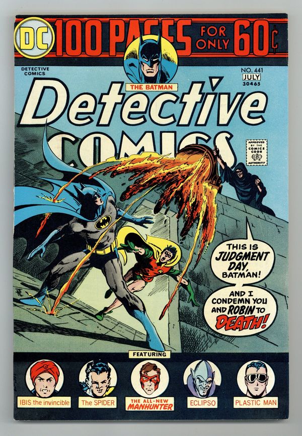 Starts Mar 2 Cover by Jim Aparo. New Batman story, "Judgement Day!" (script by Archie Goodwin, art by Howard Chaykin). New Manhunter story, "Cathedral Perilous" (chapter 5; script by Archie Goodwin, art by Walt Simonson). 1945 Plastic Man untitled reprint. Two 1940's Batman reprints, "The Case of the Prophetic Pictures" (from Detective 42) and "The Carbon Copy Crimes!" (from Batman 38). Ibis the Invincible Golden Age reprint, "Holocause, God of Destruction!" (from Whiz 95; art by Kurt Schaffenberger). Eclipso reprint, "The Two Faces of Doom" (from House of Secrets 66; art by Alex Toth). Alias the Spider 1942 untitled reprint (from Crack Comics 25; art by Paul Gustavson). Sal Amendola contents page illustration. 100 pgs. Cover price $0.60.