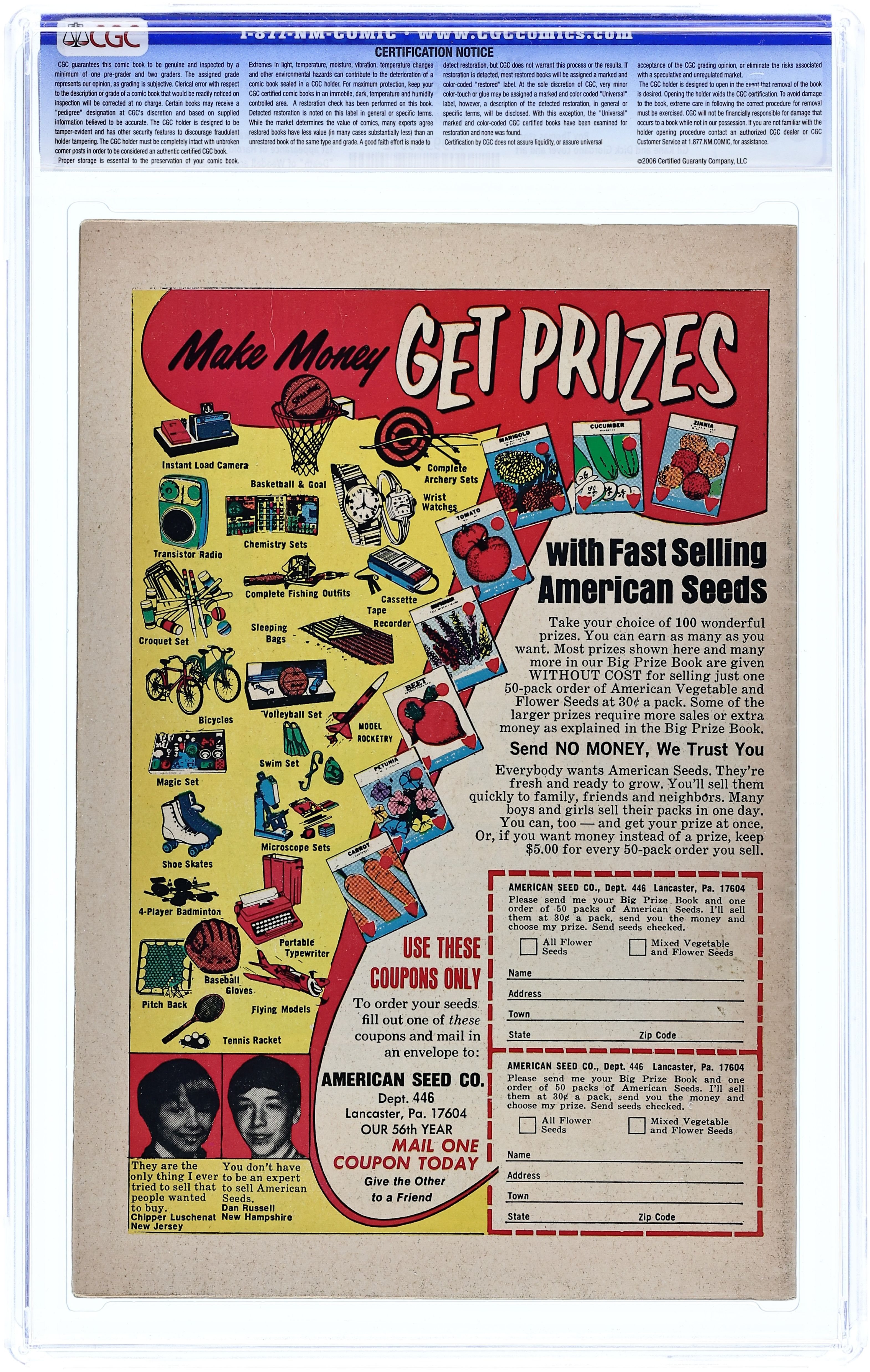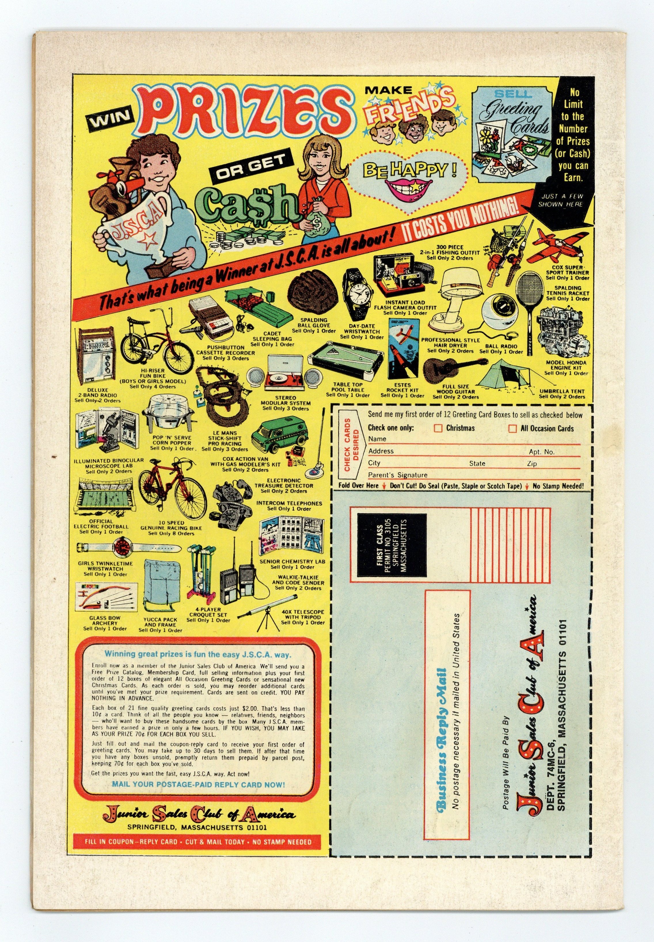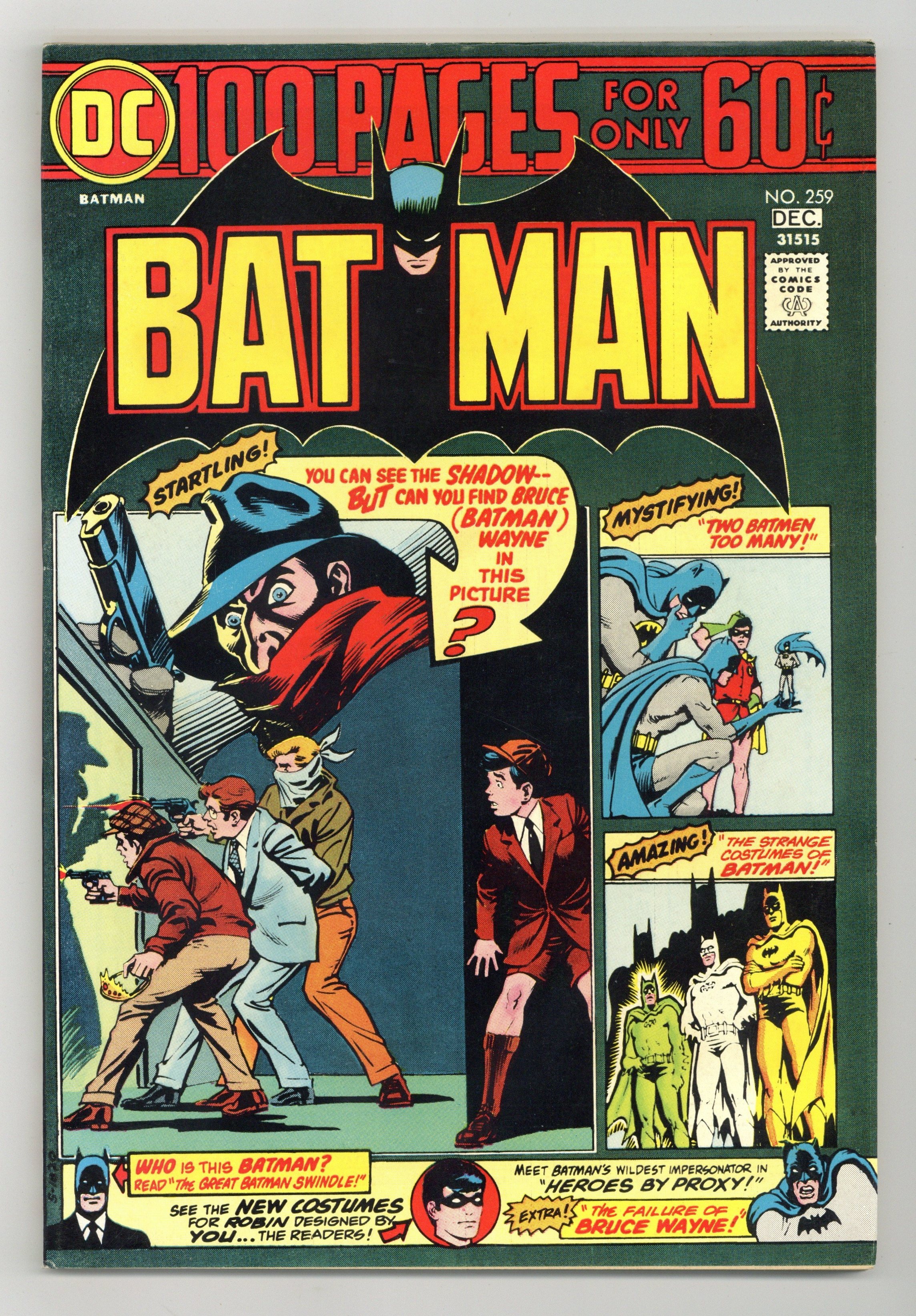 100-page giant. Cover art by Nick Cardy. Batman and the Shadow team-up in this issue in a new story titled "Night of the Shadow!", script by Denny O'Neil, pencils by Irv Novick, inks by Dick Giordano); Batman goes on the trail of a convicted felon from the past, believing that he has stolen a valuable tiara. But he's wrong and discovers that only "The Shadow Knows" who actually is responsible. "The Great Batman Swindle!" (reprinted from Detective Comics #222), script by Bill Finger, pencils by Dick Sprang, inks by Charles Paris; Wealthy yachtsman Ned Judson is called to a mysterious castle once built by an eccentric millionaire, and comes face-to-face with the Brotherhood of Batmen; The leader, Batman Number One, convinces Judson that the figure of Batman is actually four people. "The Strange Costumes of Batman!" (from Detective Comics #165), script by Edmond Hamilton, pencils by Dick Sprang (as Bob Kane), inks by Charles Paris; While making an inspection of equipment in the Bat-Cave, Bruce and Dick also must inspect the various costumes Batman and Robin use in their fight against crime for leaks and tears, and, as it turns out, a never before used costume saves the day for the Batman, who has been seriously wounded. New costumes for Robin drawn by readers of the strip. "Heroes by Proxy!" (from Batman #29), script by Don Cameron, art by Dick Sprang (as Bob Kane); Two private detectives are down in the dumps because they are flat broke, even though they have great detective abilities; When they hear that the Wayne Mansion has been robbed, they decide to change their tactics and investigate, disguised as Batman and Robin! "Two Batmen Too Many!" (from Batman #177), script by Bill Finger, pencils by Sheldon Moldoff (as Bob Kane), inks by Joe Giella; Batman concocts a scheme against numbers racketeer Ed Garvey to prove conclusively that the crook planned and carried out the Kimber Gem job. "The Failure of Bruce Wayne" (from Batman #120), script by Bill Finger, pencils by Sheldon Moldoff, inks by Charles Paris; Called to his dying Uncle's bedside, Silas, Bruce is told by him that he is disappointed that Bruce has not continued the family tradition of adventure; Bruce sets out to prove Silas wrong. 100 Pages, Full Color. Cover price $0.60.