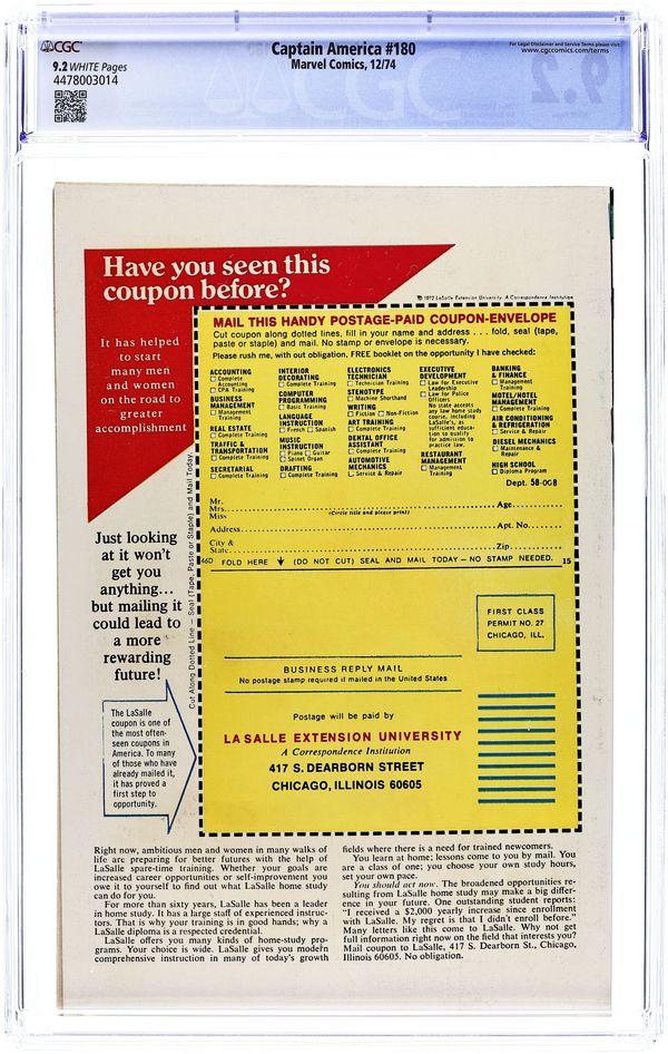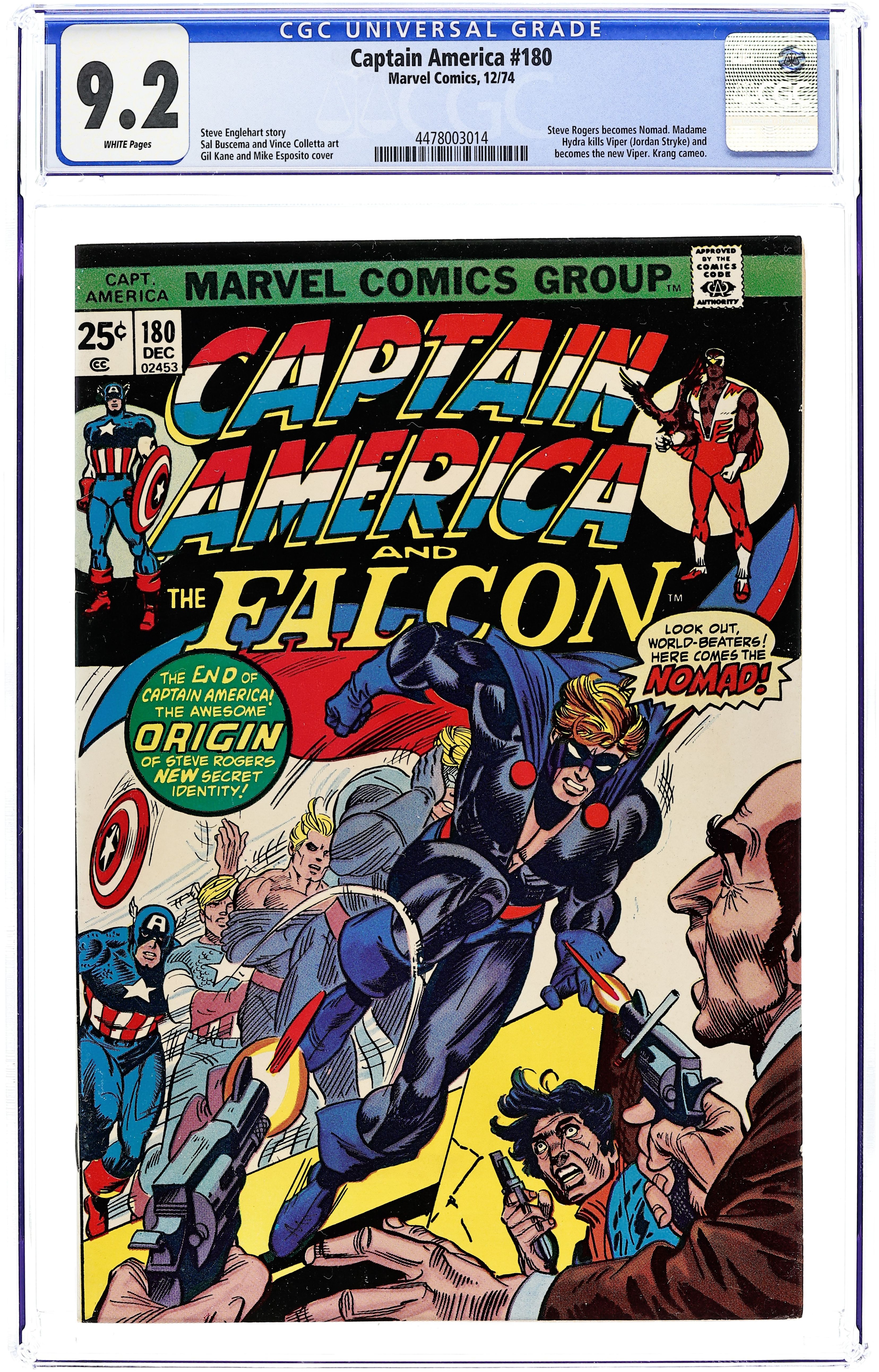 Tags: Marvel Legacy Numbering: Captain America (part 180), Captain AmericaCaptain America (1968 1st Series) 180 CGC 9.2